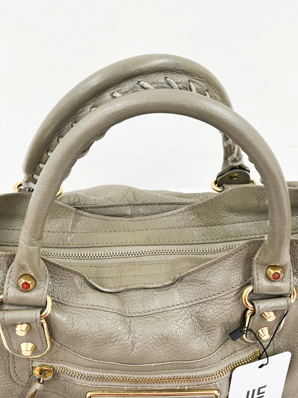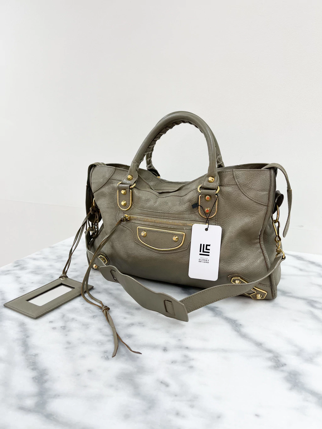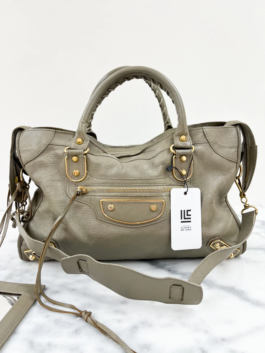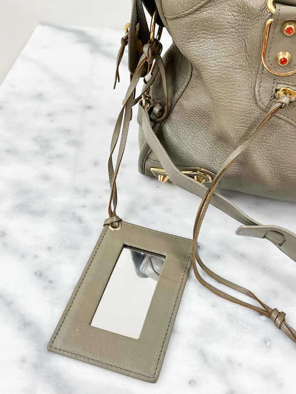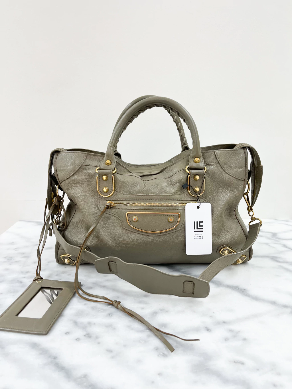 Exterior: Bolsa Balenciaga Motocross City Bag de couro na cor cinza, aplicações de studs, espelho removível e ferragens douradas - Possui alça de mão, alça média removível e fechamento por zíper.