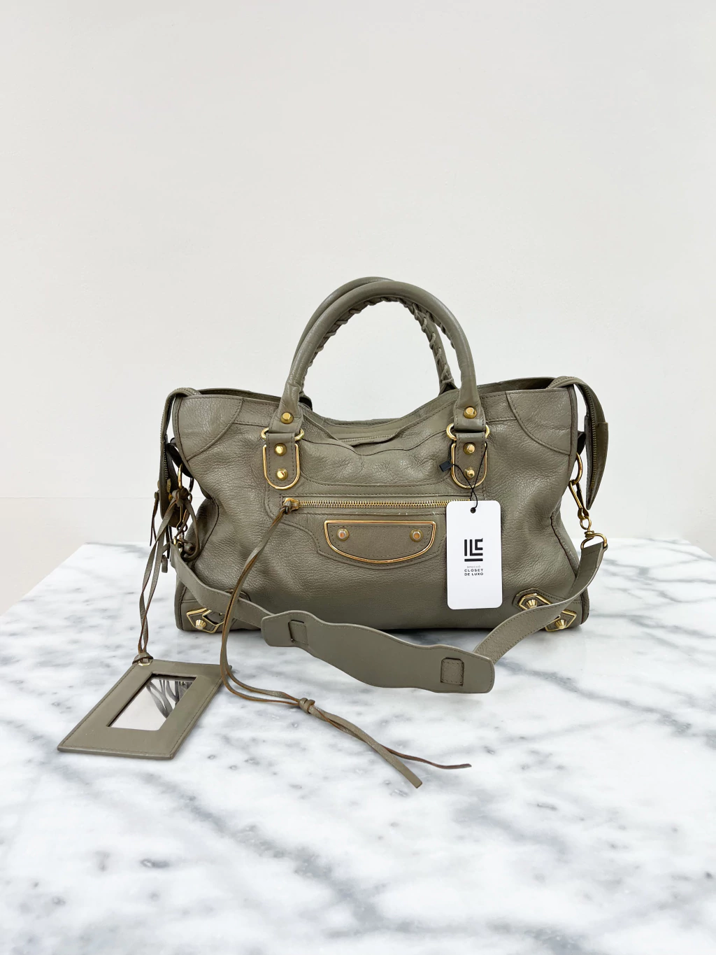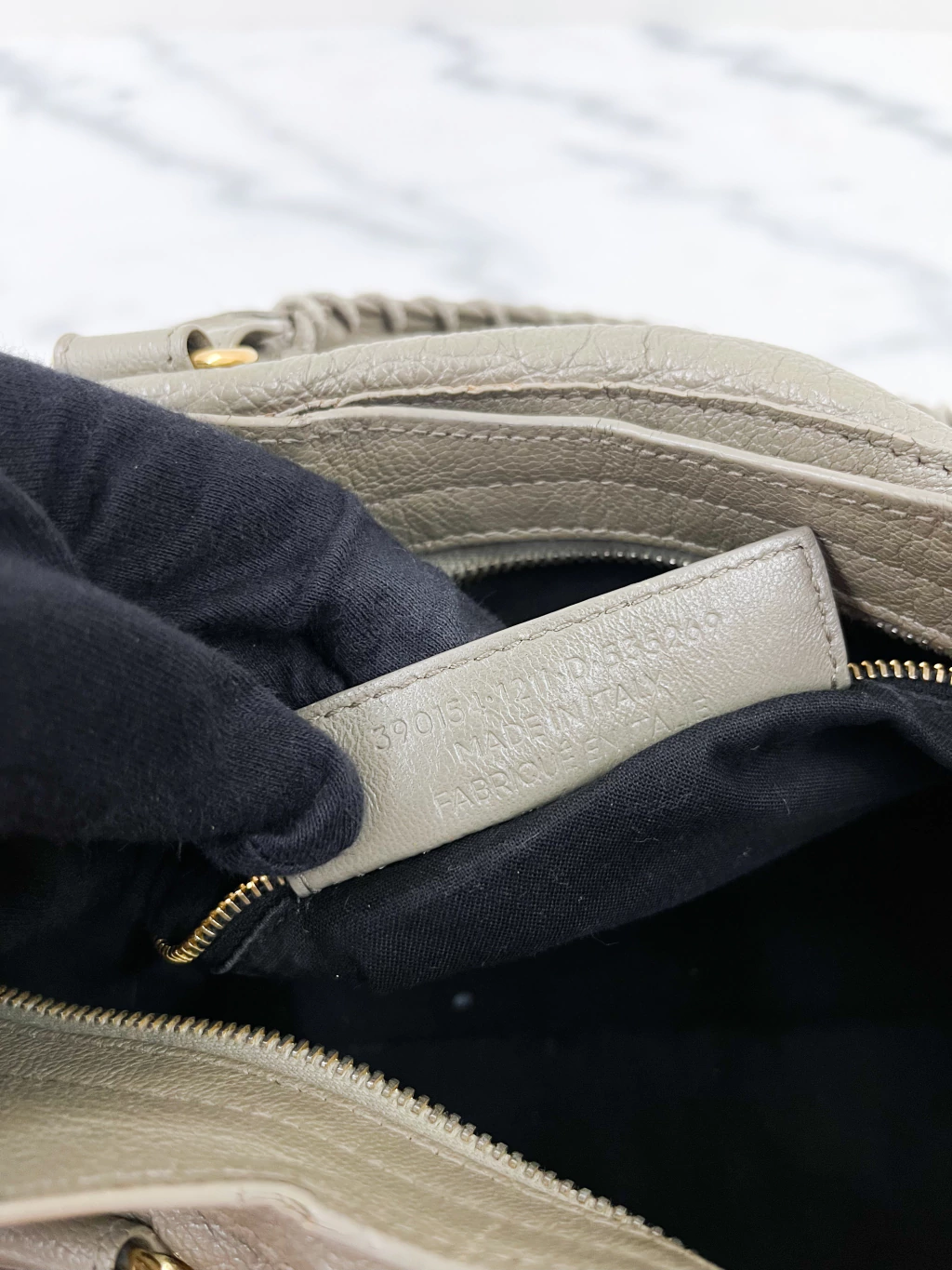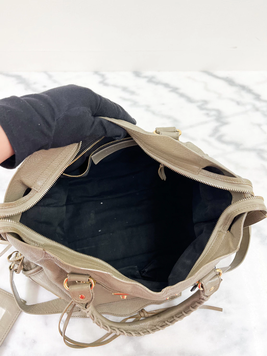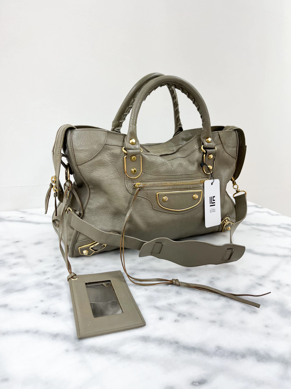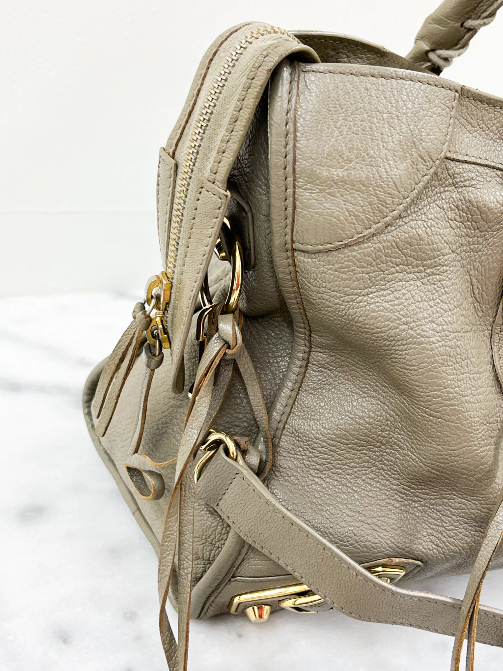Exterior: Bolsa Balenciaga Motocross City Bag de couro na cor cinza, aplicações de studs, espelho removível e ferragens douradas - Possui alça de mão, alça média removível e fechamento por zíper.