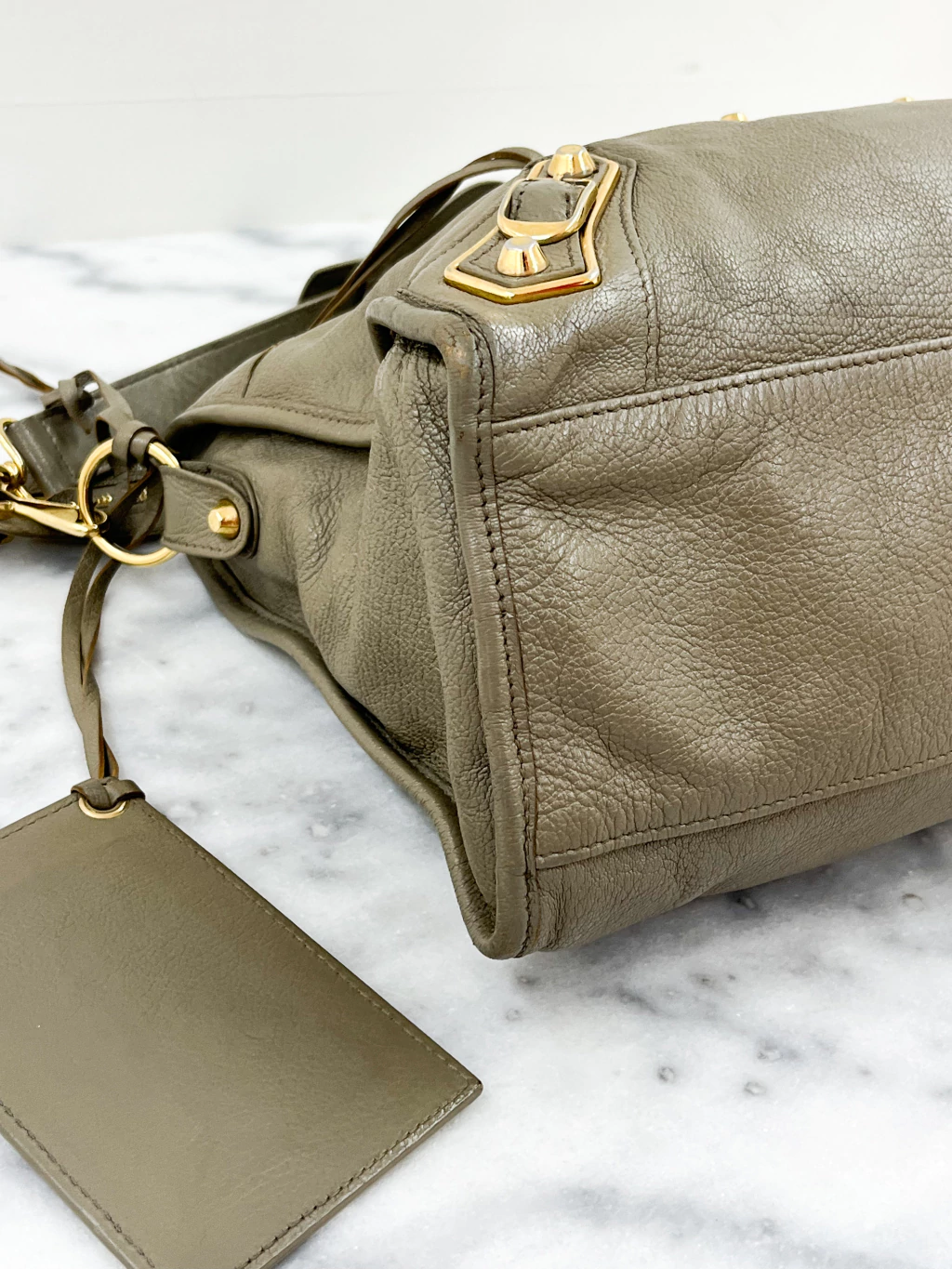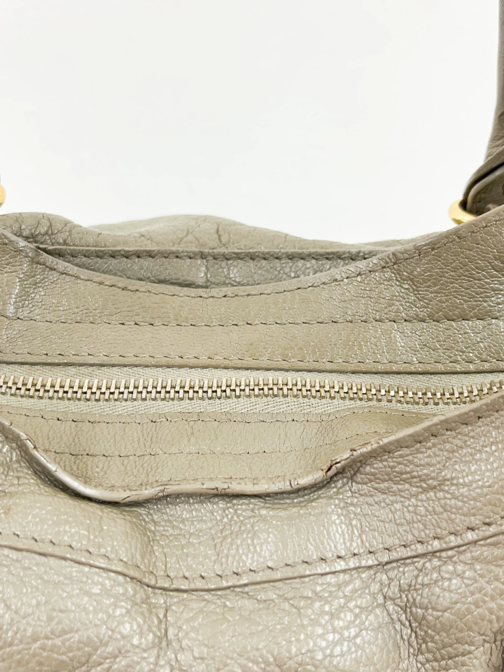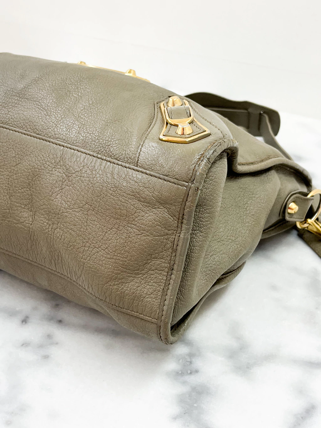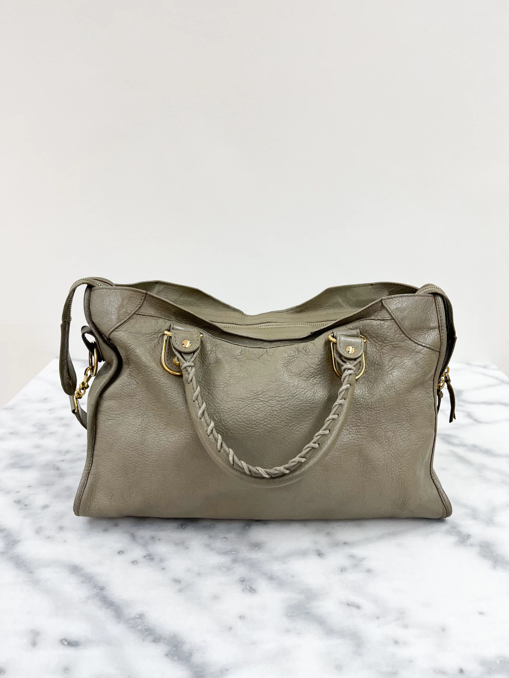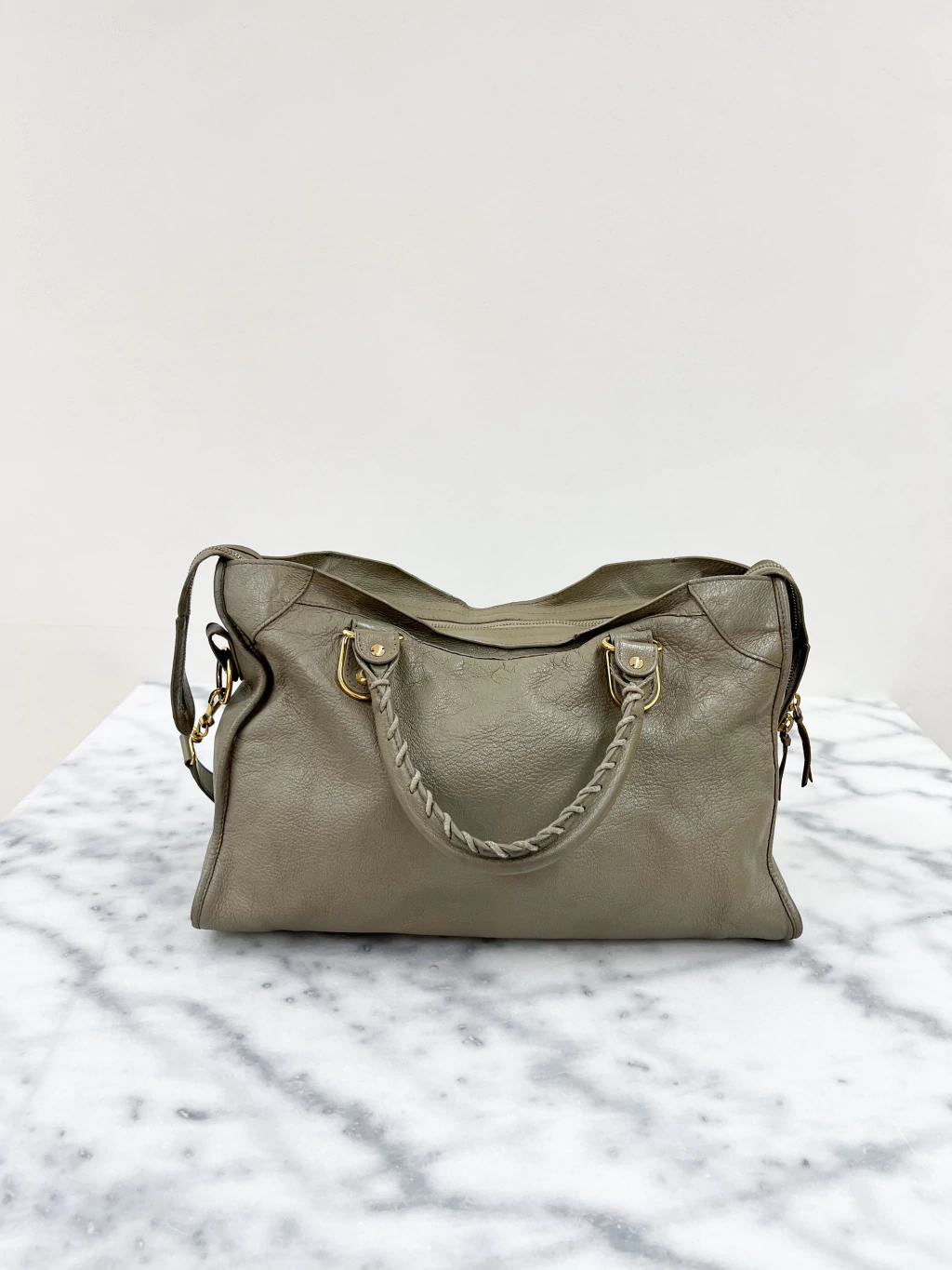Exterior: Bolsa Balenciaga Motocross City Bag de couro na cor cinza, aplicações de studs, espelho removível e ferragens douradas - Possui alça de mão, alça média removível e fechamento por zíper.