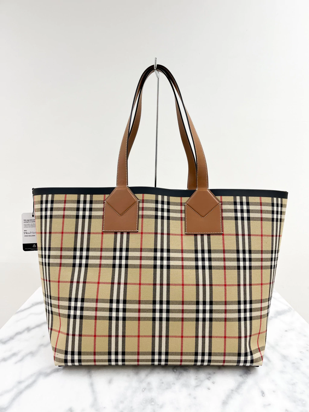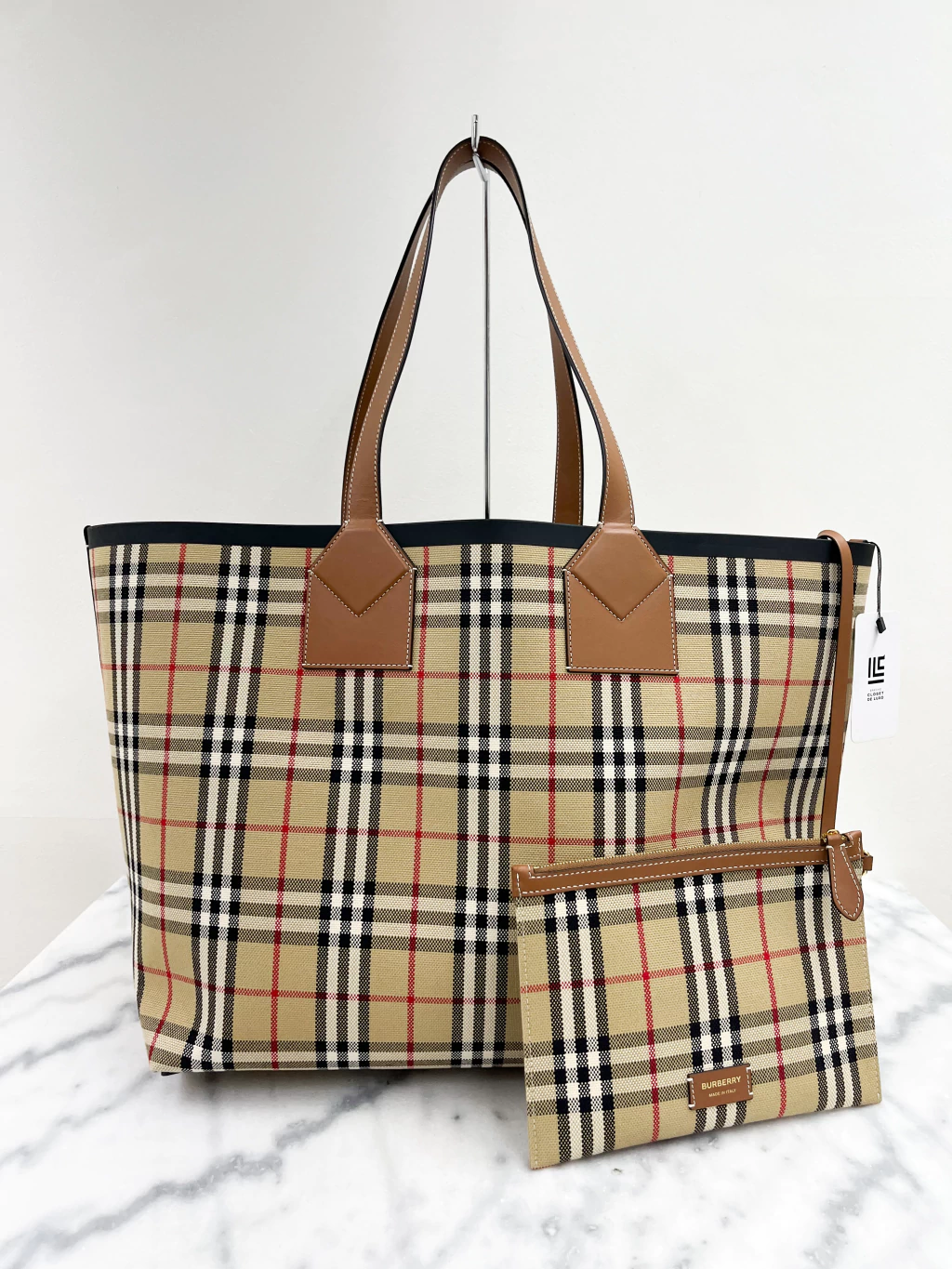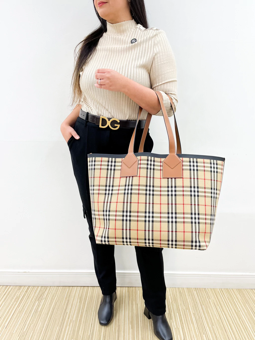 Exterior: Bolsa Burberry Briar London Tote Large de tecido bege com estampa xadrez, detalhes em couro marrom caramelo e ferragens douradas - Possui alça de mão/ombro e não possui fechamento (modelo tote).