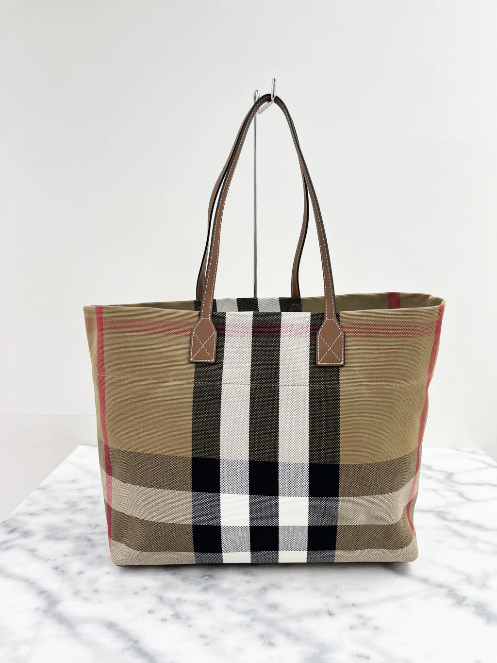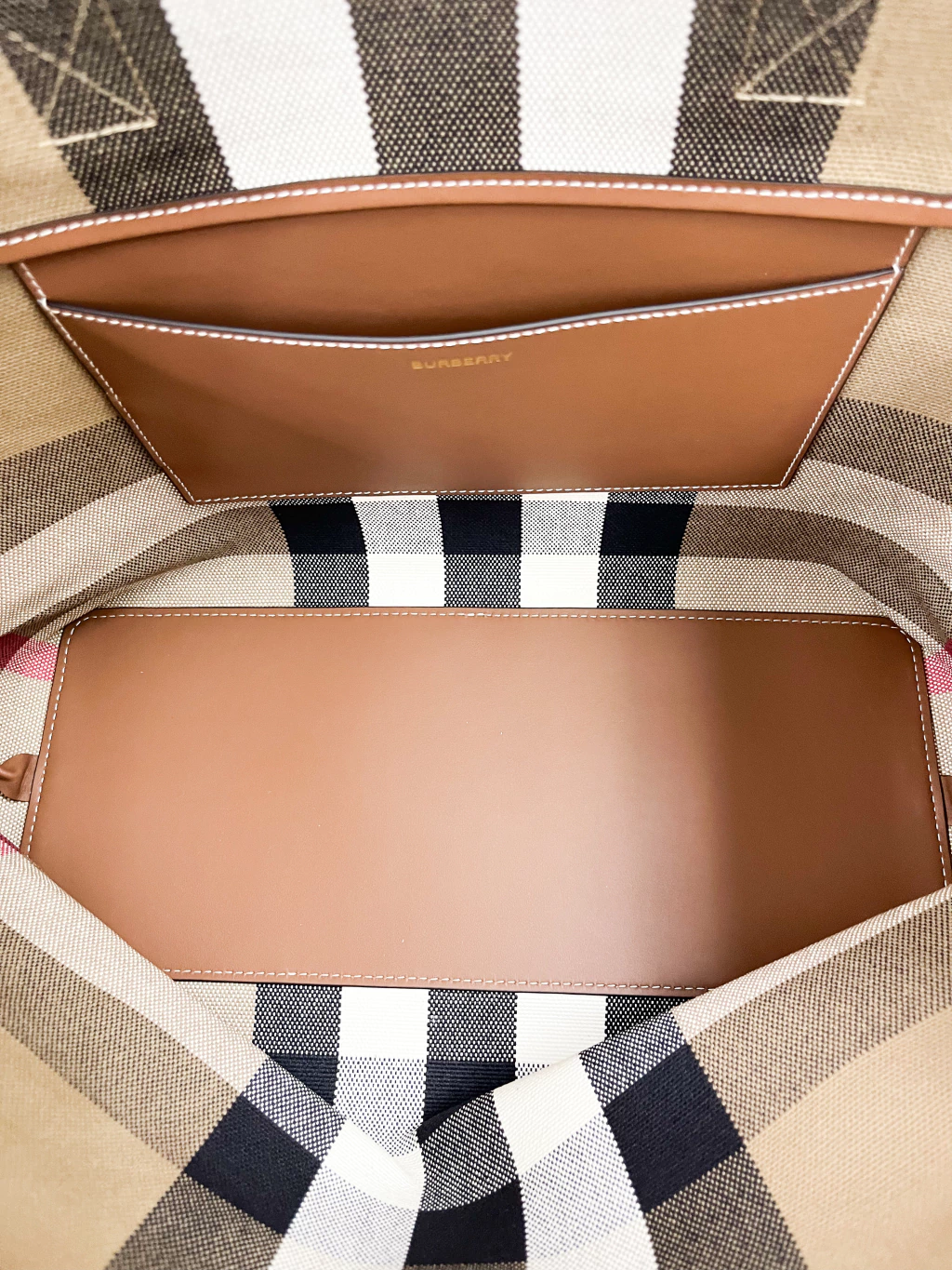Exterior: Bolsa Burberry London Tote Taupe IP de tecido jacquard bege com estampa xadrez e detalhes em couro marrom - Possui alça de mão/ombro e não possui fechamento (modelo tote).