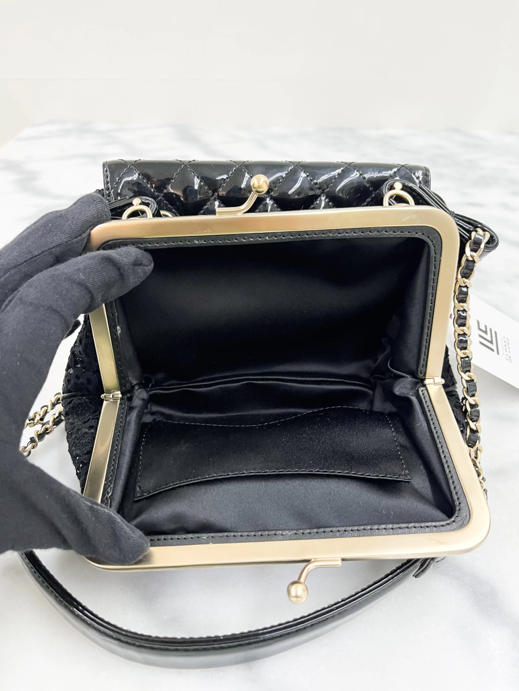 Exterior: Bolsa Chanel Mini Kiss Lock Double Bag composta por 2 bolsas acopladas, sendo a primeira em couro envernizado preto, logo frontal, ferragens champagne e fechamento por botão magnético. A segunda em tecido de renda preto, ferragens champagne e fechamento por boca de lobo - Possui alça fixa de ombro para ambas as peças.