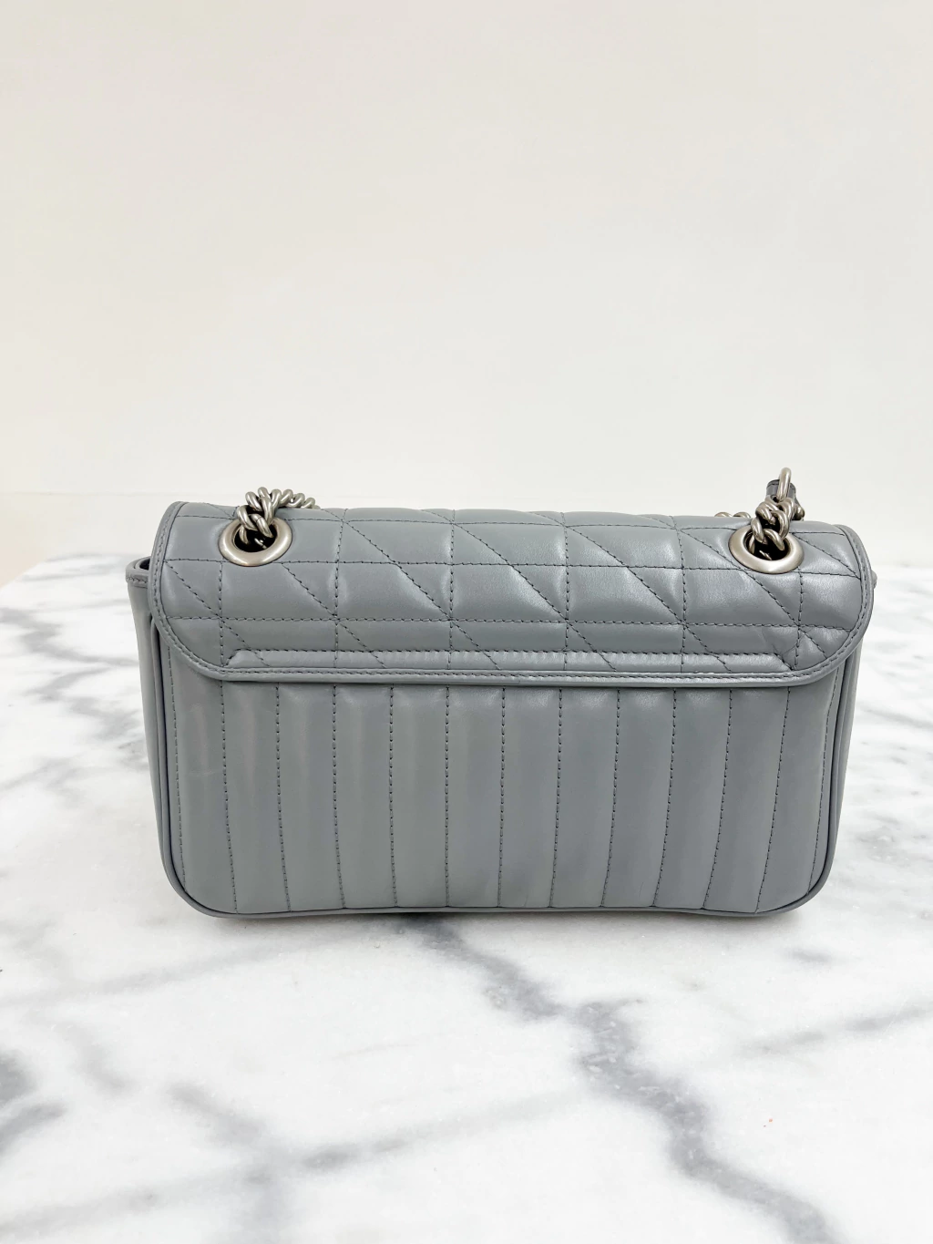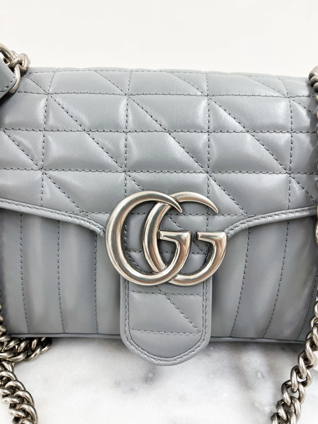 Exterior: Bolsa Gucci GG Marmont Small de couro na cor cinza, logo frontal e ferragens prateadas - Possui alça de correntes ajustável (pode ser usada no ombro ou crossbody) e fechamento por fivela de encaixe.