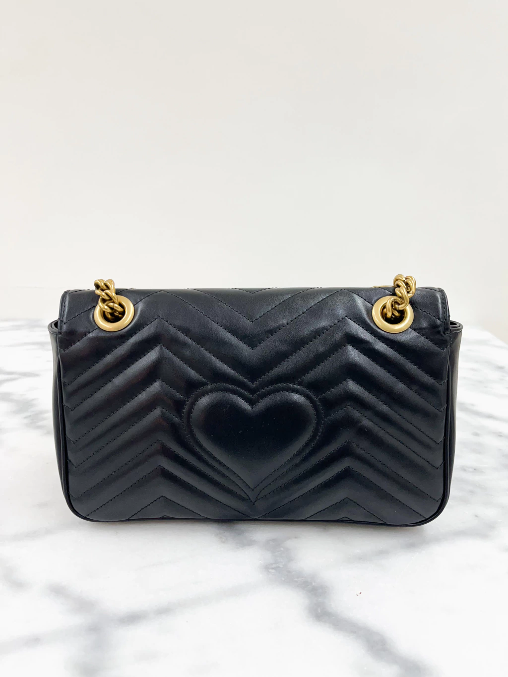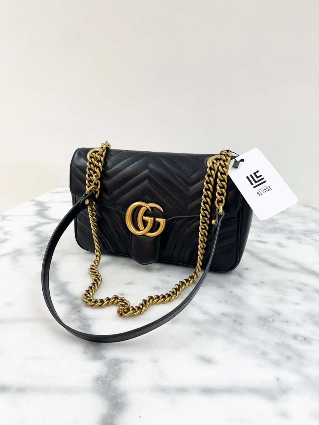 Exterior: Bolsa Gucci GG Marmont Small de couro na cor preta, logo frontal e ferragens douradas - Possui alça alça de correntes ajustável (pode ser usada no ombro ou crossbody) e fechamento por fivela de encaixe.