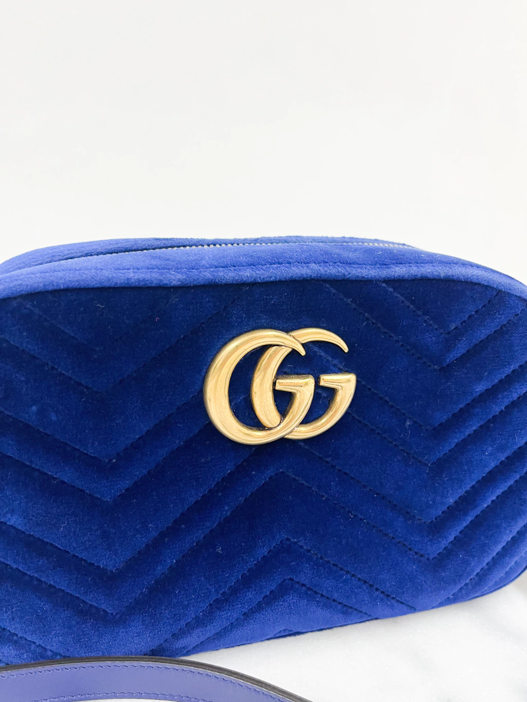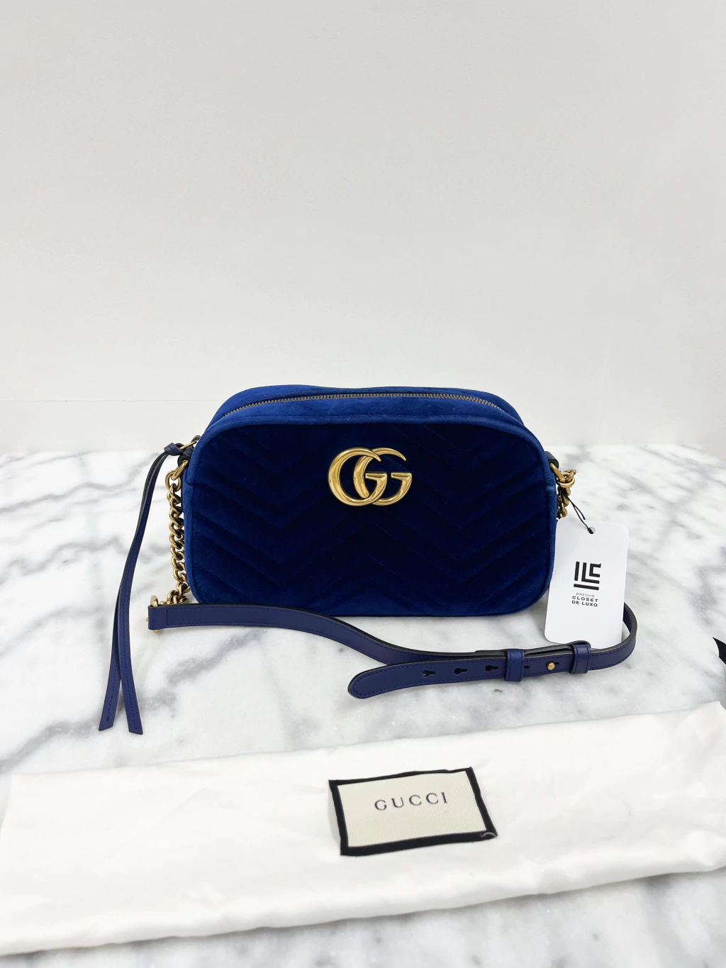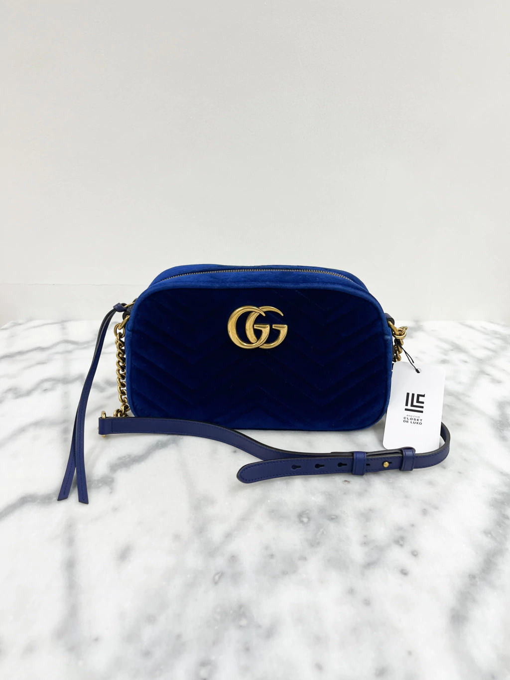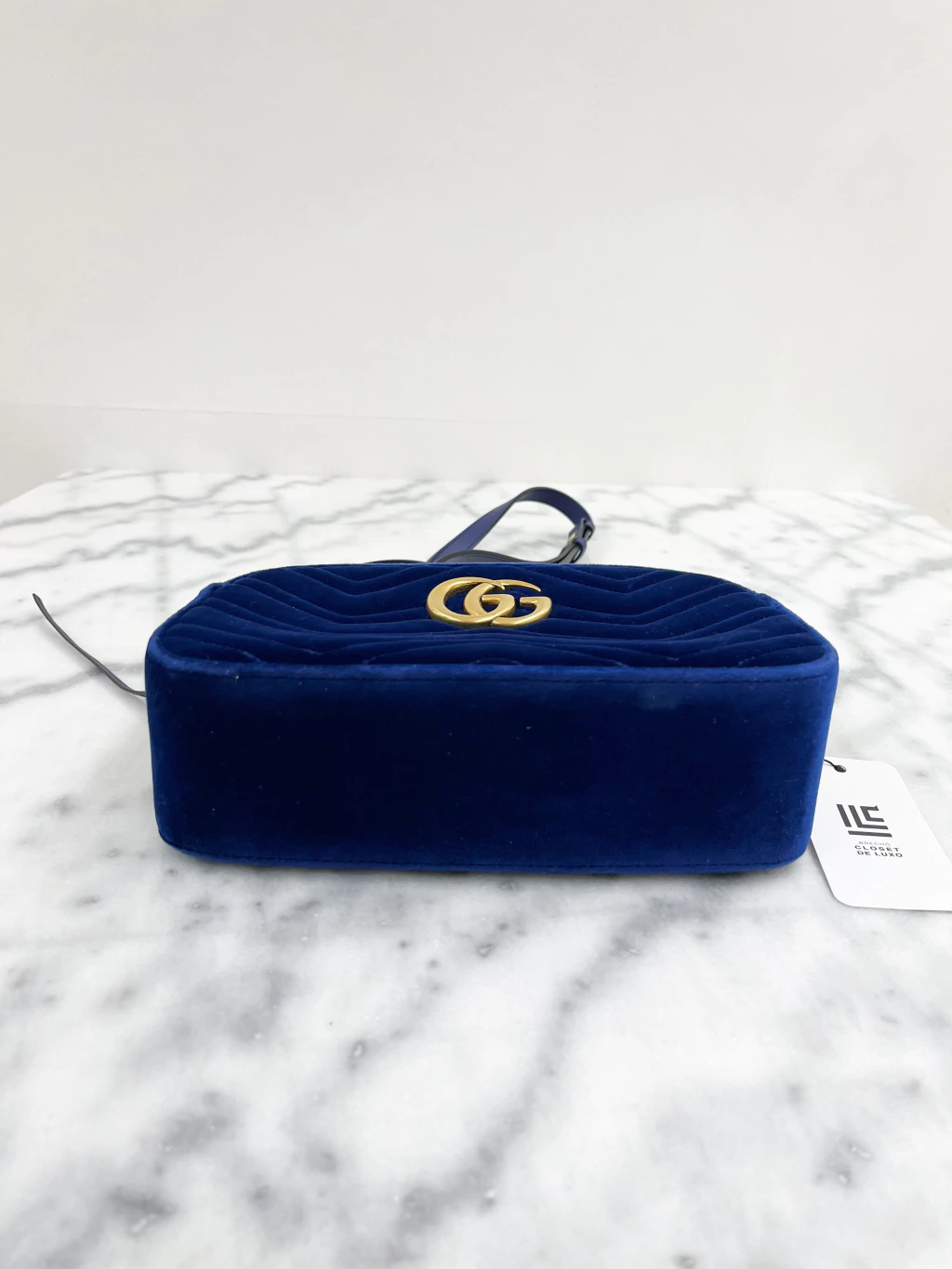 Exterior: Bolsa Gucci GG Marmont Small Velvet de veludo na cor azul, couro na cor azul, logo frontal e ferragens douradas - Possui alça longa crossbody e fechamento por zíper.