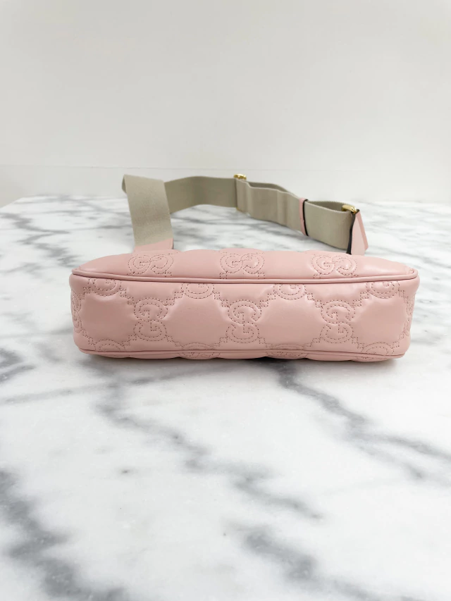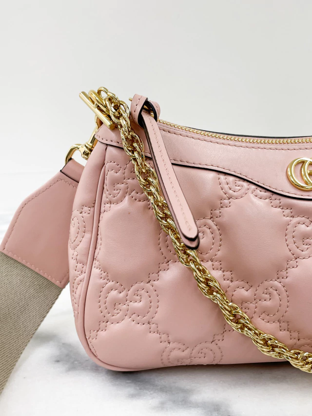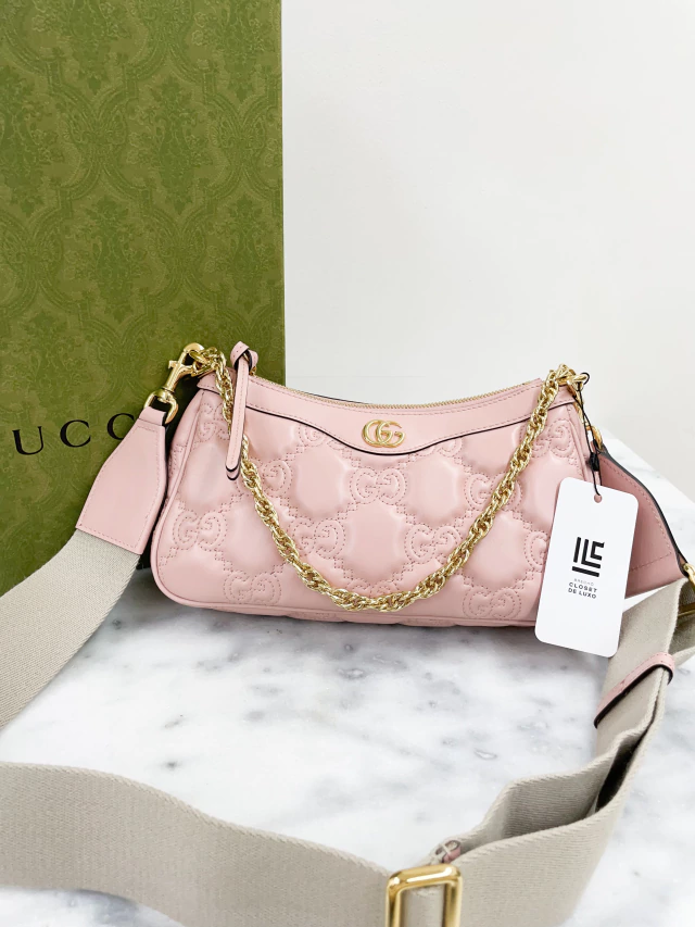 Exterior: Bolsa Gucci GG Quilted 2Way Strap de couro na cor rosa com estampa monograma em baixo relevo, logo frontal e ferragens champagne (dourado clarinho) - Possui alça em corrente de mão/ombro, alça longa crossbody e fechamento por zíper.