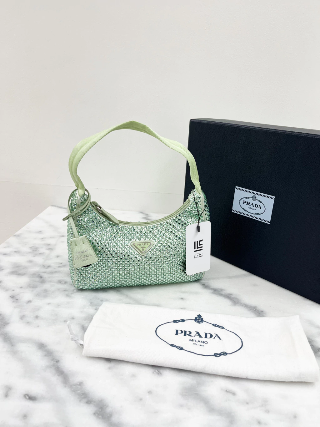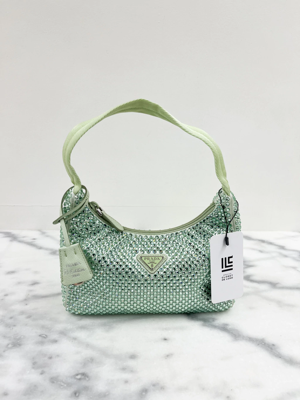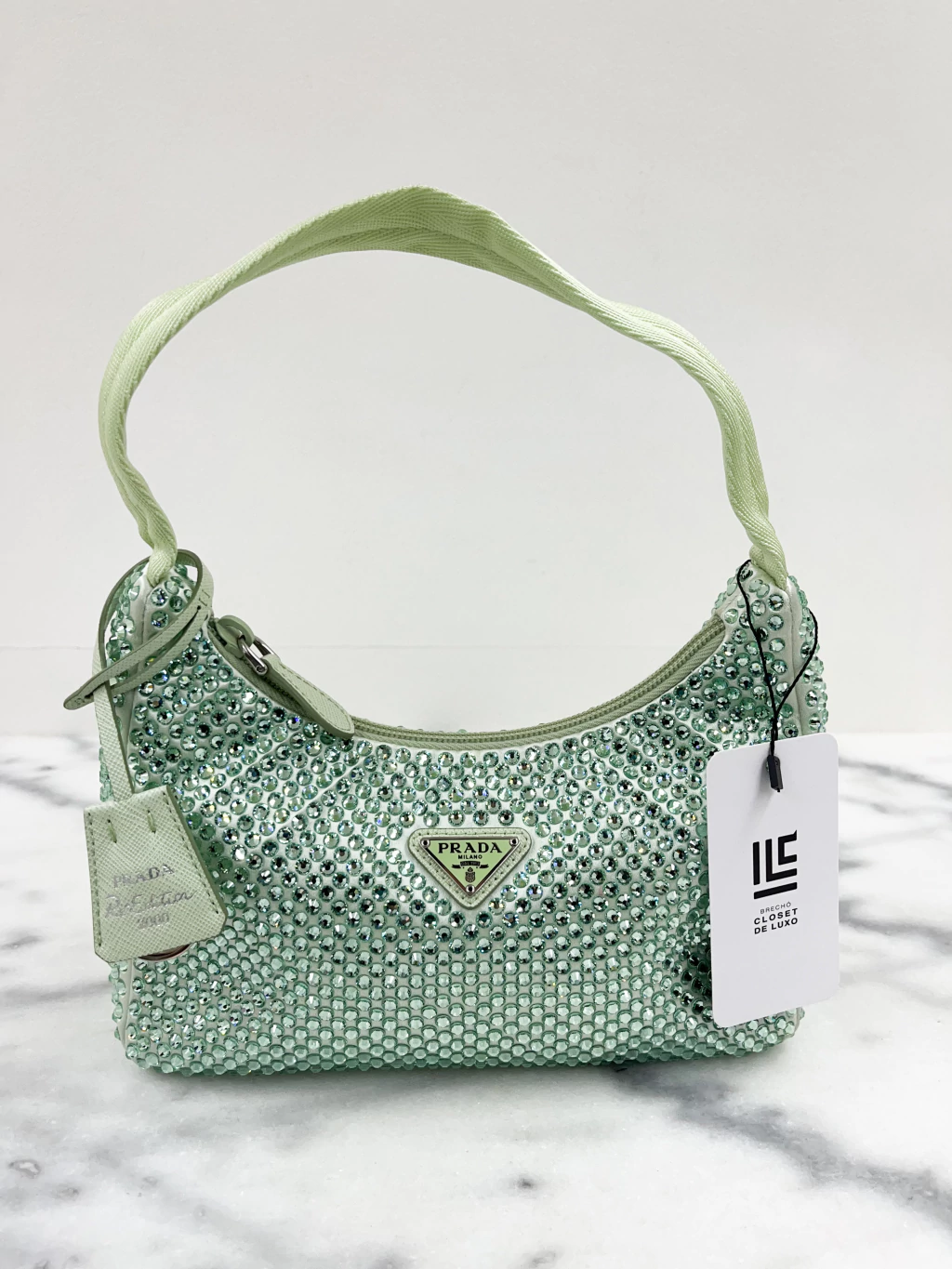Exterior: Bolsa Prada Re-Edition 2000 Crystals de tecido acetinado verde claro com aplicações de cristais por toda a peça, tag removível, logo frontal e ferragens prateadas - Possui alça de mão/ombro e fechamento por zíper.