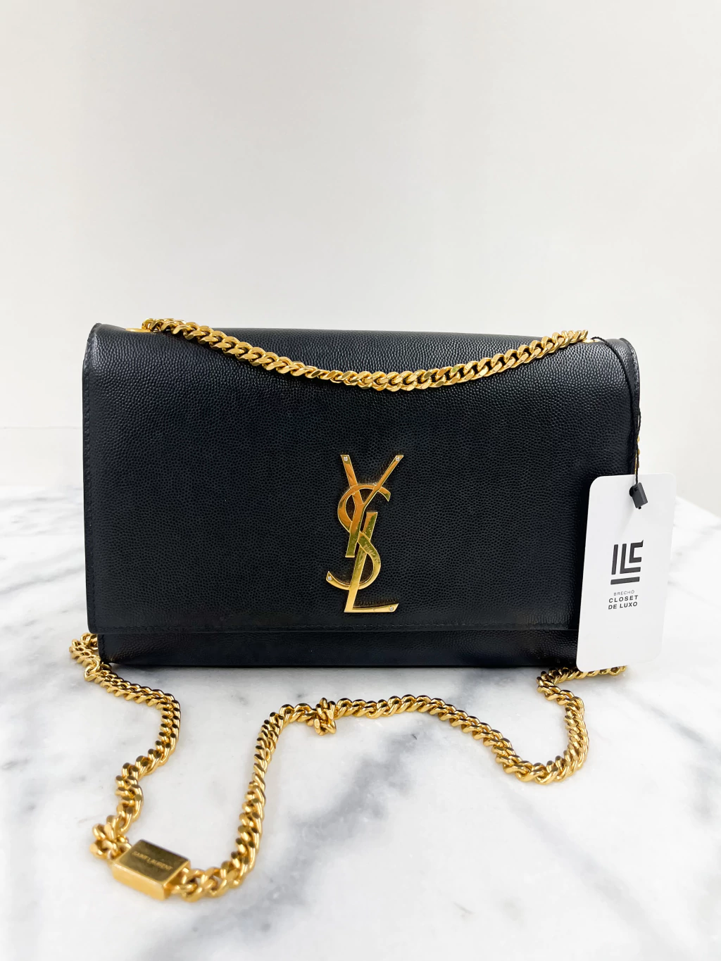Exterior: Bolsa Saint Laurent Kate Medium de couro caviar preto, logo frontal e ferragens douradas - Possui alça ajustável de correntes e fechamento por aba flap com botão magnético.