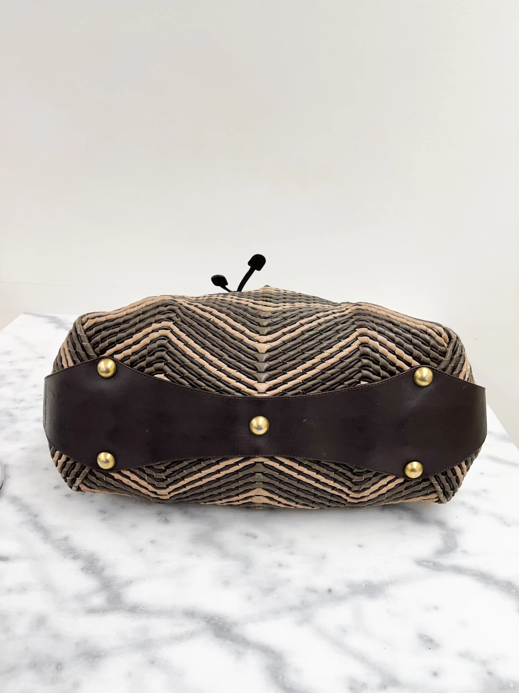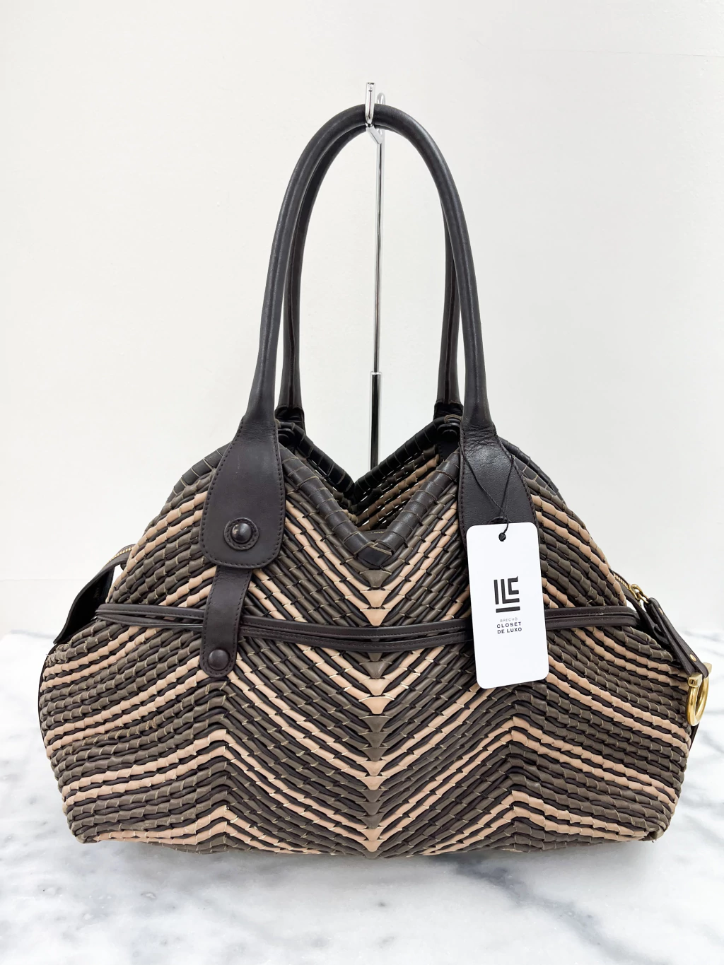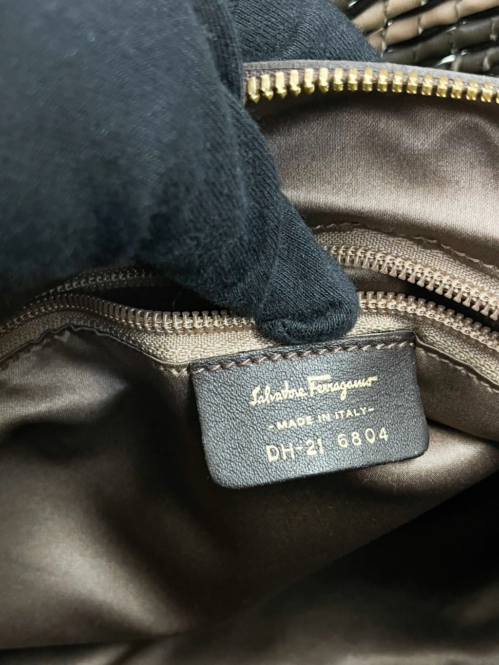 Exterior: Bolsa Salvatore Ferragamo Woven de couro marrom e bege, logo lateral e ferragens douradas - Possui alça de mão/ombro e fechamento por zíper.