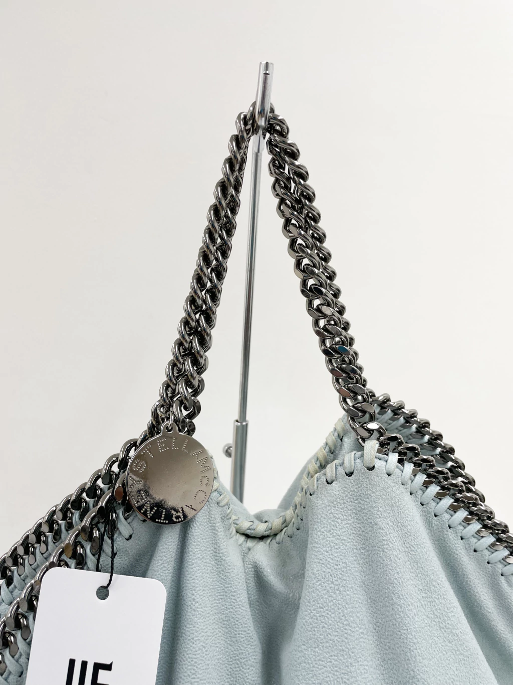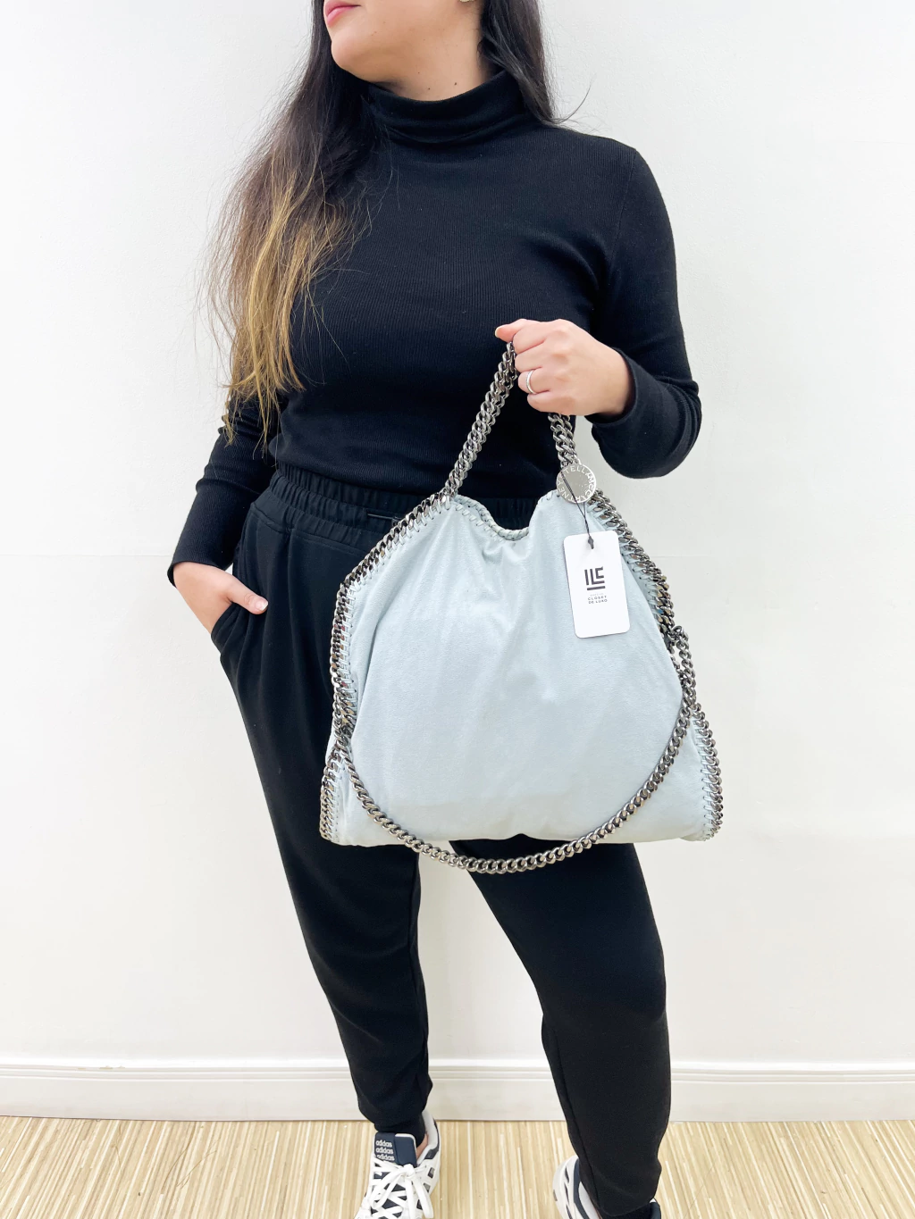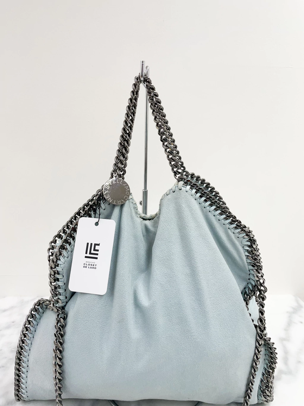 Exterior: Bolsa Stella McCartney Fallabela de couro na cor azul claro, pingente com logo frontal e ferragens prateadas - Possui alça de mão e alça de ombro de correntes e fechamento por botão magnético.