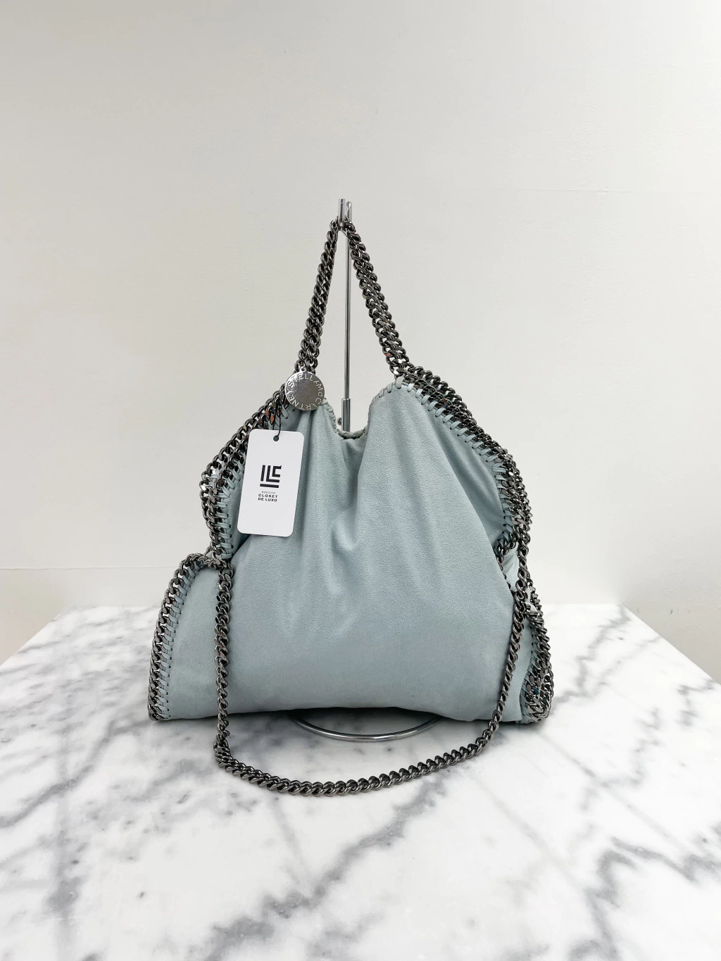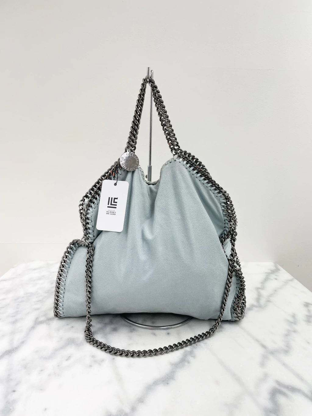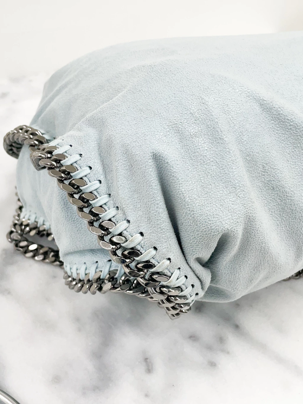 Exterior: Bolsa Stella McCartney Fallabela de couro na cor azul claro, pingente com logo frontal e ferragens prateadas - Possui alça de mão e alça de ombro de correntes e fechamento por botão magnético.