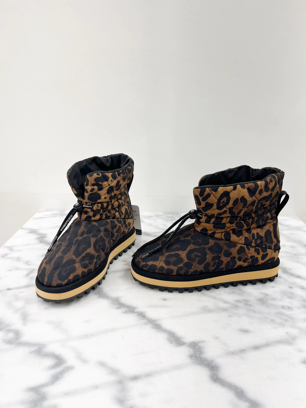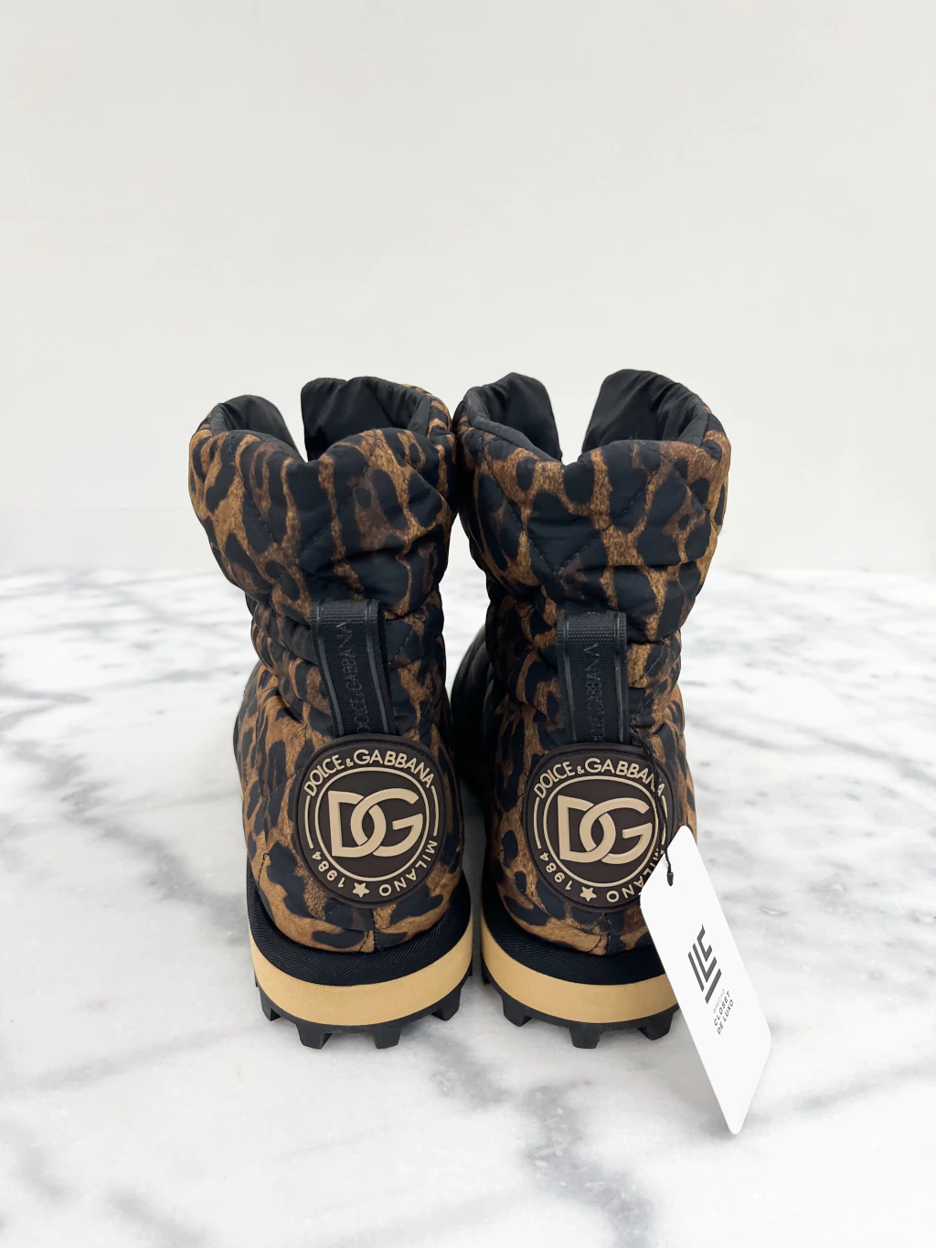 Bota Dolce&Gabbana de tecido com estampa de leopardo, ajuste por cordão, logo na parte de trás e entressola bege e preta.