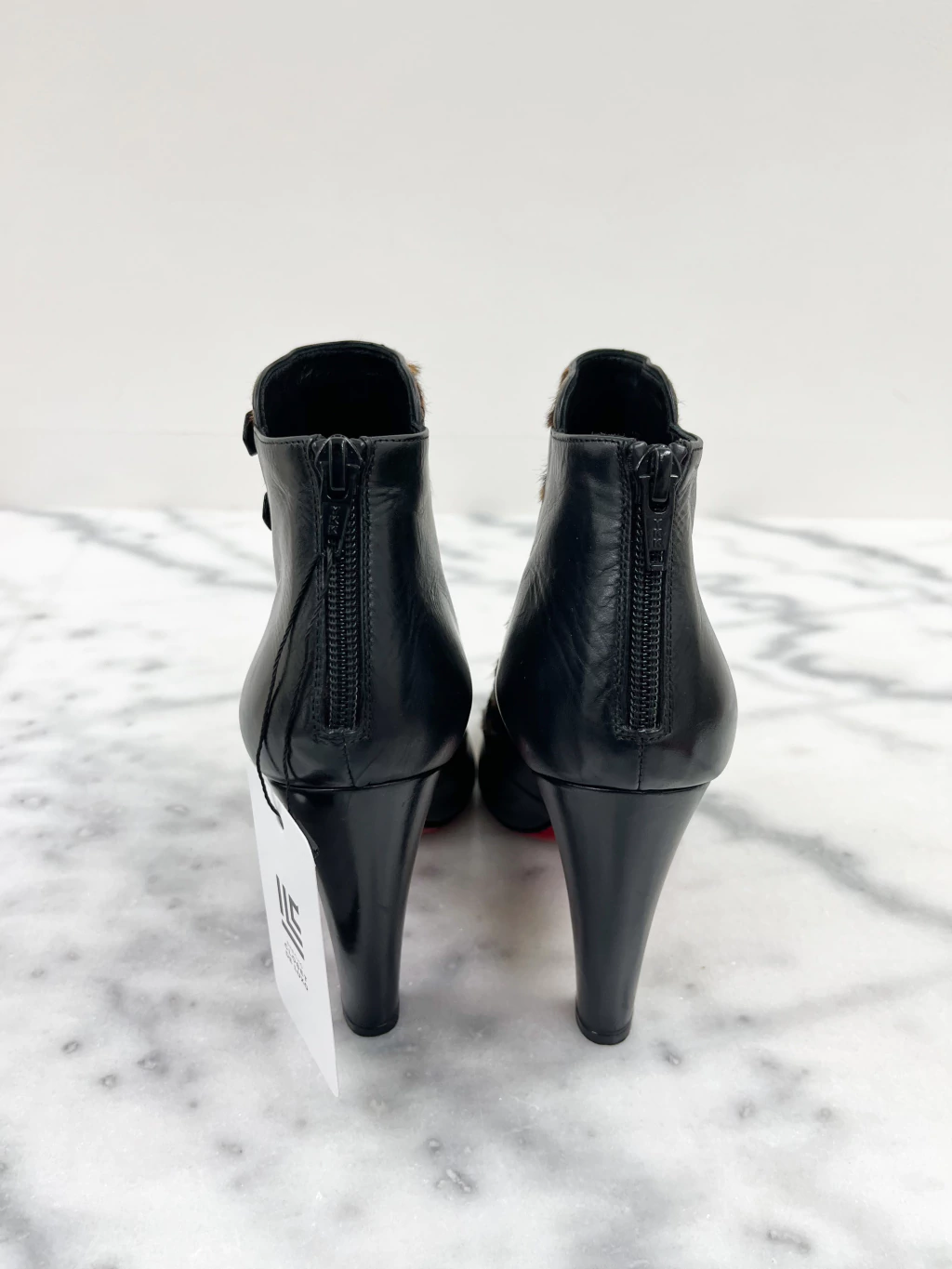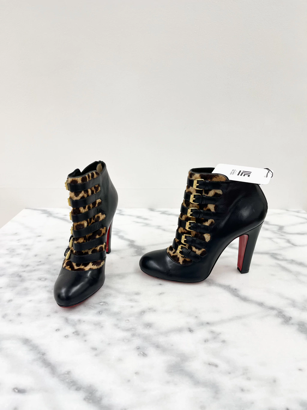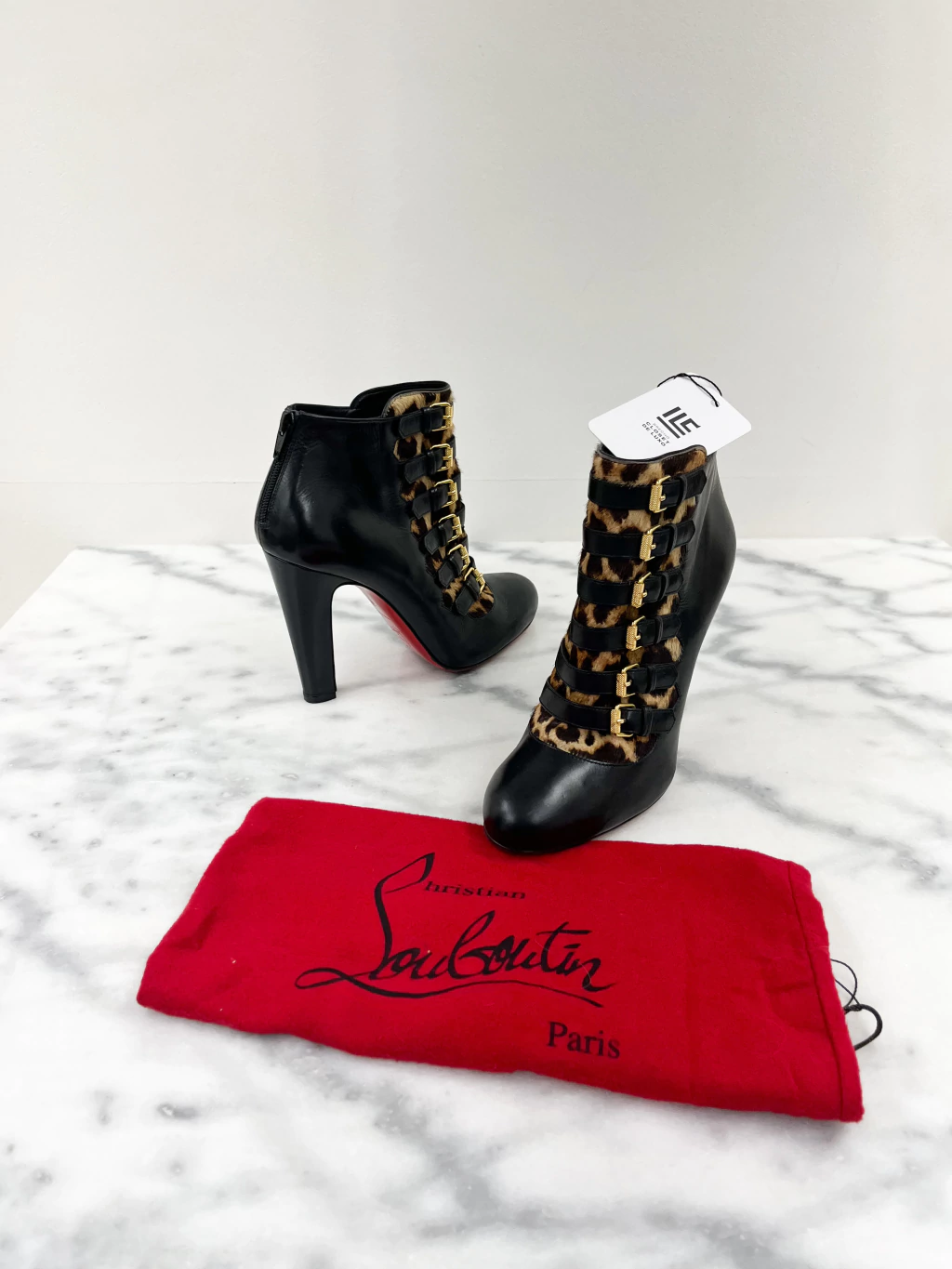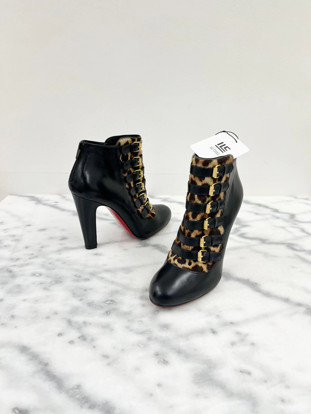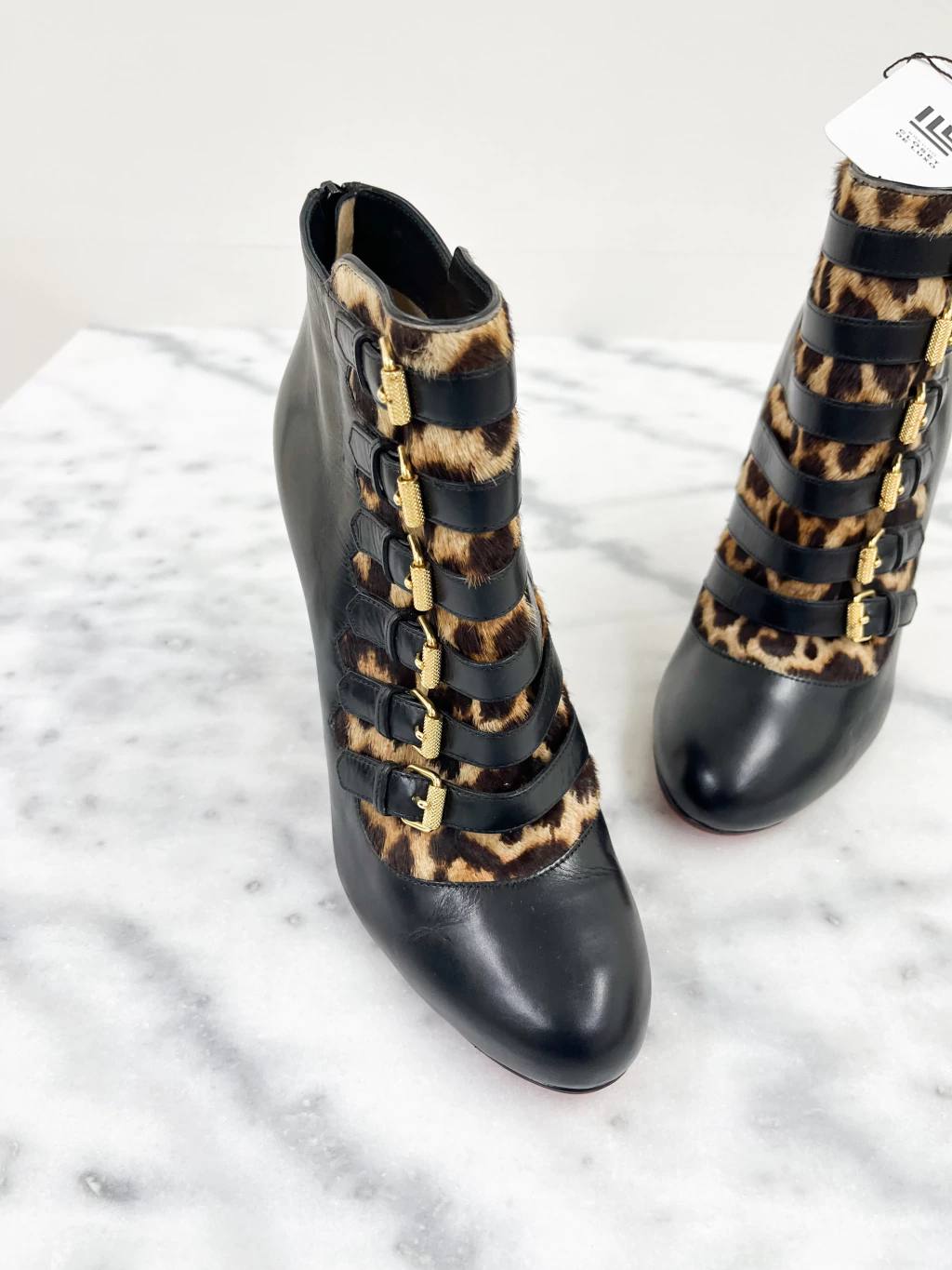 Bota Louboutin de couro preto, detalhes com estampa de leopardo, ferragens douradas, ziper traseiro, salto alto bloco e solado vermelho.