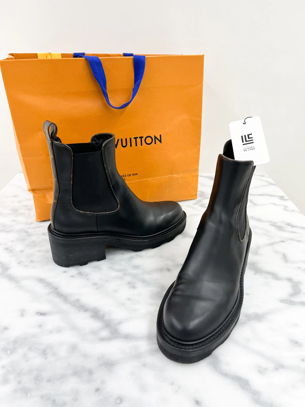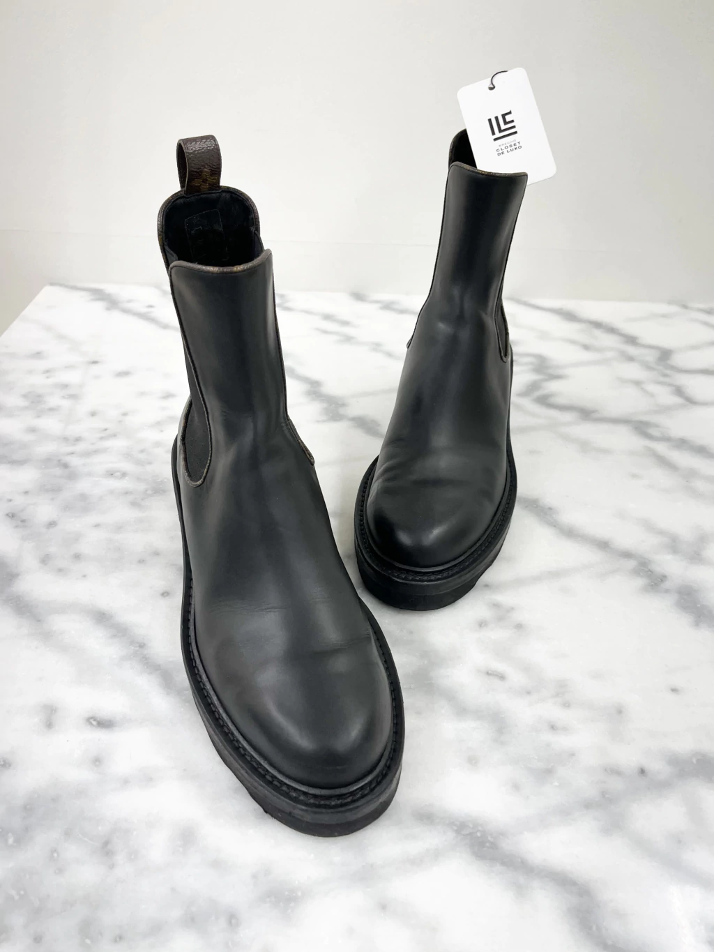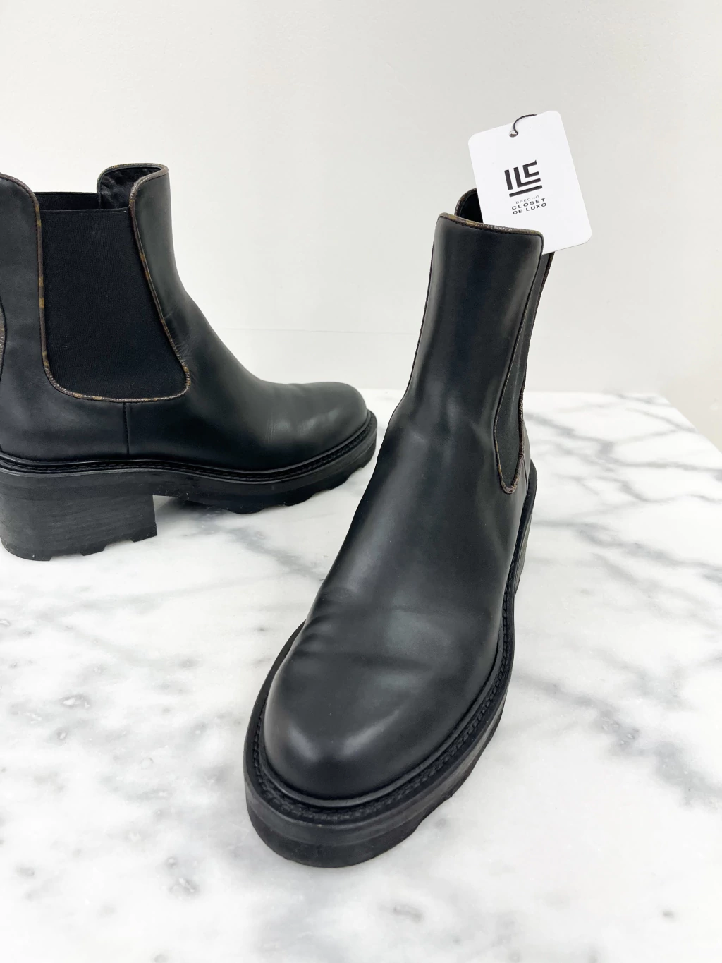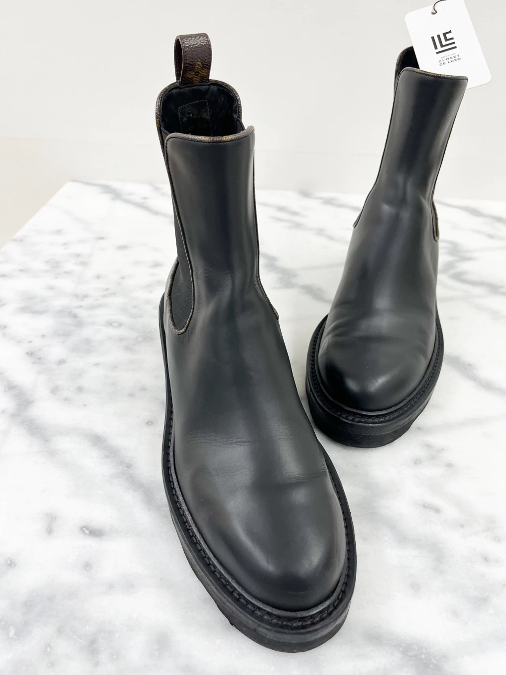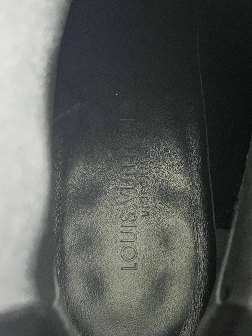 Bota Louis Vuitton (uniformes) de couro preto com detalhes em canvas na estampa monograma, entressola levemente tratorada e salto baixo bloco.