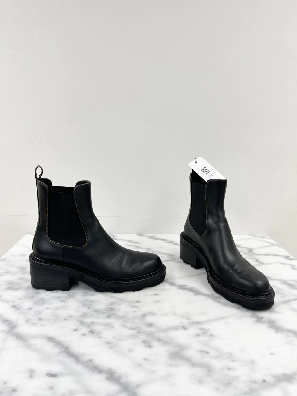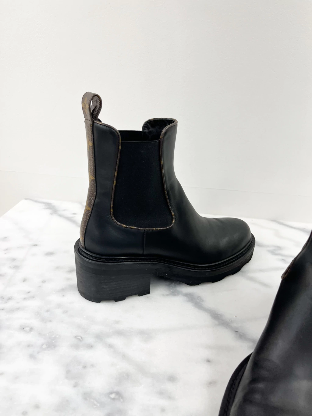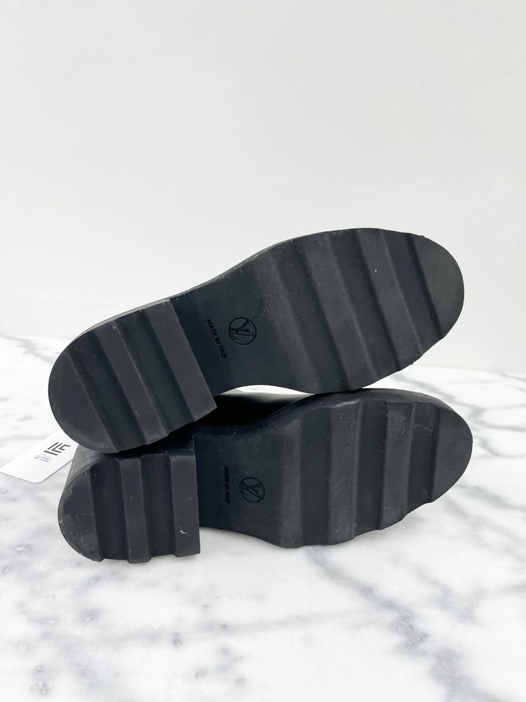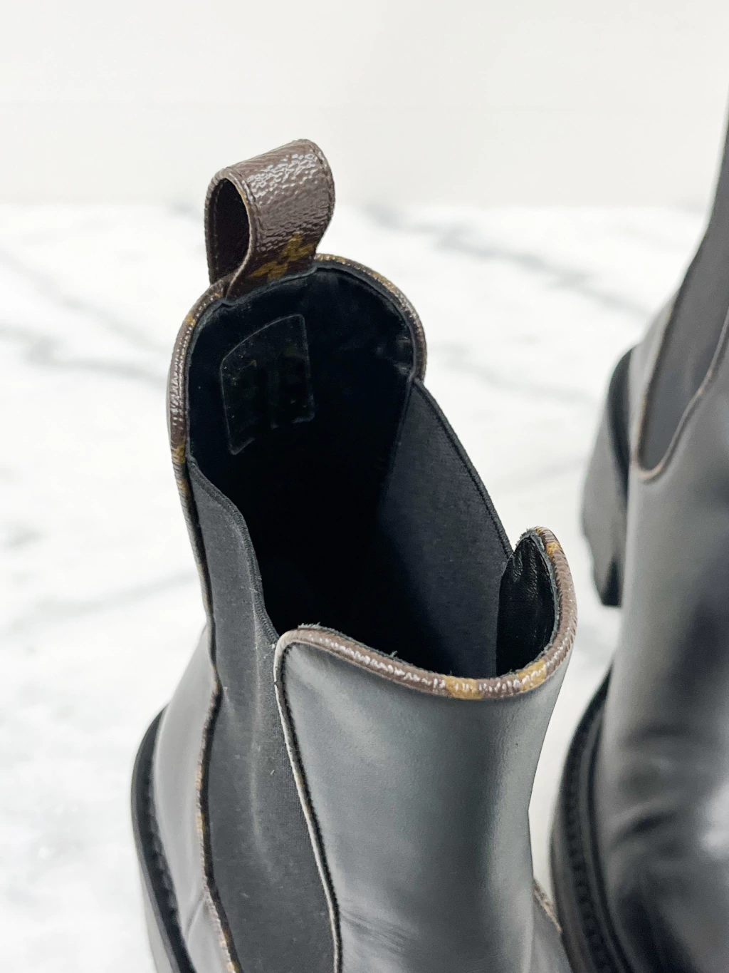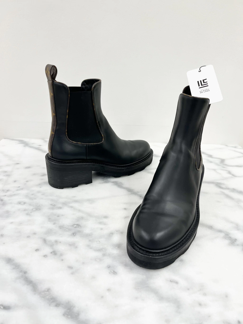 Bota Louis Vuitton (uniformes) de couro preto com detalhes em canvas na estampa monograma, entressola levemente tratorada e salto baixo bloco.