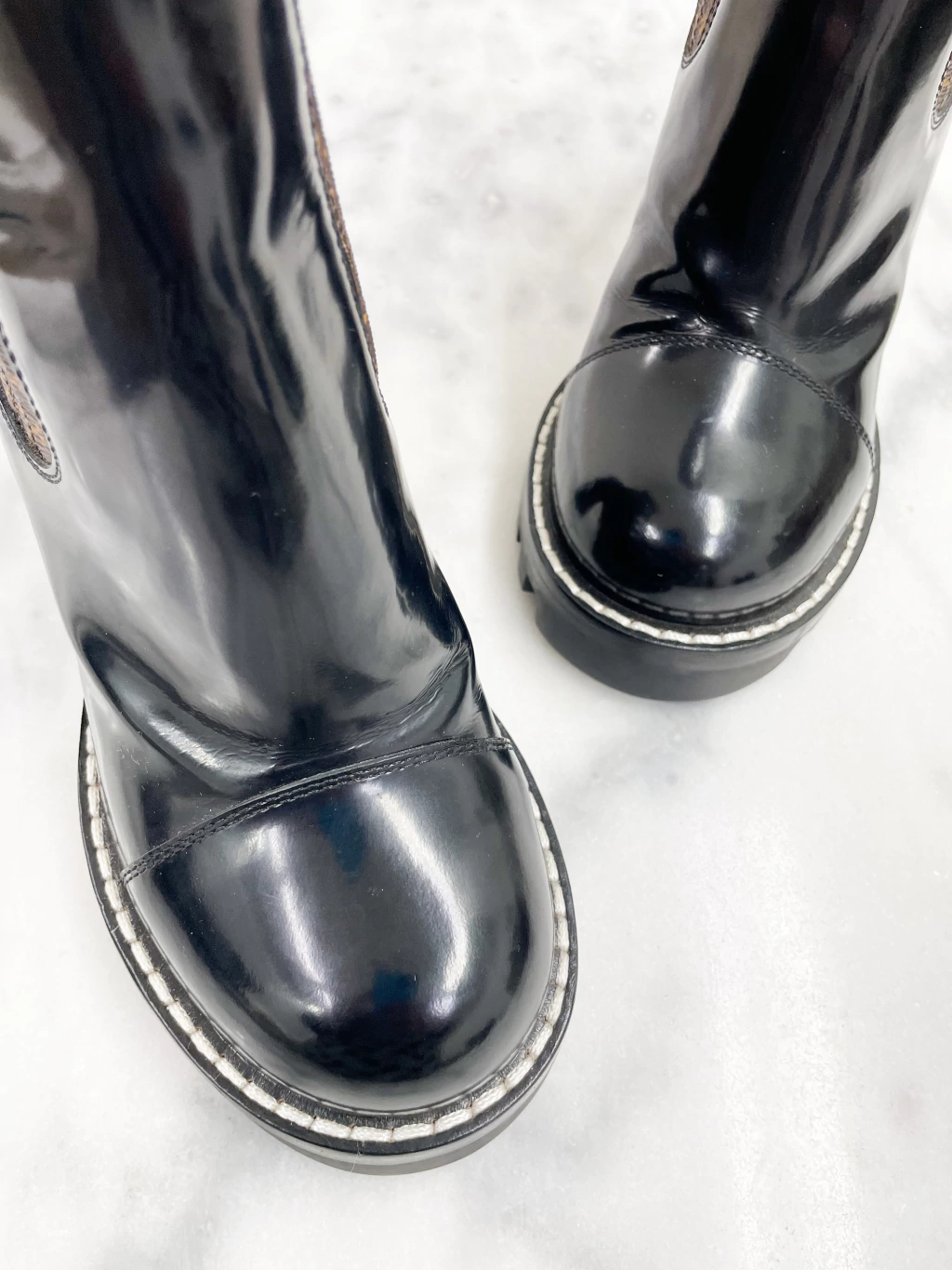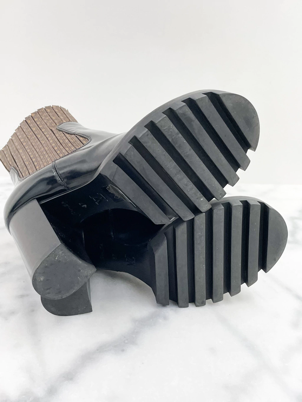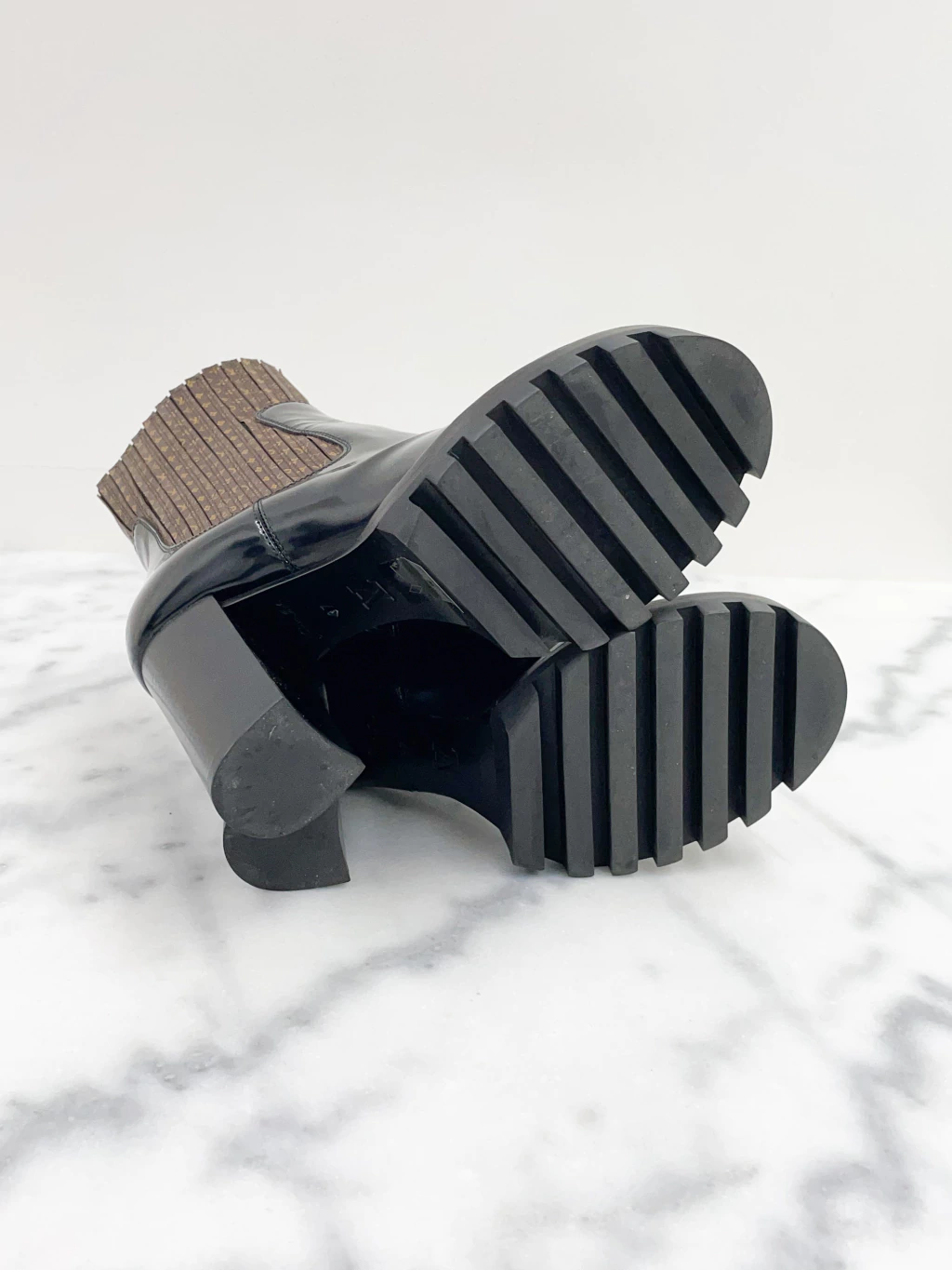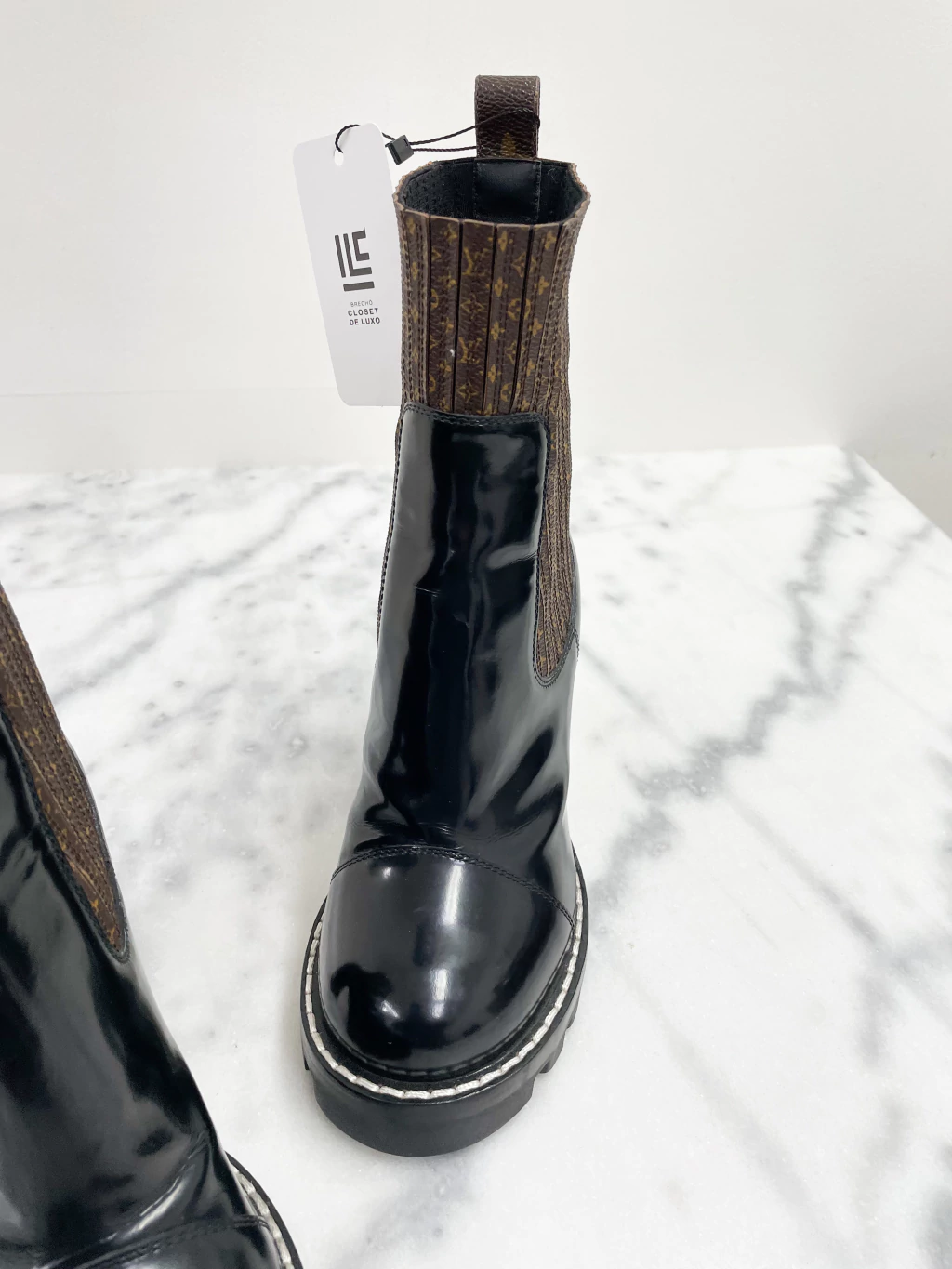 Bota Louis Vuitton Star Trail Ankle Boot de couro envernizado preto, canvas na estampa monograma, solado tratorado e salto bloco médio.