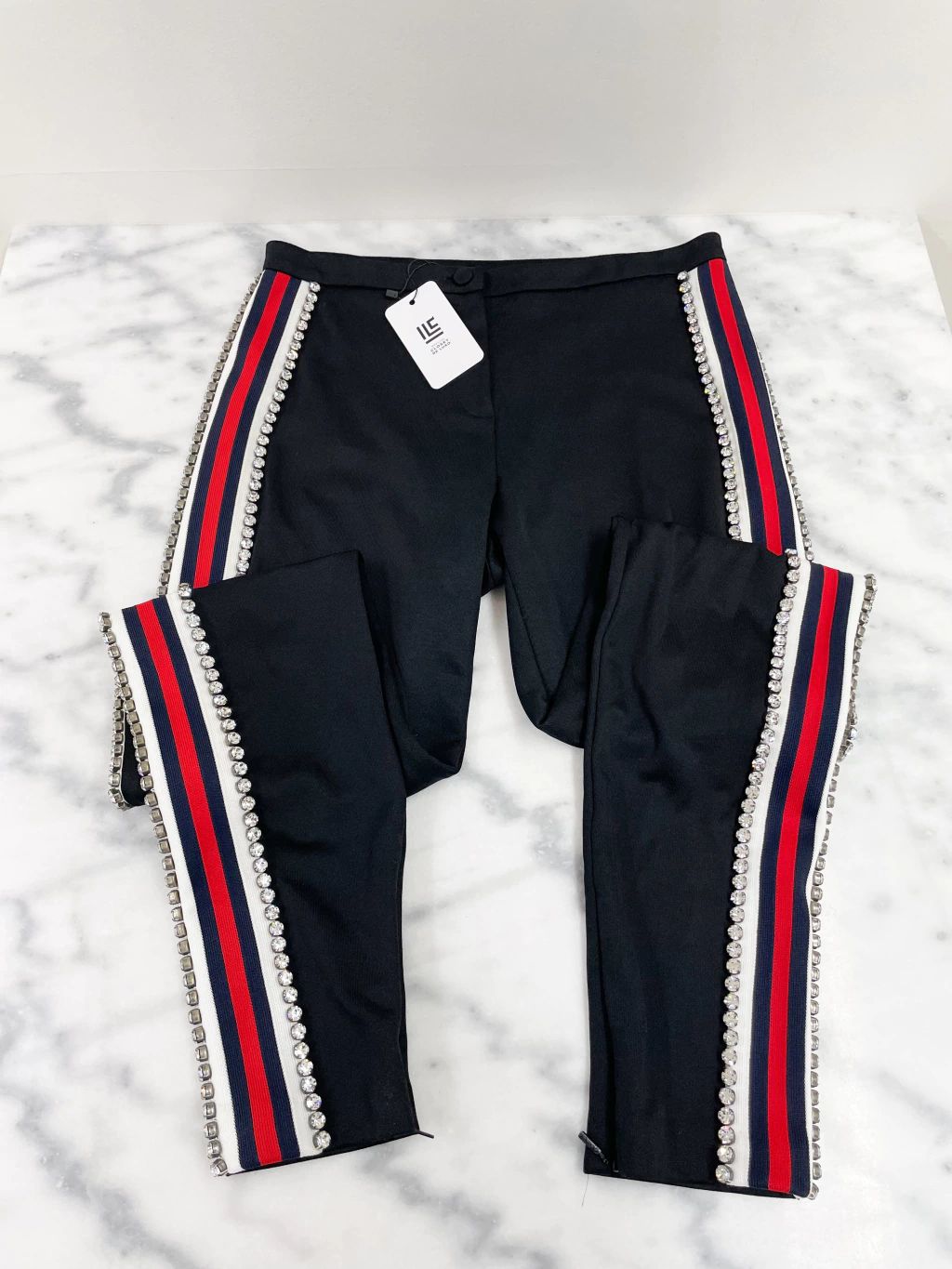 Calça Gucci de tecido preto, faixa Sylvie nas laterais, aplicações de pedrarias e fechamento por zíper e botão.