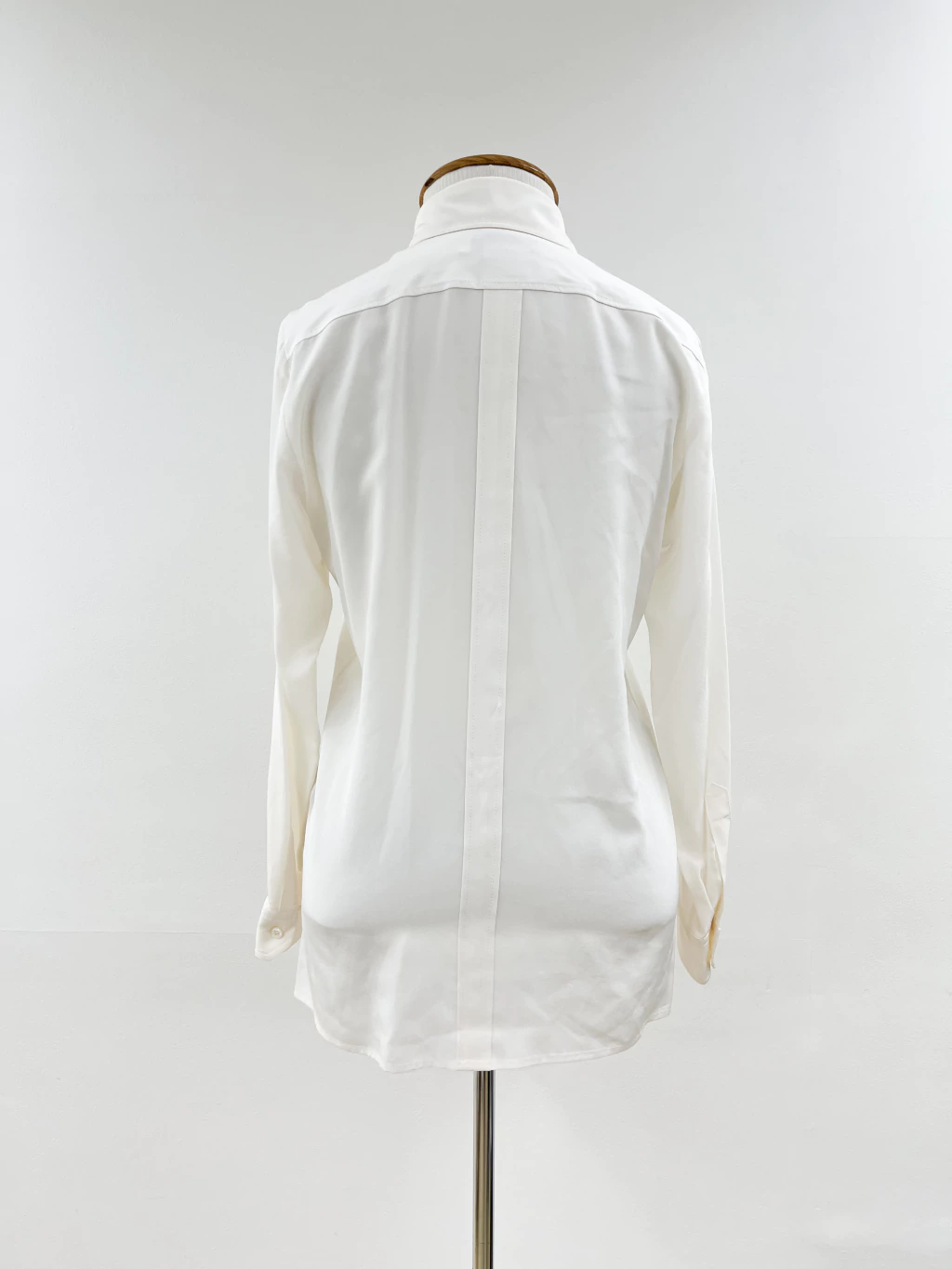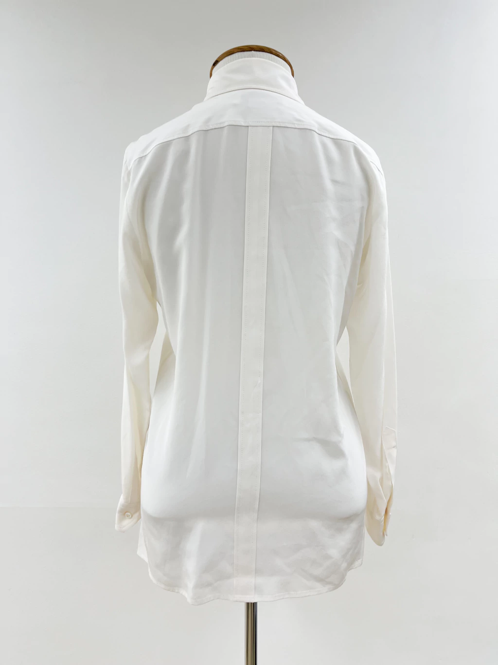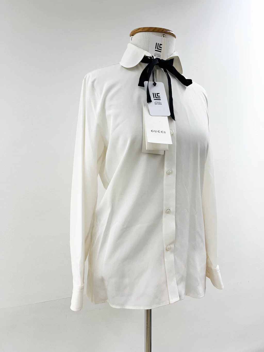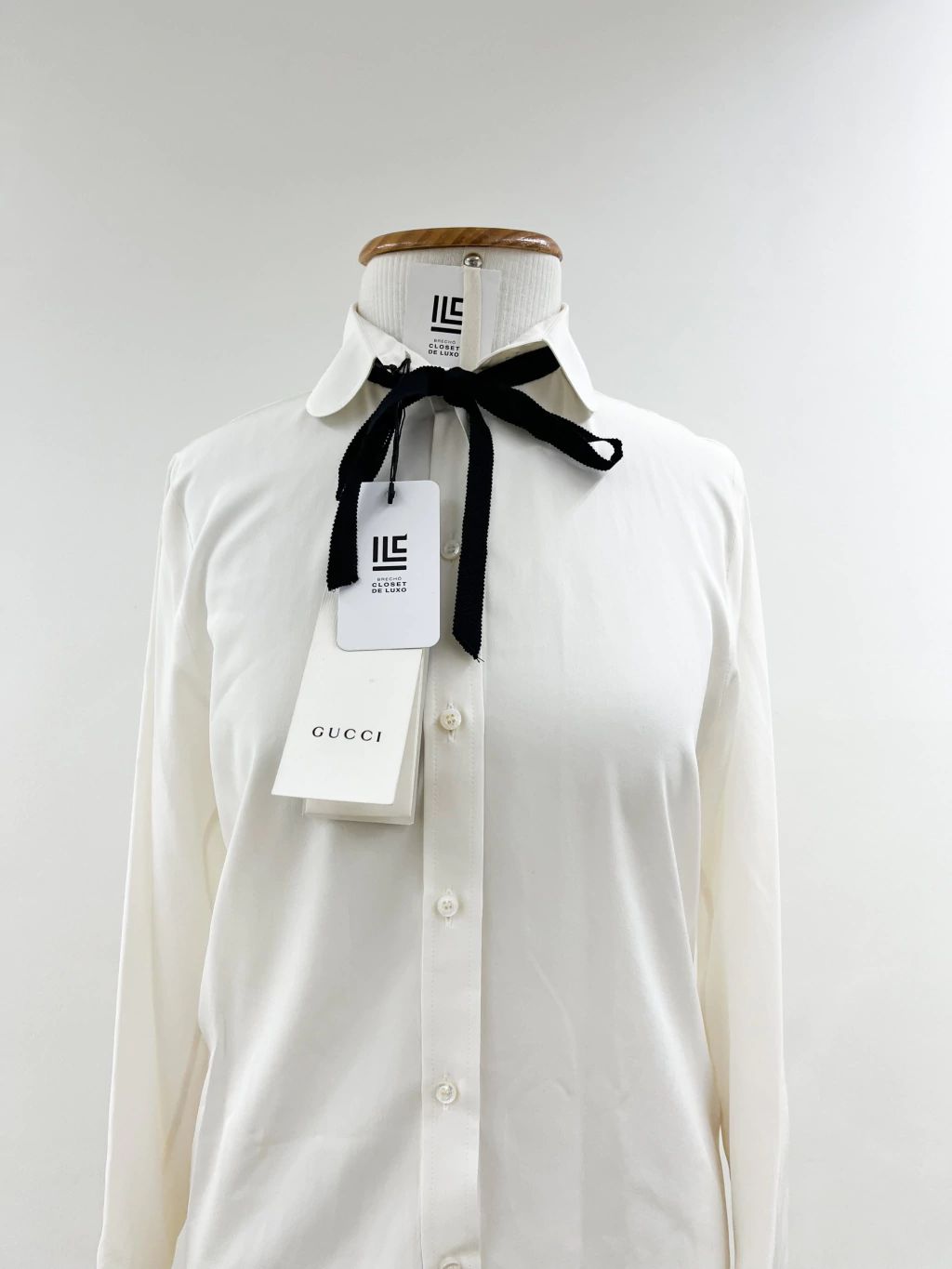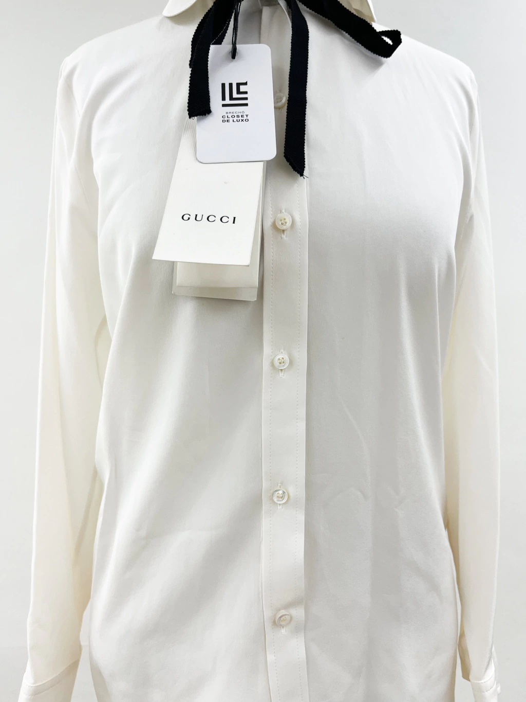 Camisa Gucci (uniforms) de seda branca, fechamento por botões em madrepérola e detalhe de cordão de tecido preto no pescoço.
