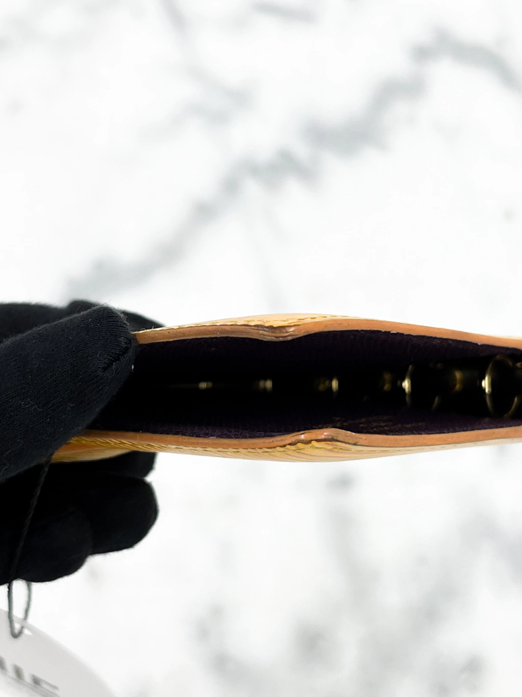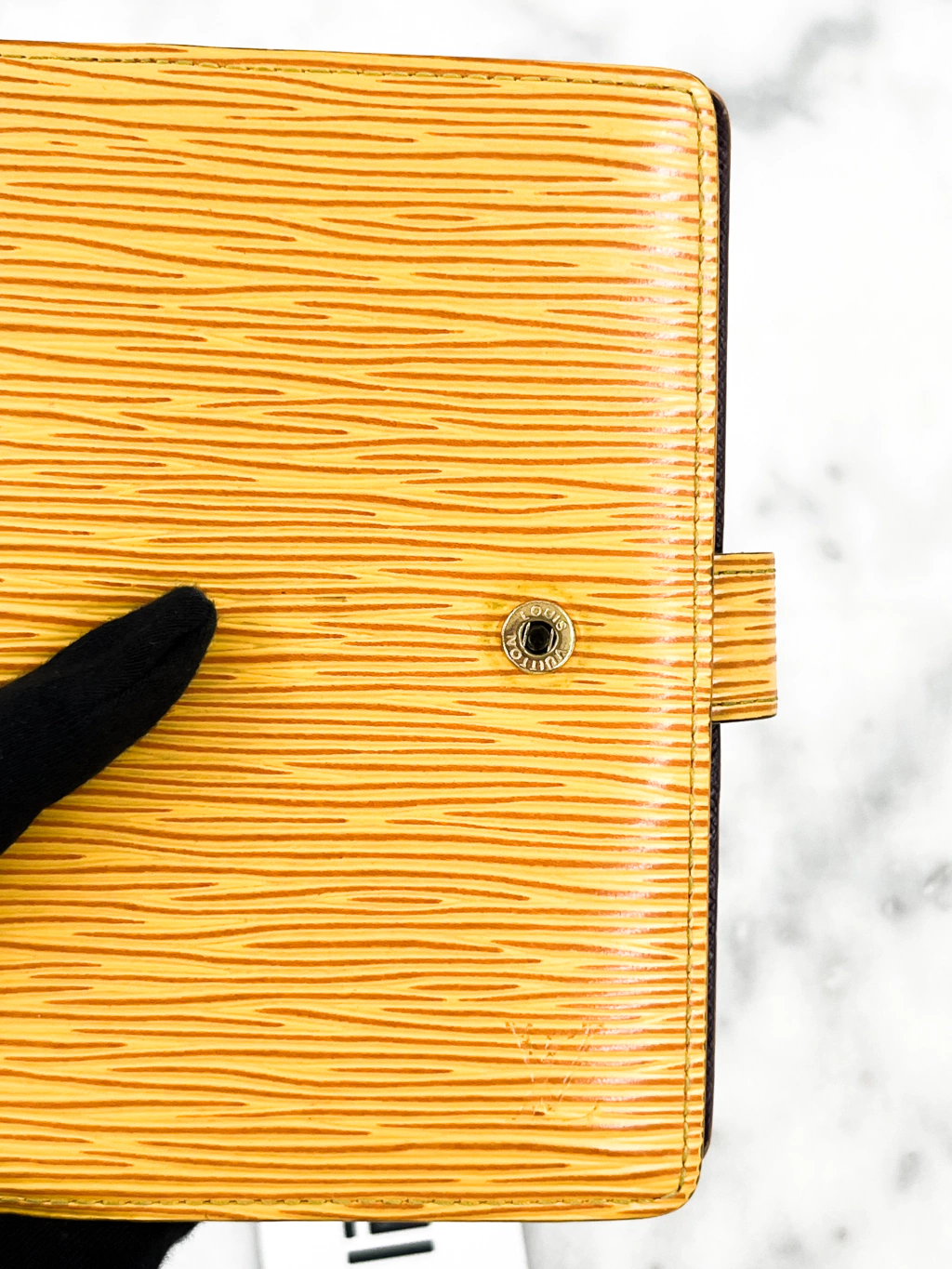 Capa para agenda Louis Vuitton PM de couro epi na cor amarelo mostarda, logo frontal e ferragens douradas.
