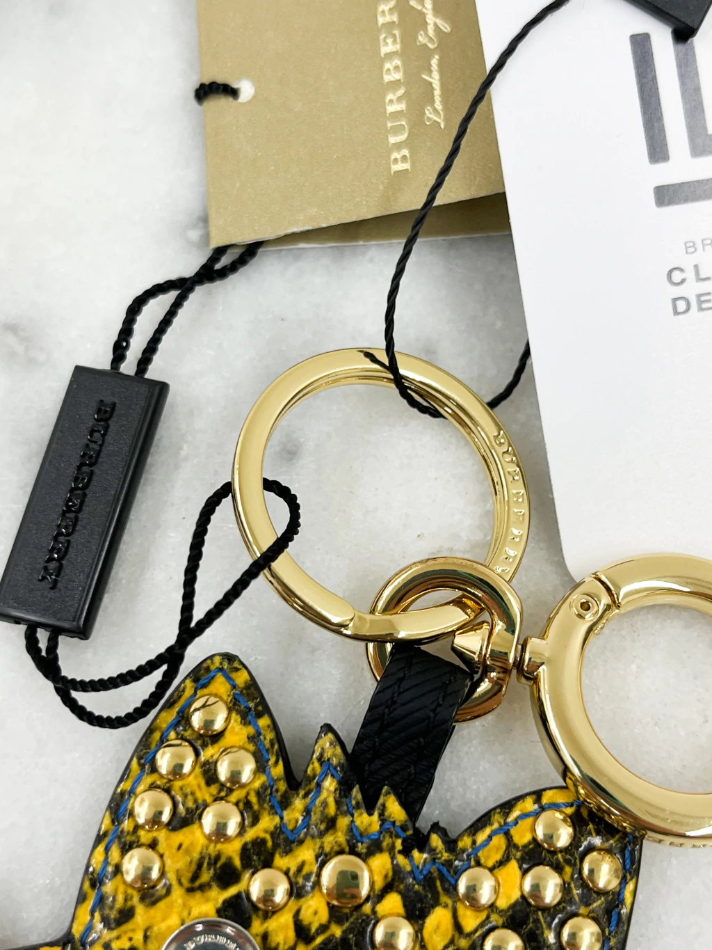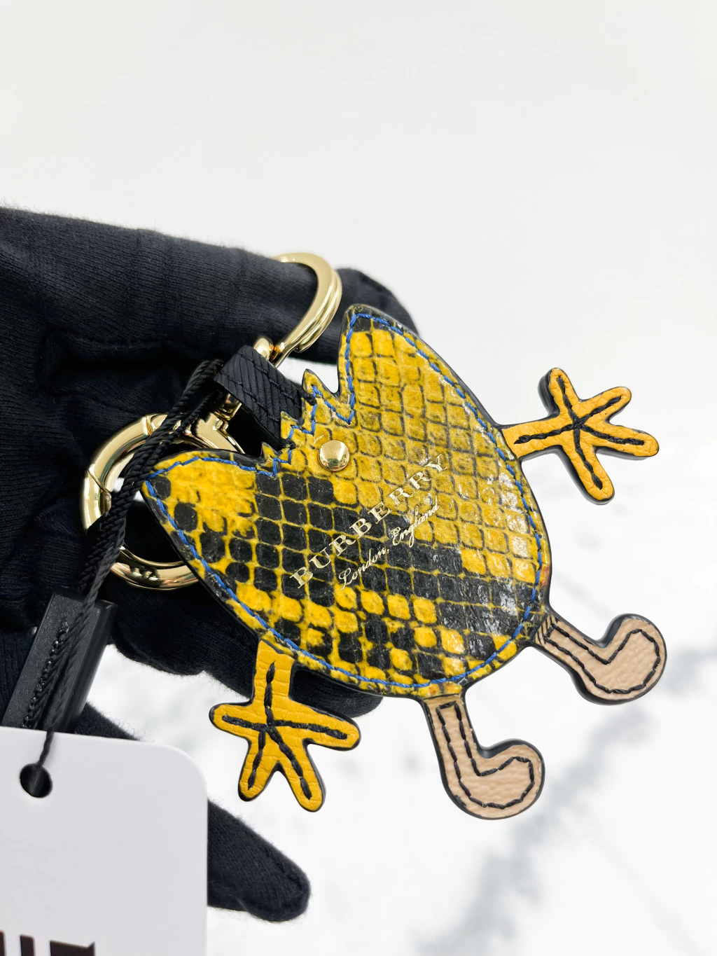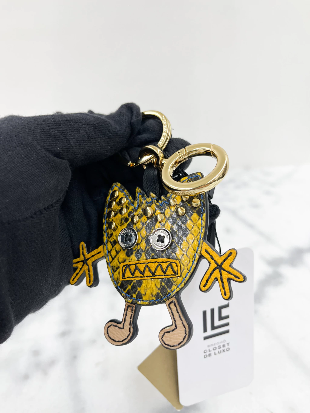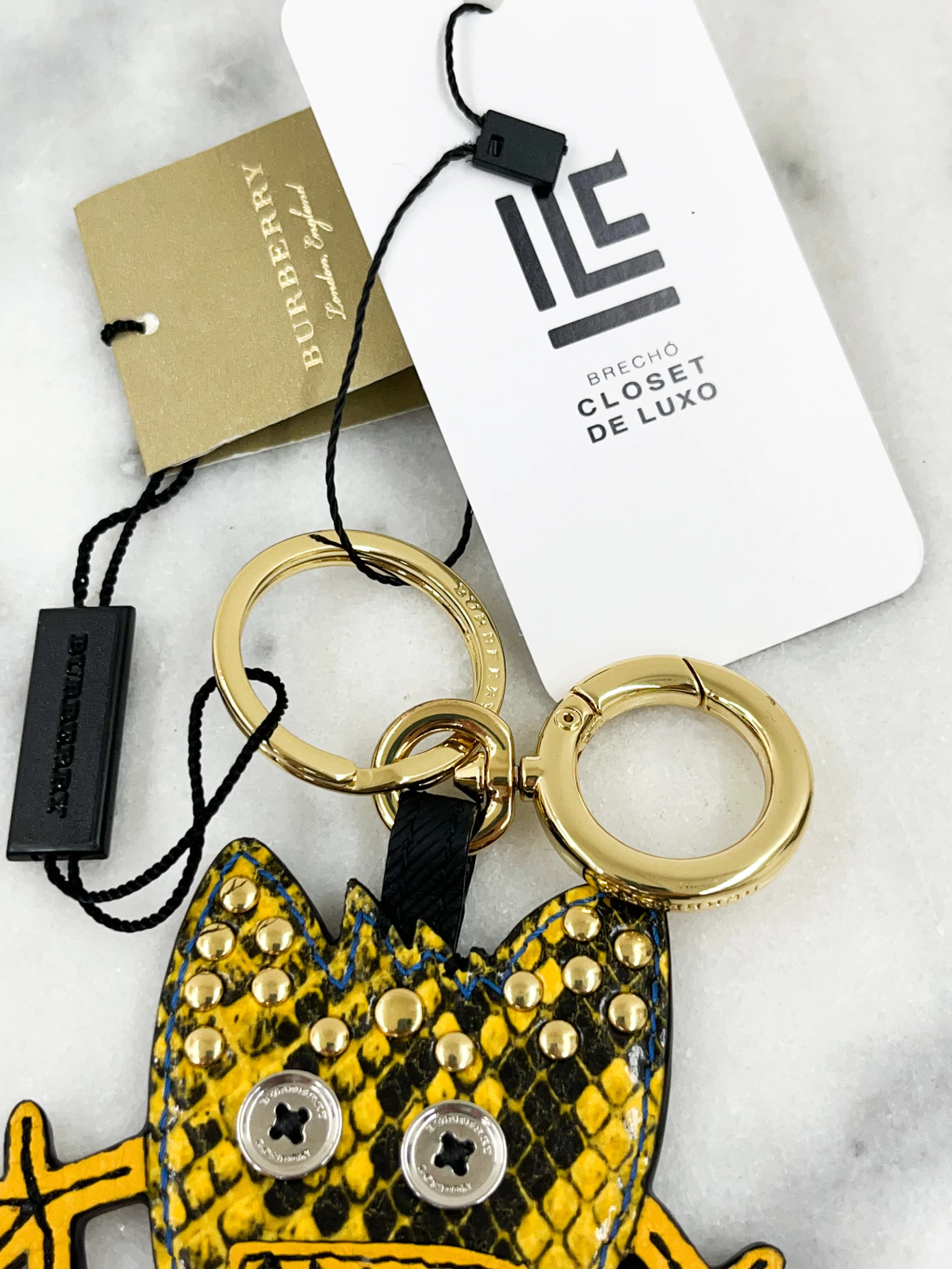 Chaveiro Burberry Creature em formato de monstrinho em couro nas cores amarelo e bege, logo na parte de trás, ferragens douradas, mosquetão e argola para chaves.