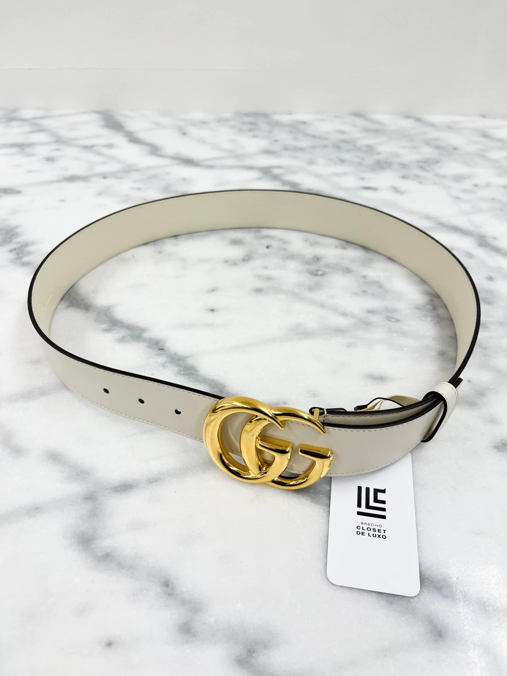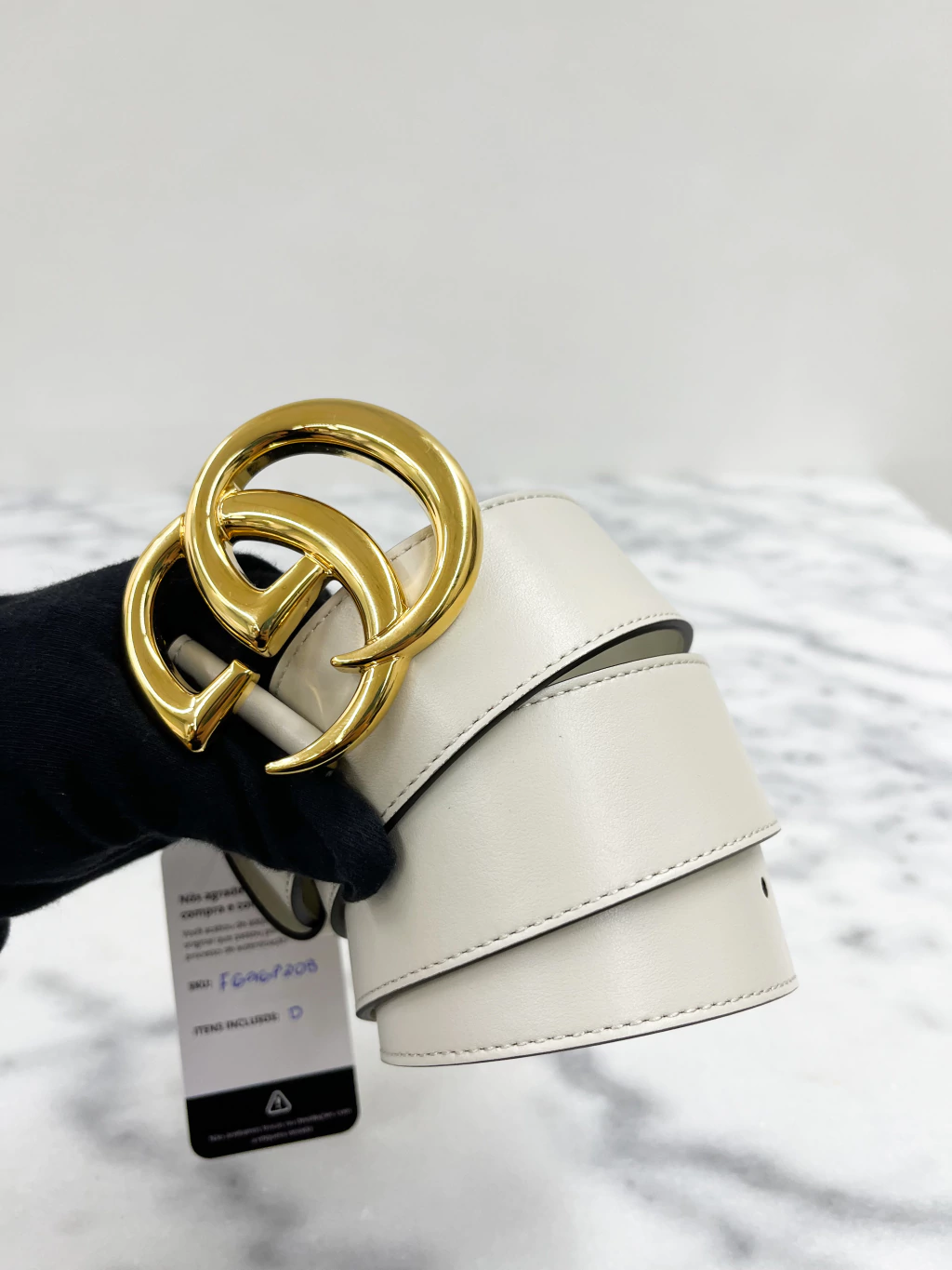Cinto Gucci GG Marmont de espessura média em couro na cor off white, logo frontal e ferragens douradas.