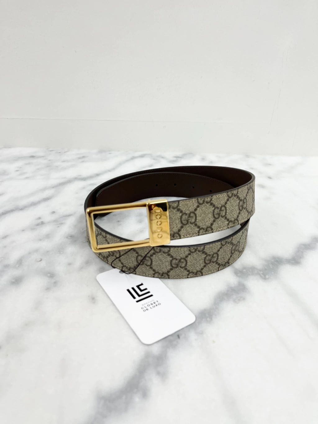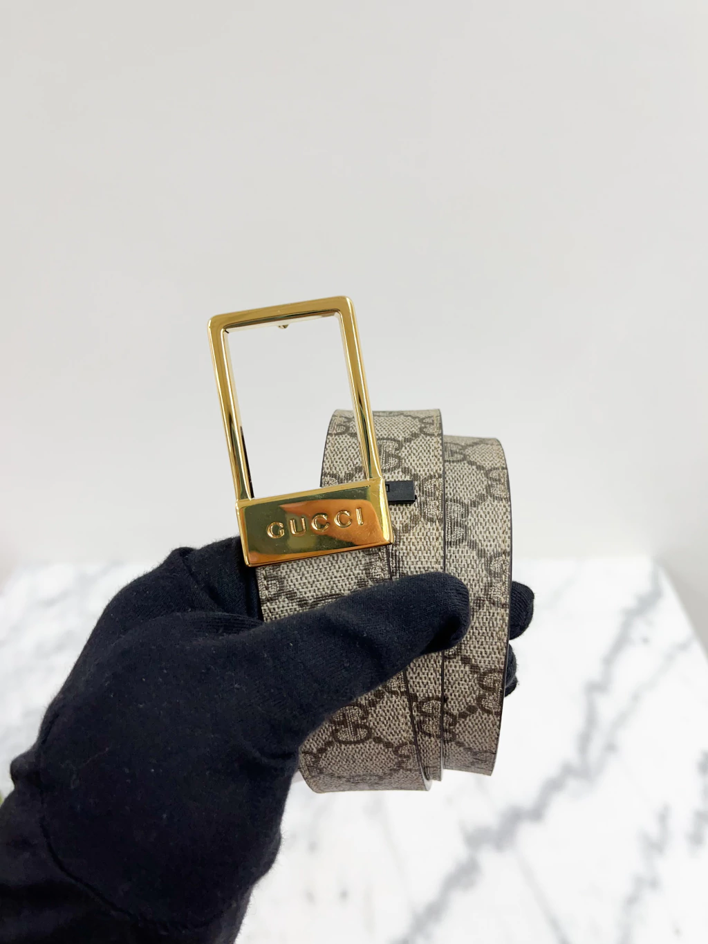 Cinto Gucci GG Supreme Rectangular Buckle de espessura média em canvas na estampa monograma, logo frontal e ferragens douradas.