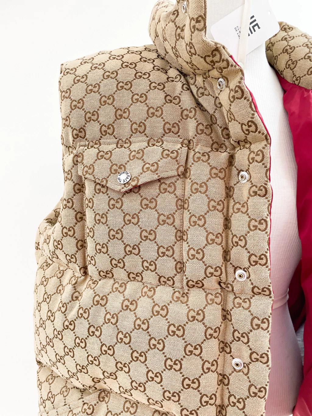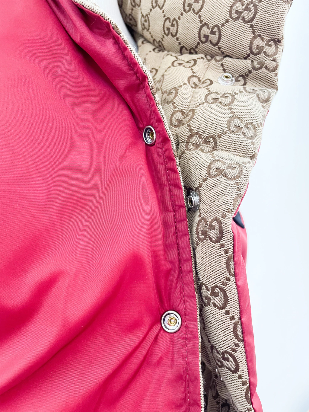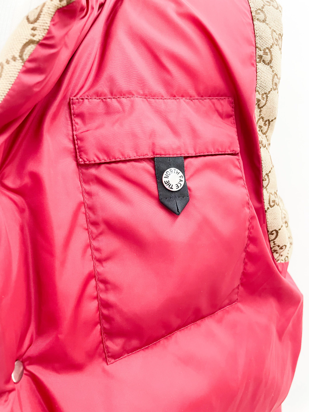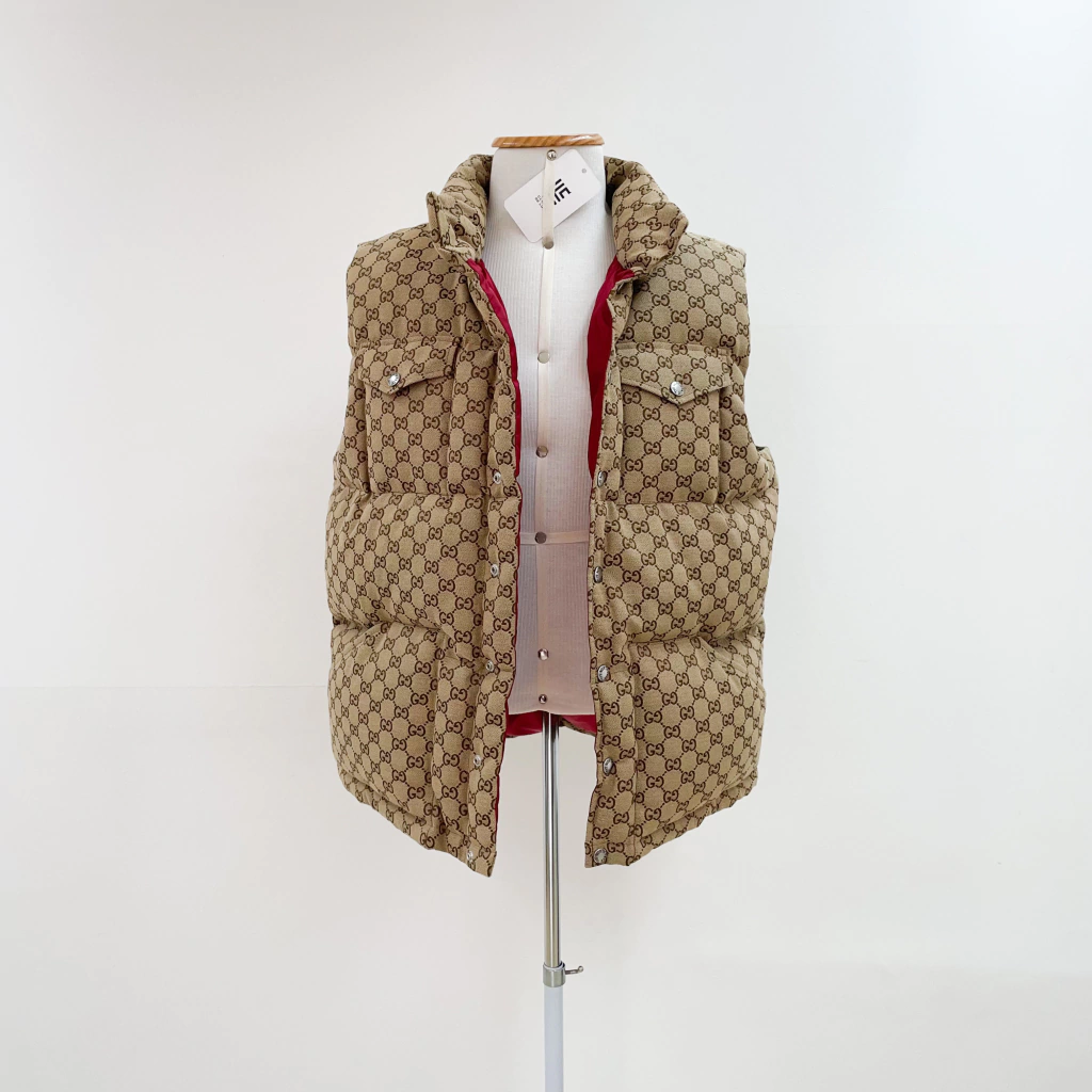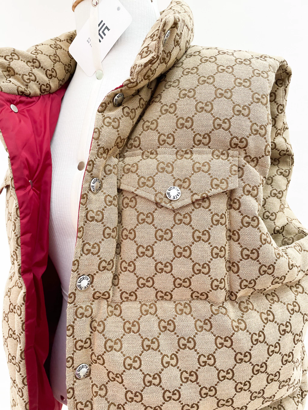 Colete Gucci Collab The North Face de tecido jacquard monograma, ferragens prateadas, logo atrás e fechamento por botões.