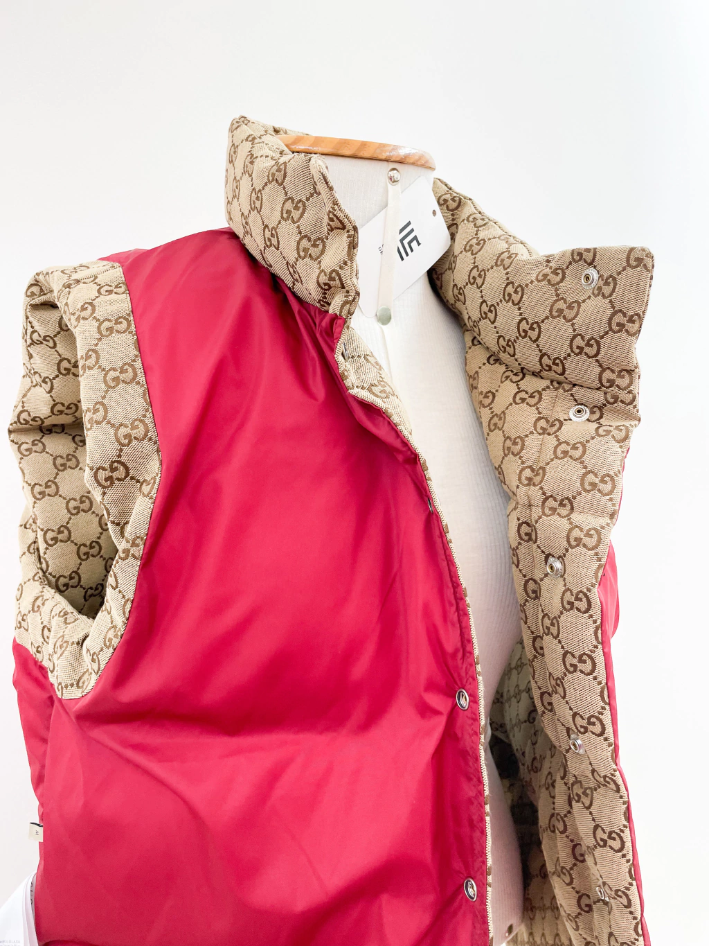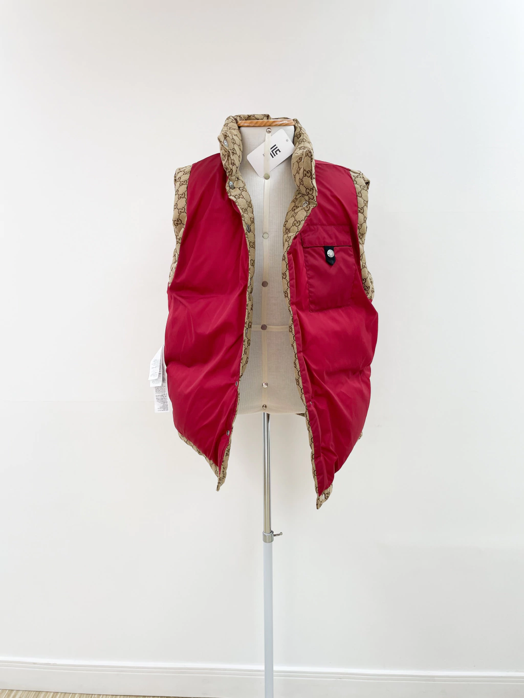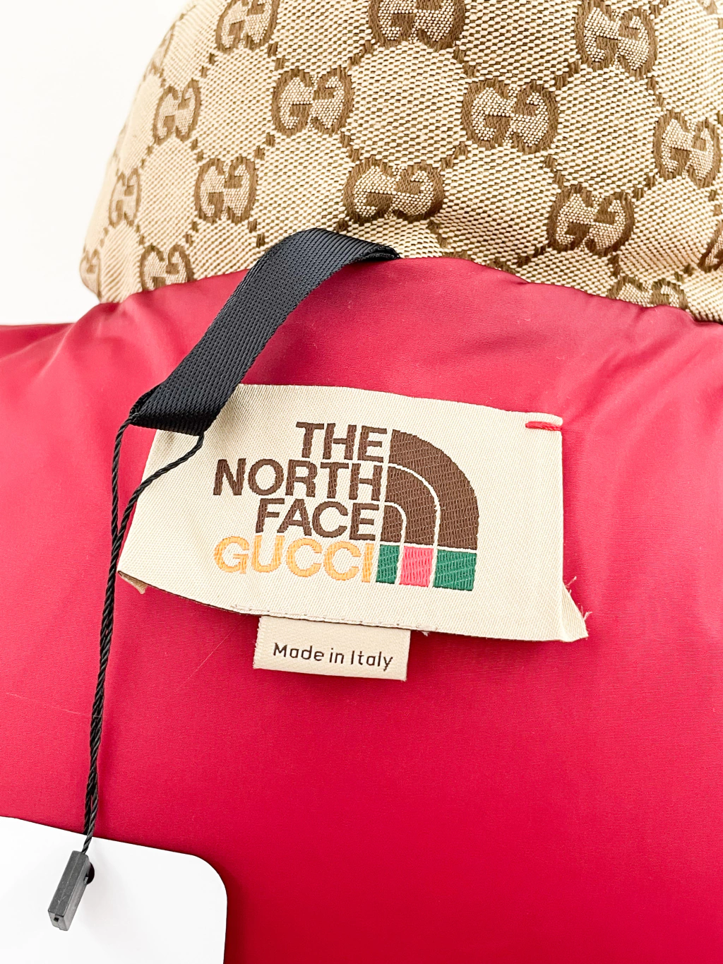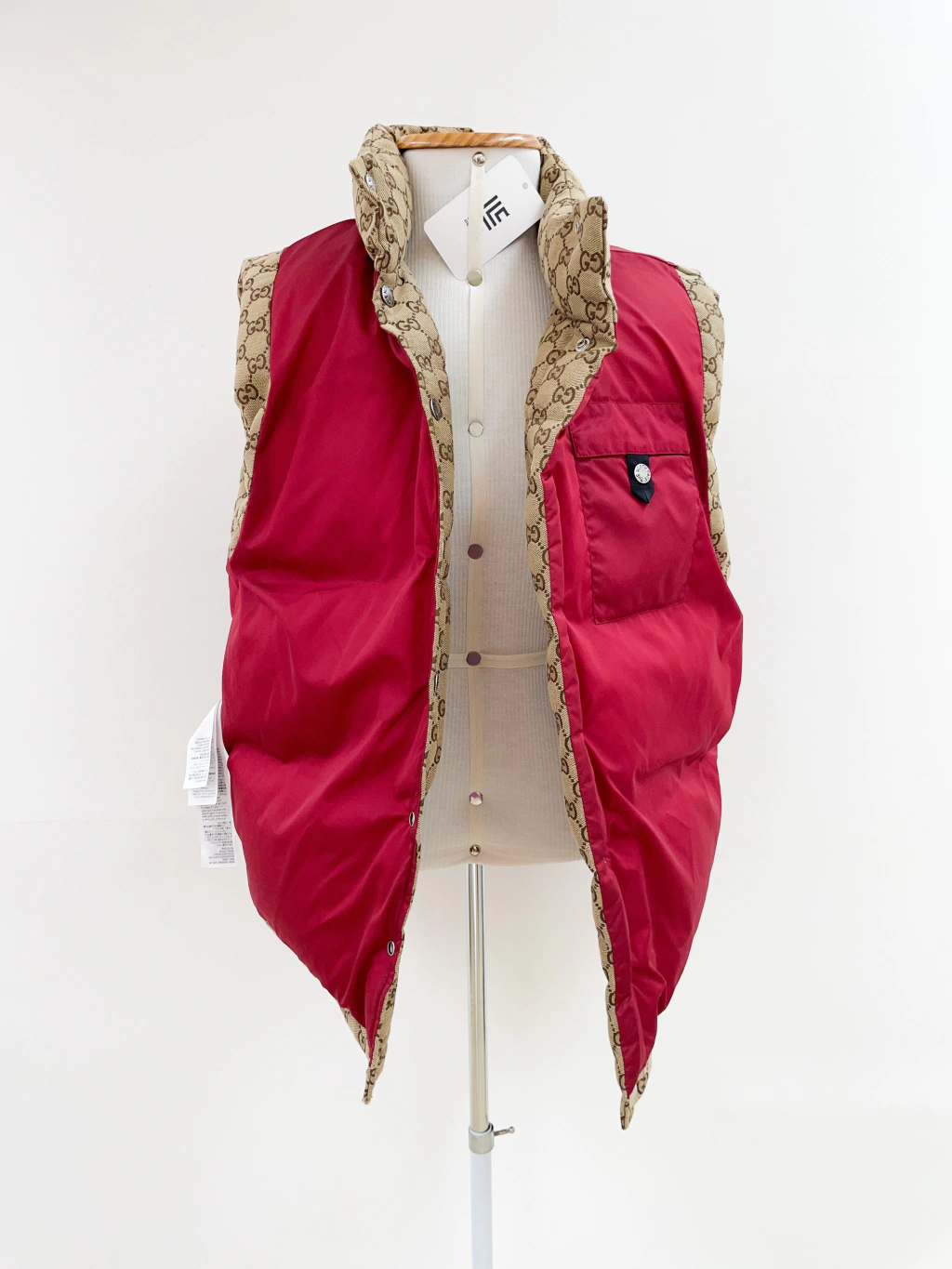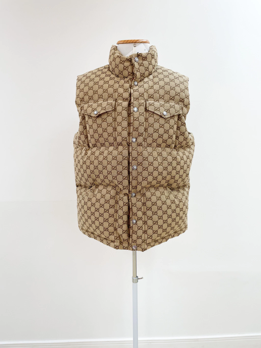 Colete Gucci Collab The North Face de tecido jacquard monograma, ferragens prateadas, logo atrás e fechamento por botões.