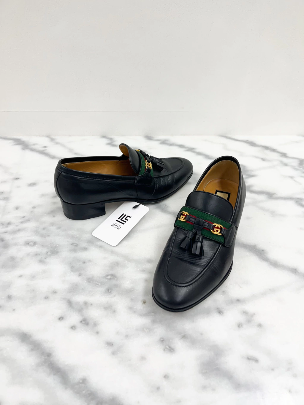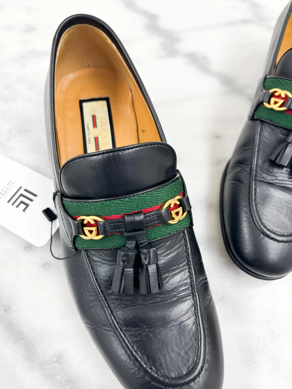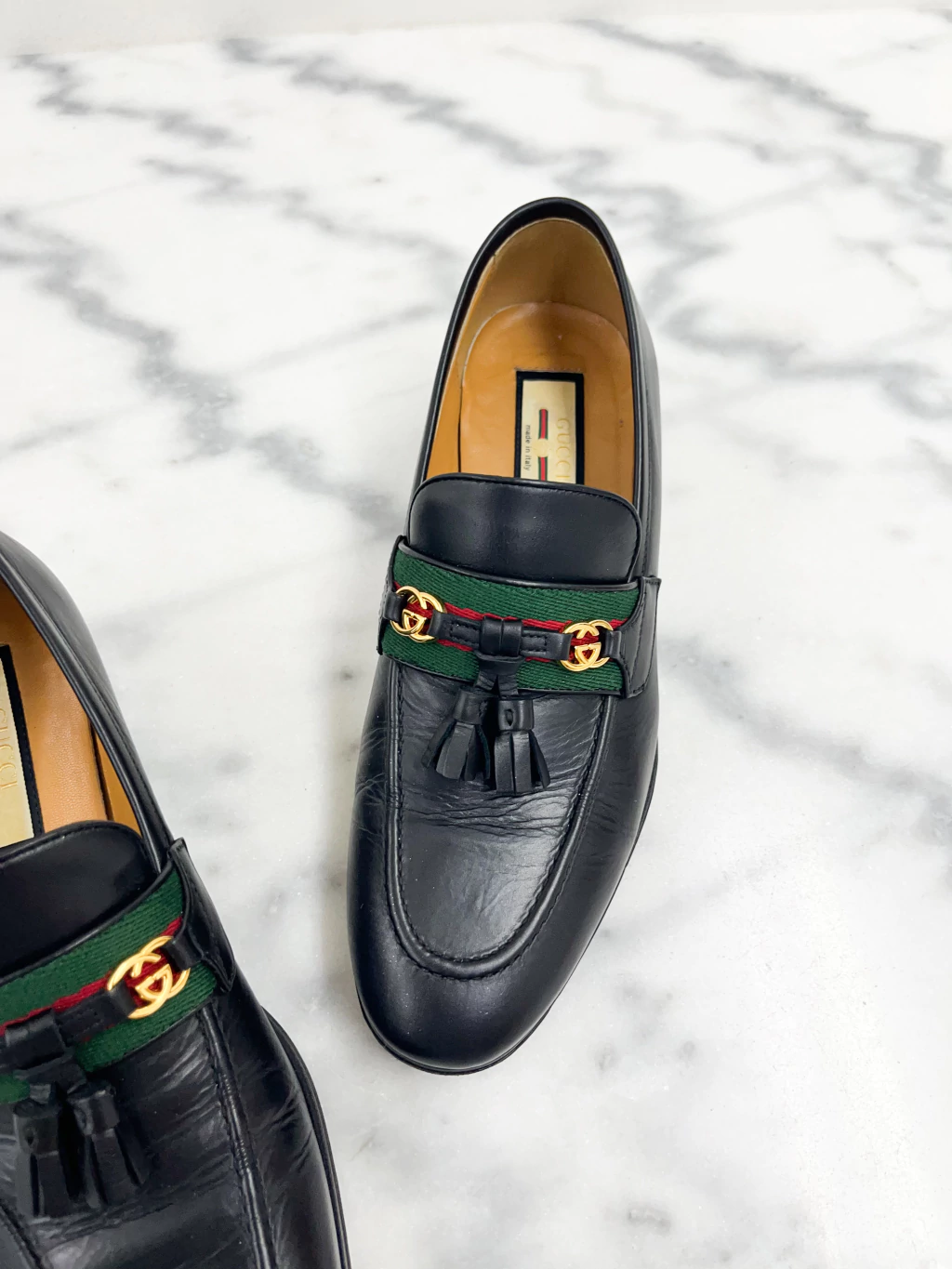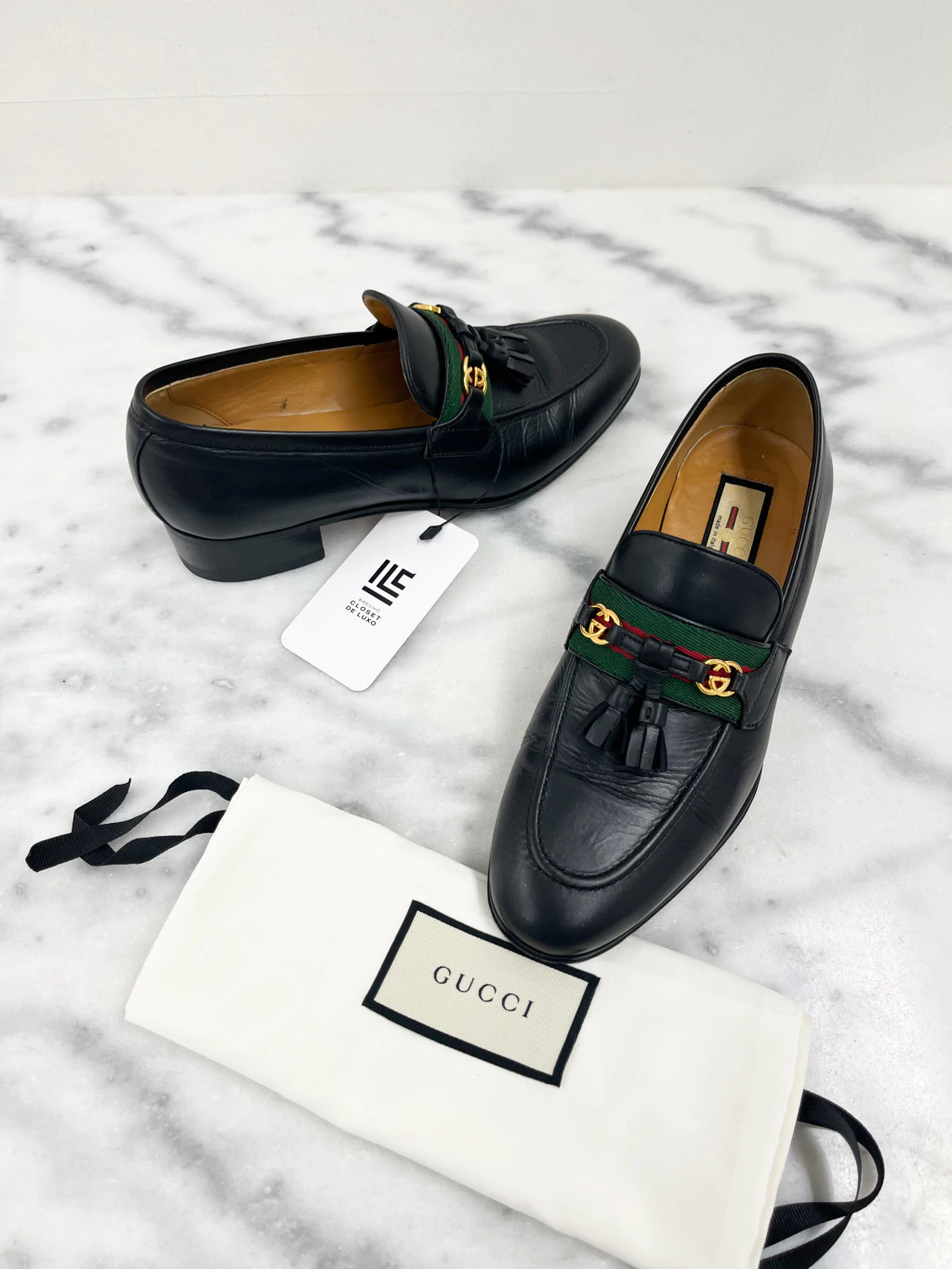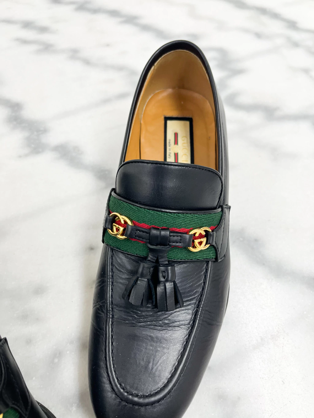 Mocassim Gucci Interlocking GG de couro preto, detalhe frontal em faixa web, tassel e logo frontal com ferragens douradas.