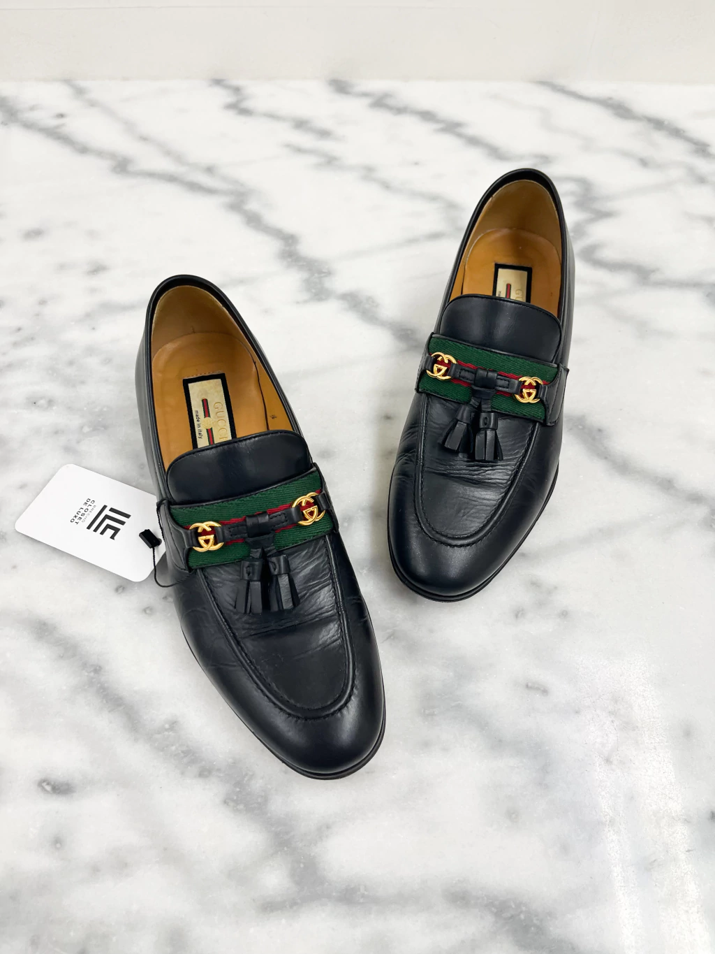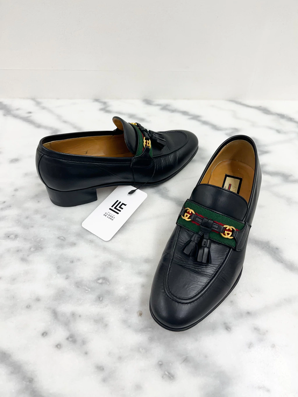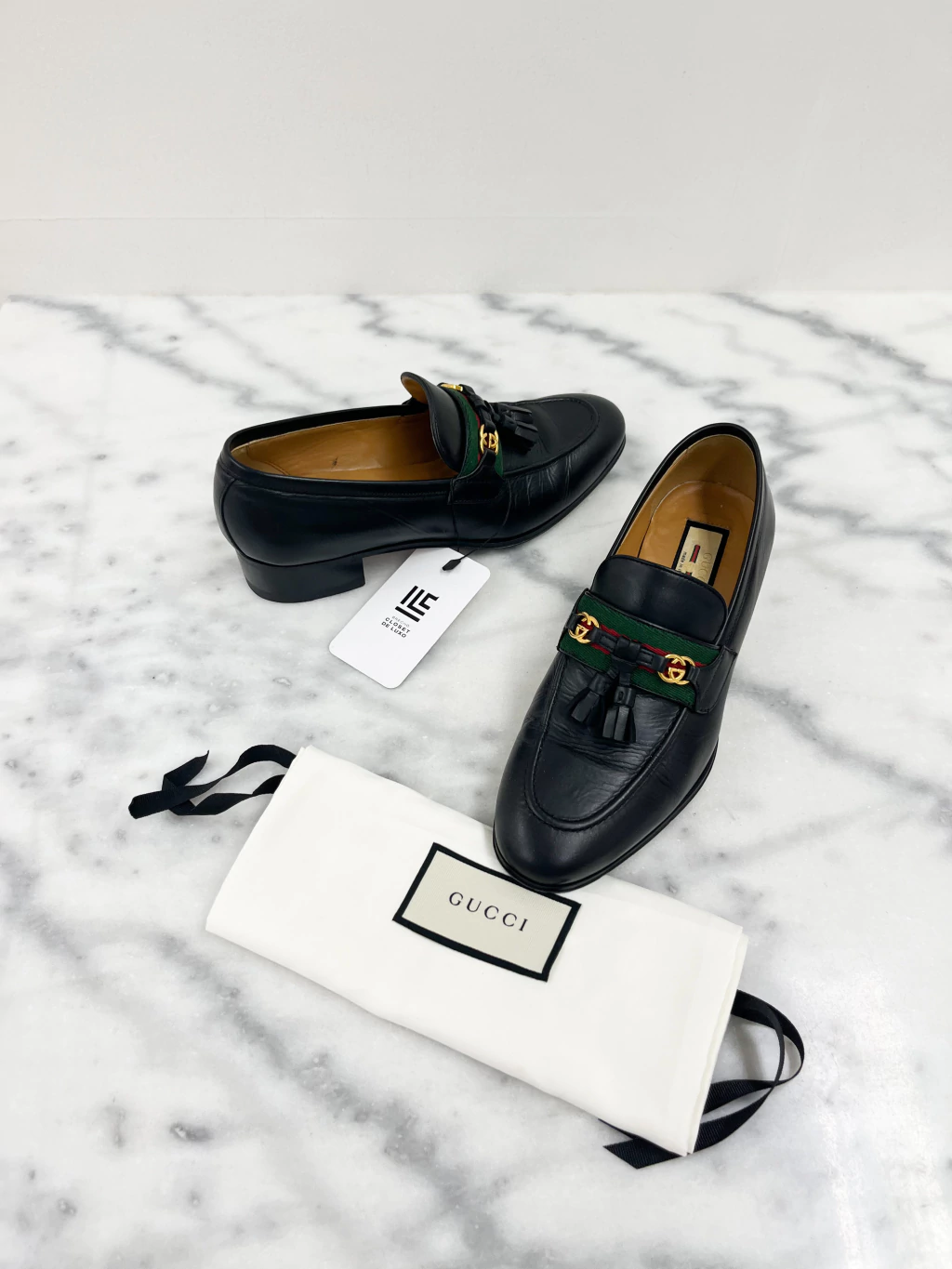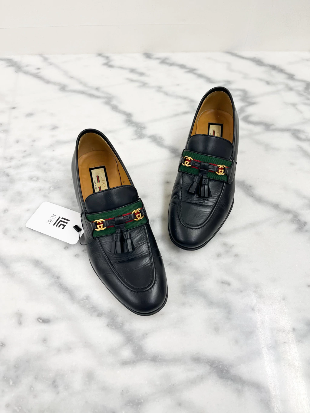 Mocassim Gucci Interlocking GG de couro preto, detalhe frontal em faixa web, tassel e logo frontal com ferragens douradas.