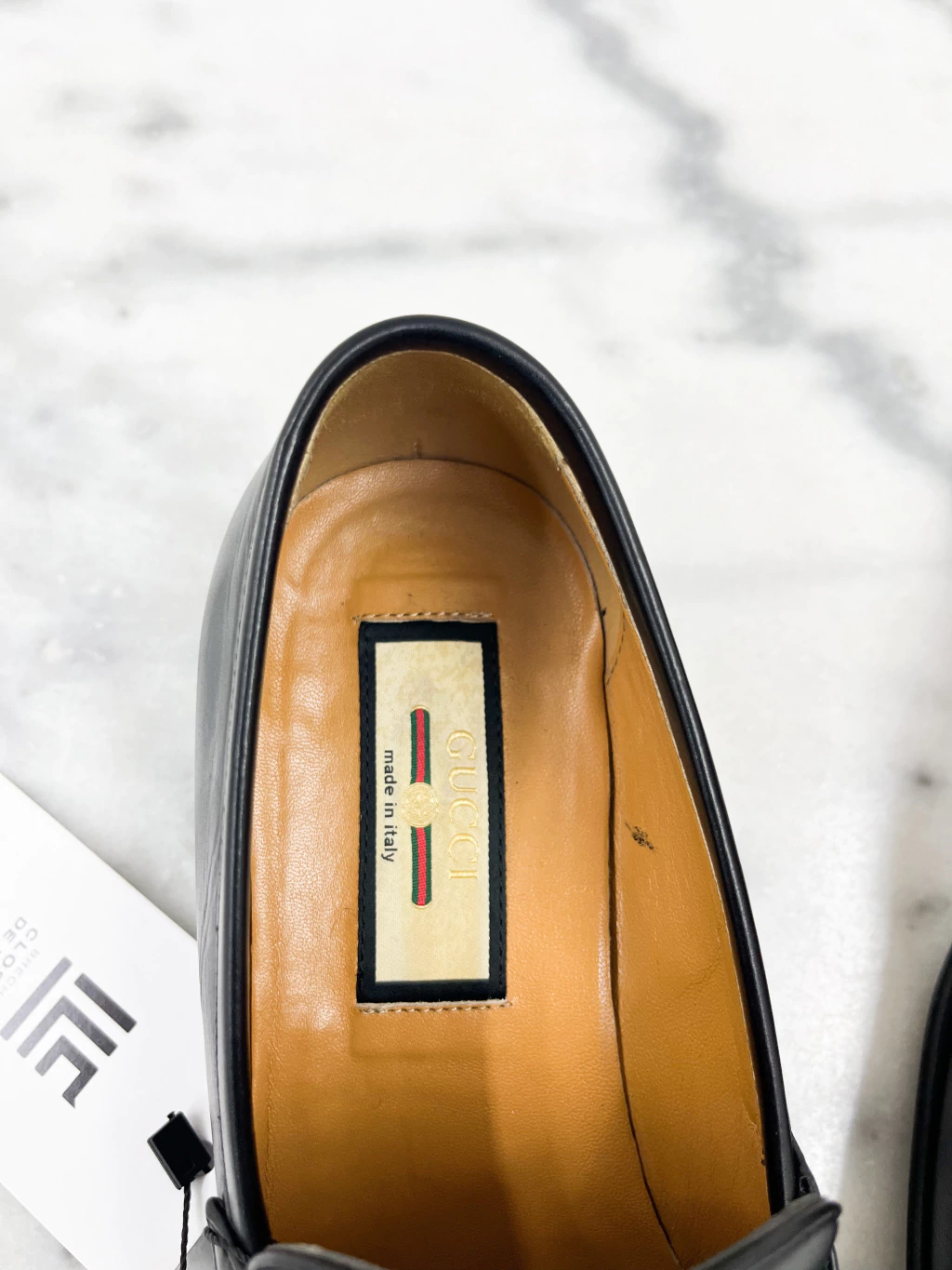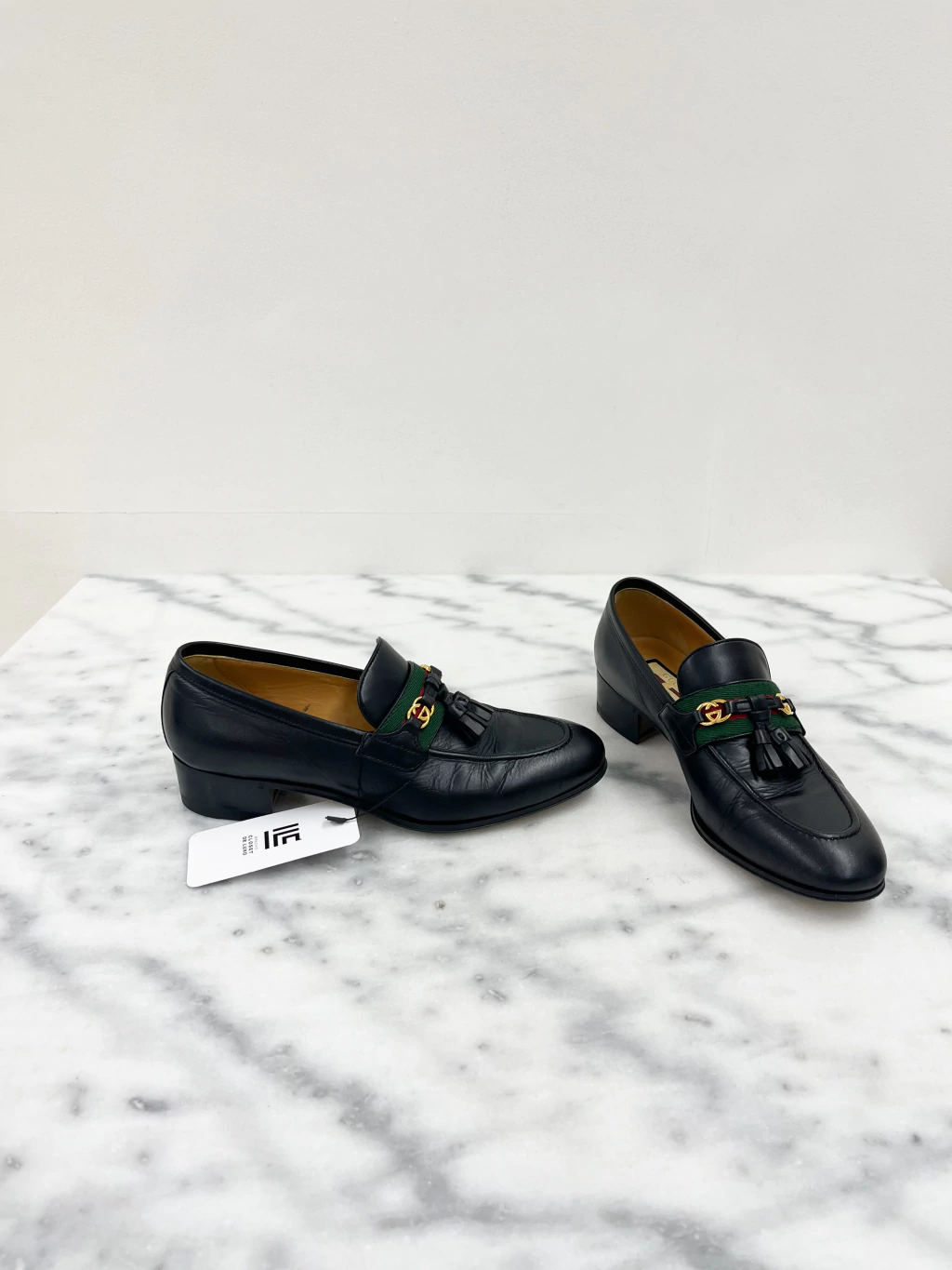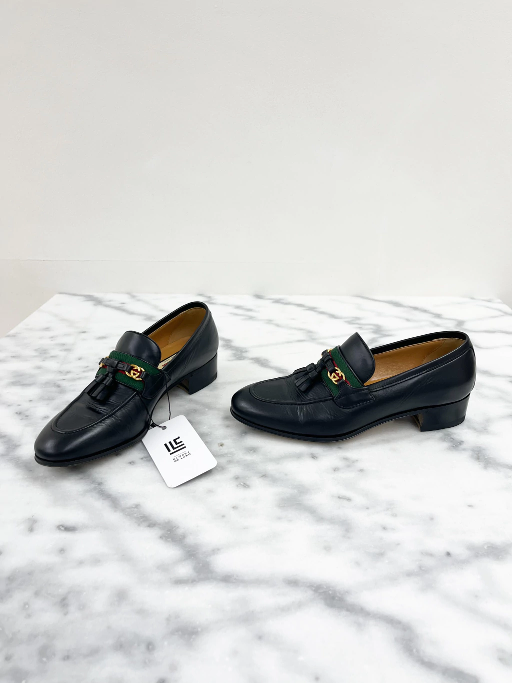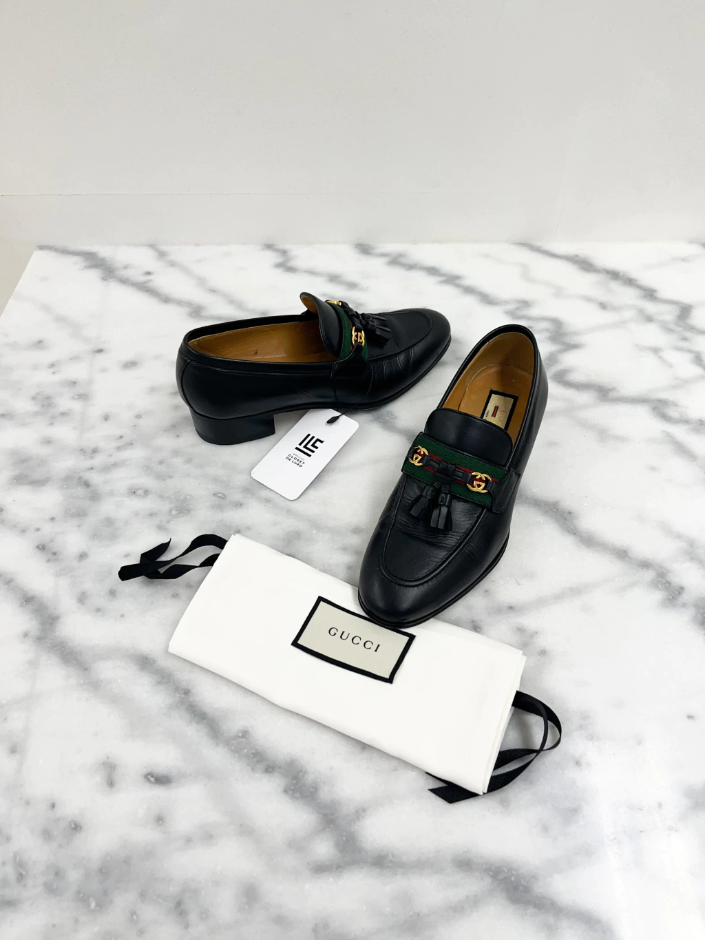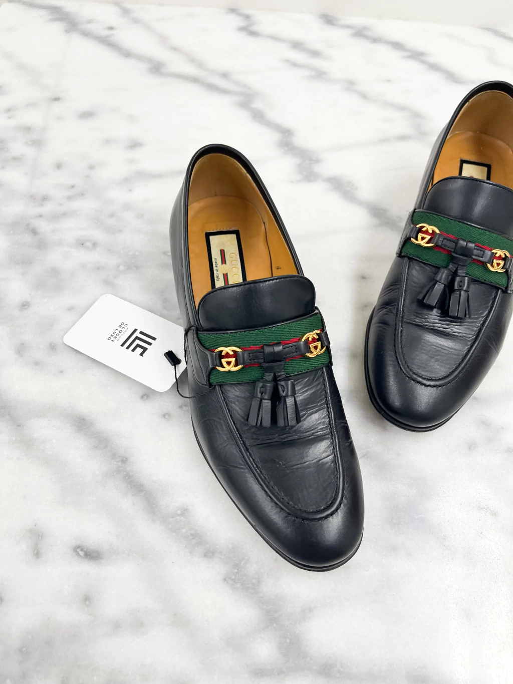 Mocassim Gucci Interlocking GG de couro preto, detalhe frontal em faixa web, tassel e logo frontal com ferragens douradas.