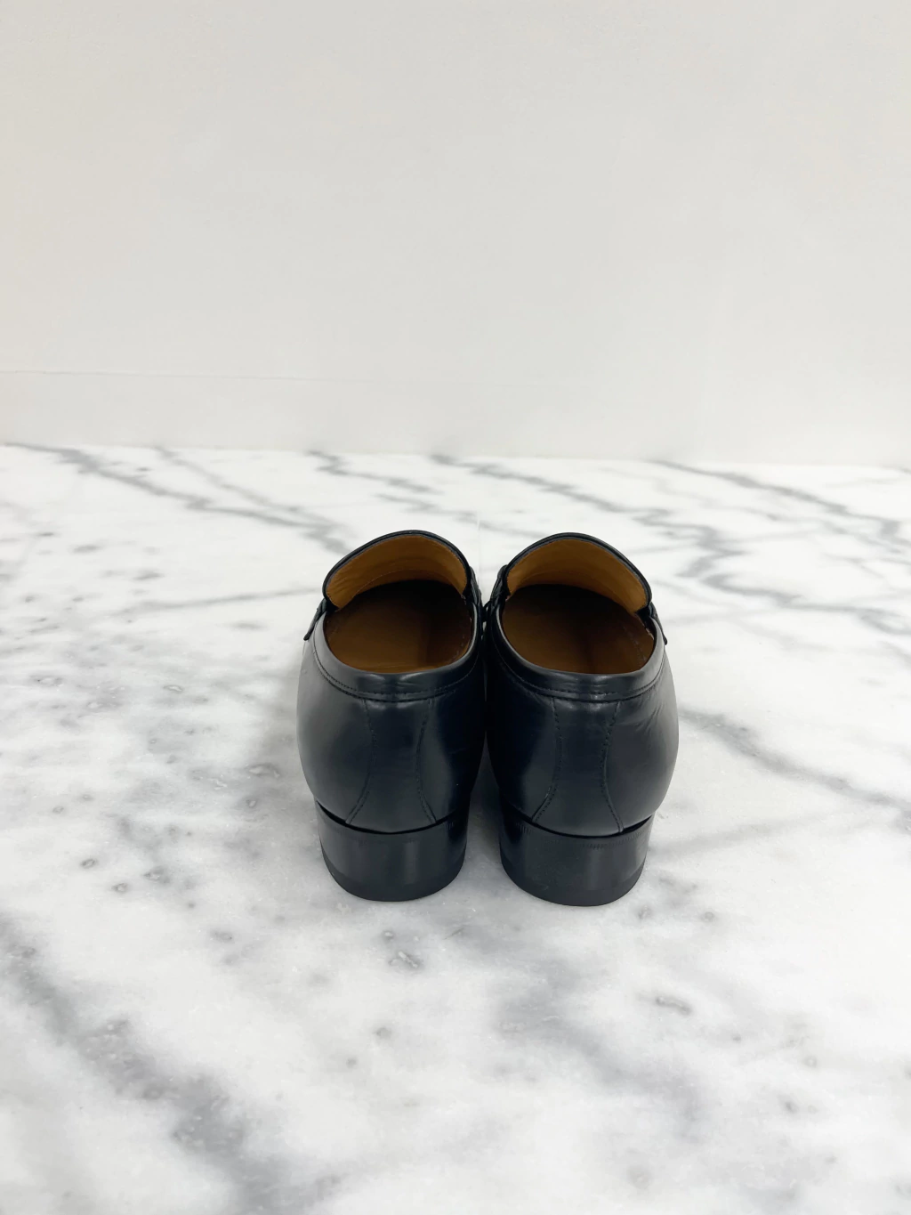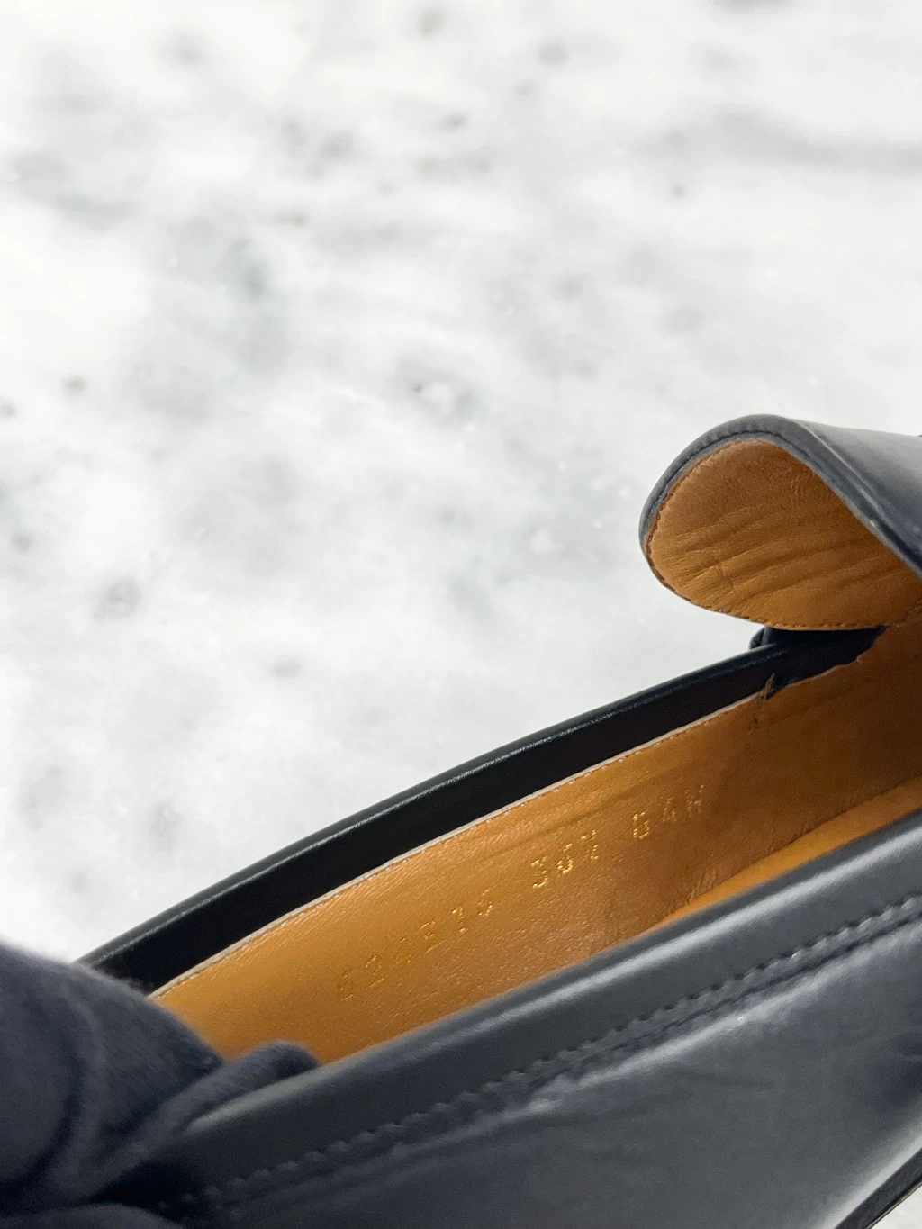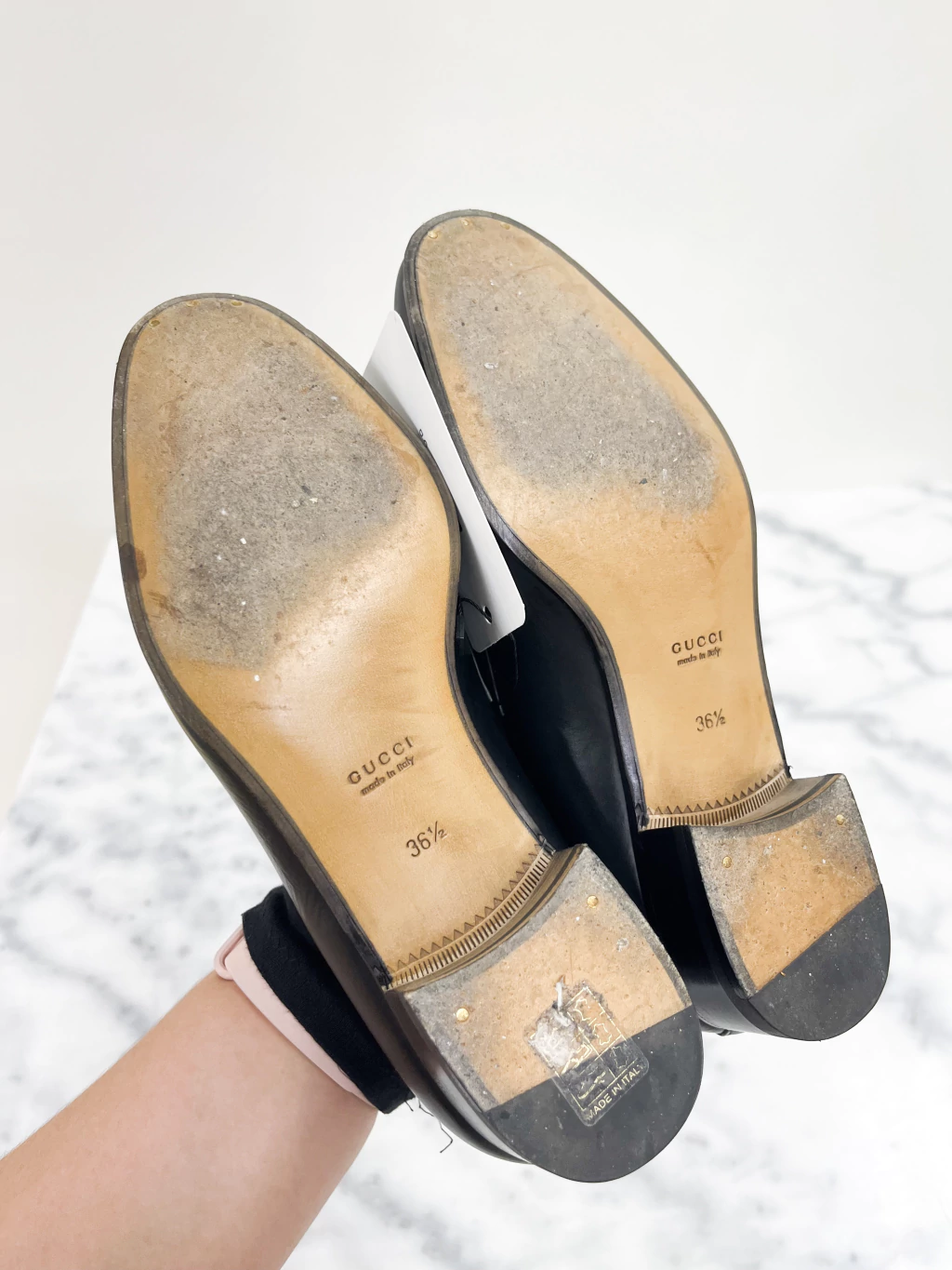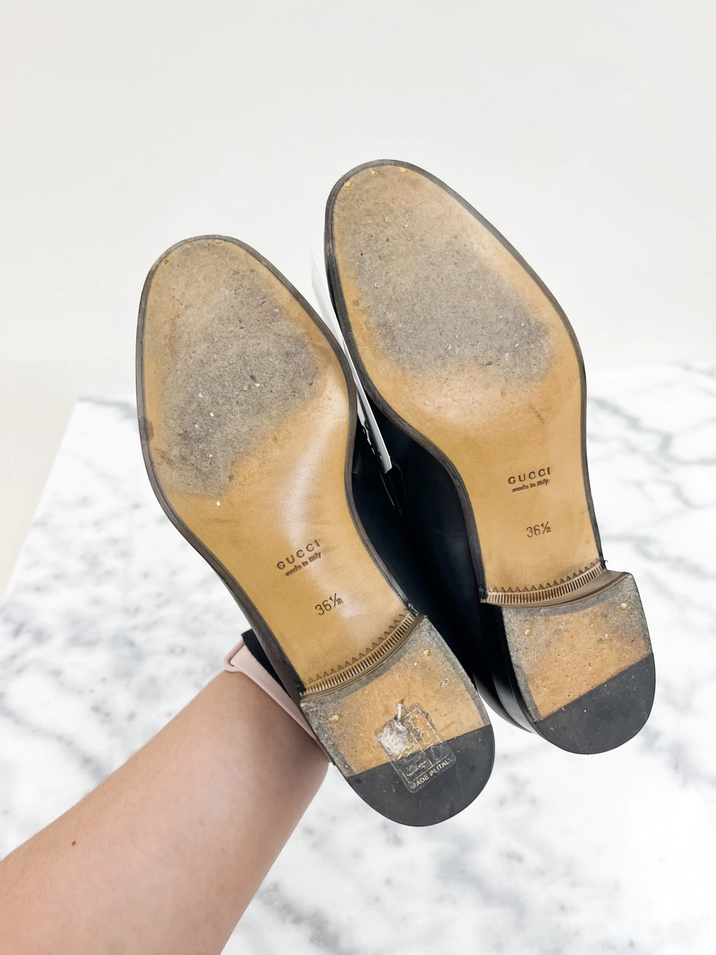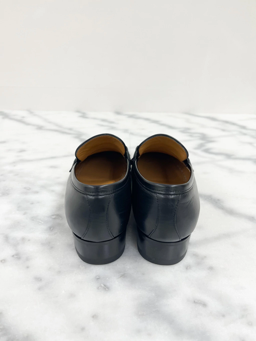 Mocassim Gucci Interlocking GG de couro preto, detalhe frontal em faixa web, tassel e logo frontal com ferragens douradas.