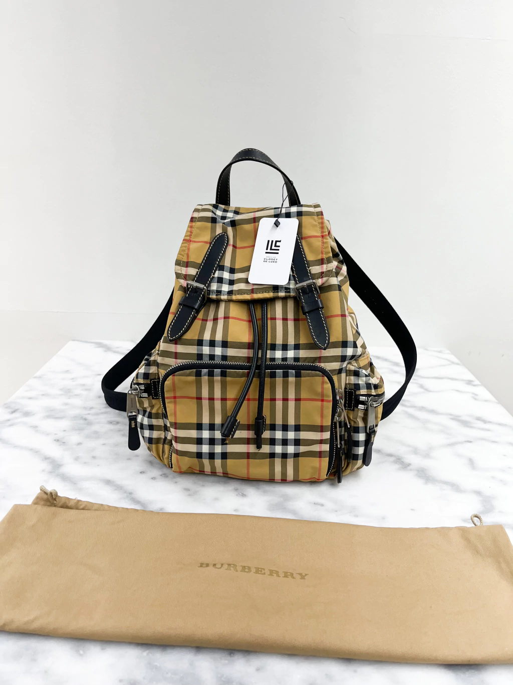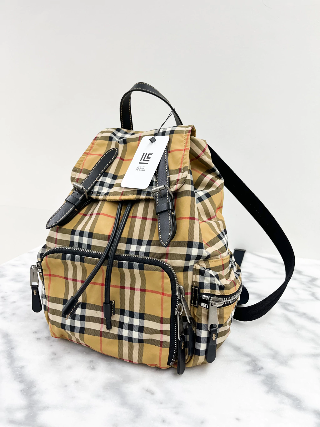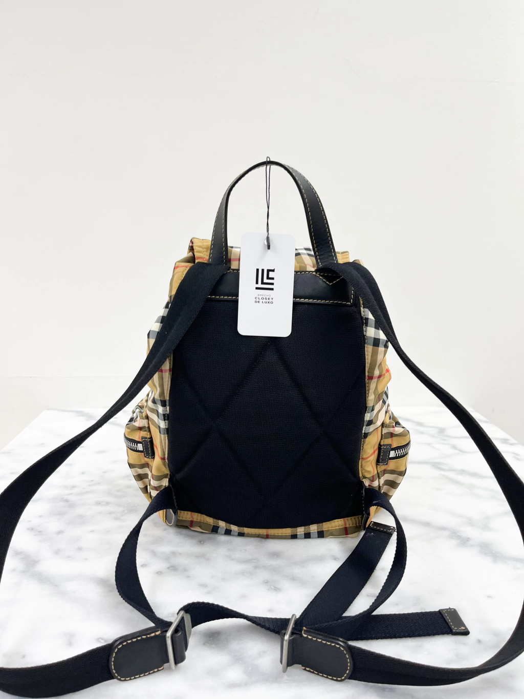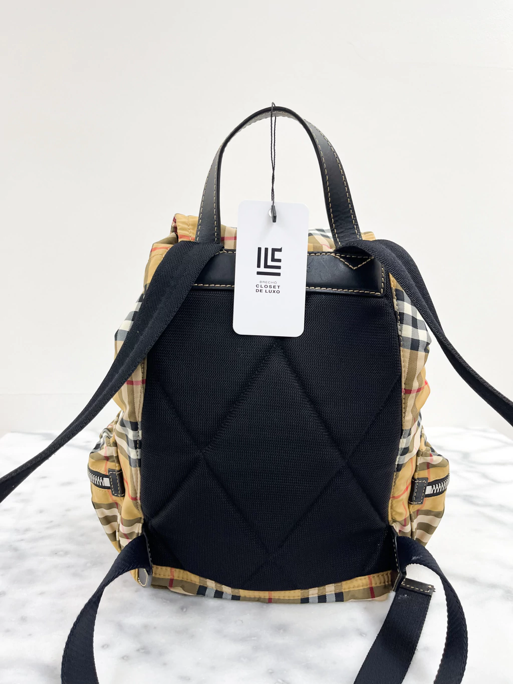 Exterior: Mochila Burberry Medium Rucksack Check de tecido nylon xadrez, couro preto, 3 bolsos externos com zíper e ferragens prateadas - Possui alça de mão, alça de costas ajustável e fechamento por cordão e botão de pressão.