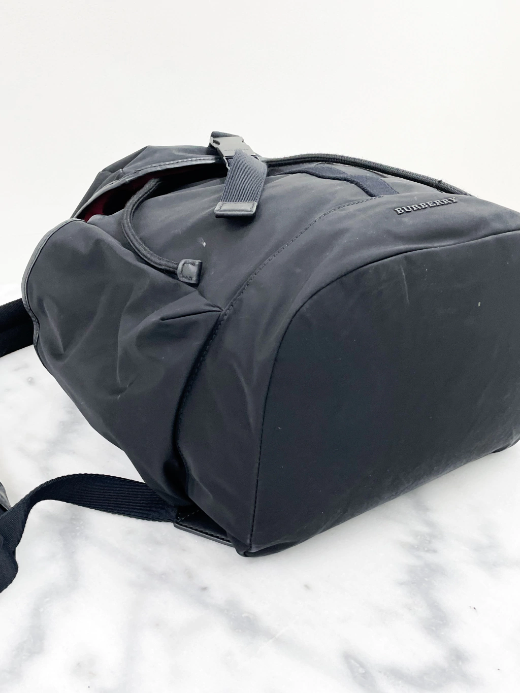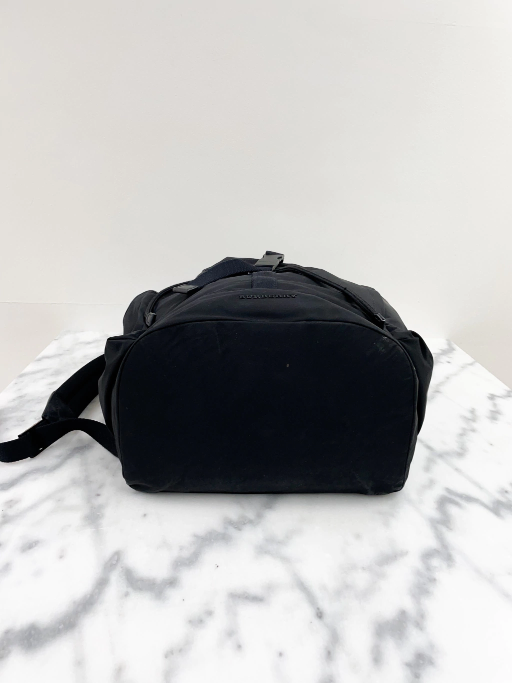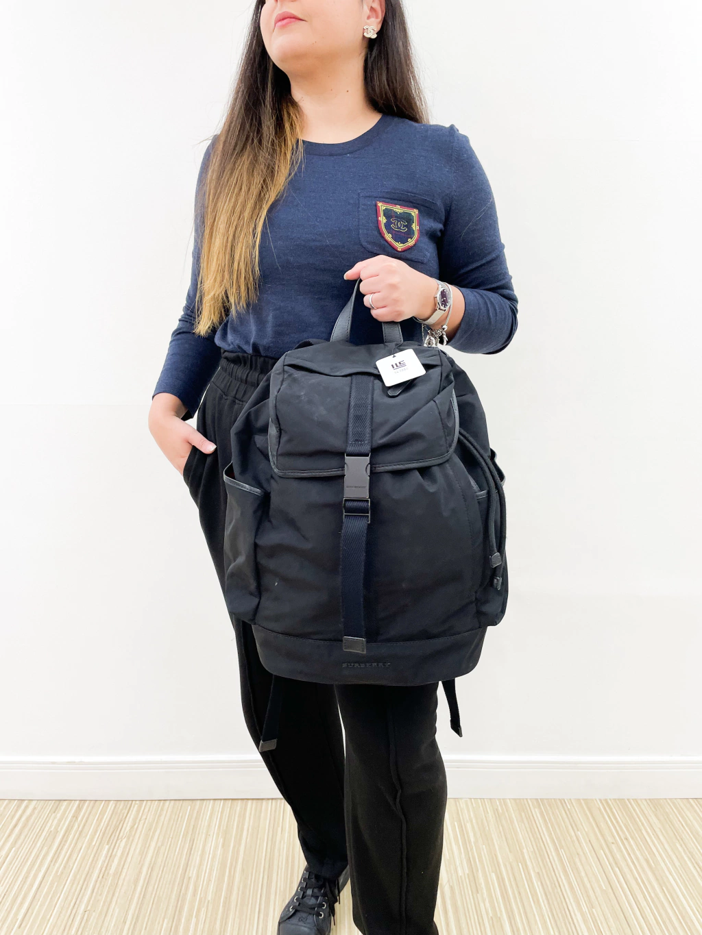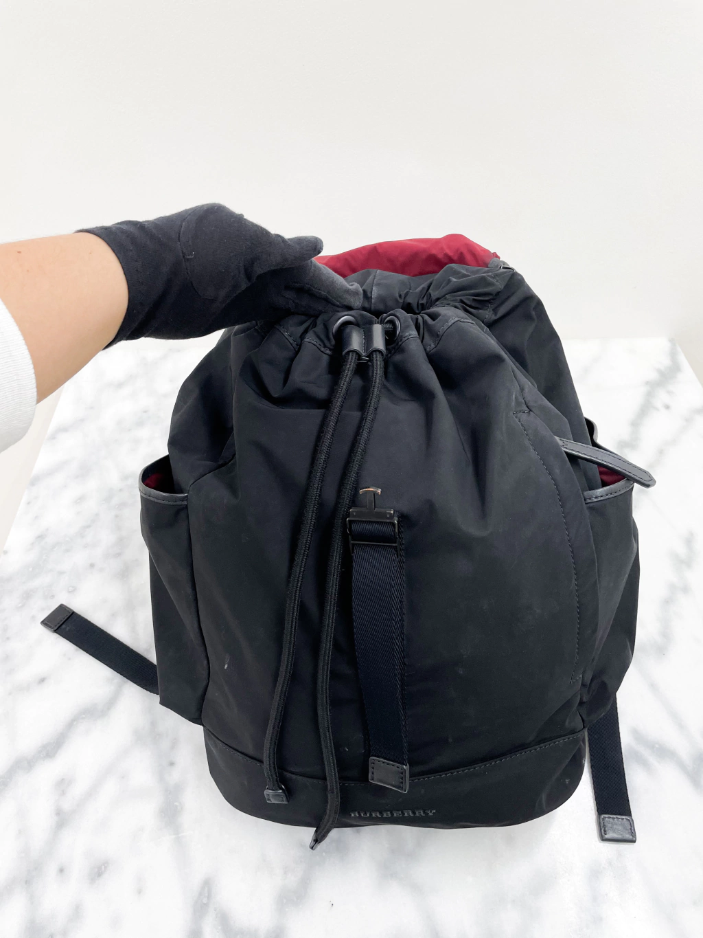 Exterior: Mochila Burberry Nylon Drawstring de tecido nylon na cor preta, logo frontal e ferragens prateadas - Possui alça de mão, alça dupla de costas e fechamento por corda e fivela.