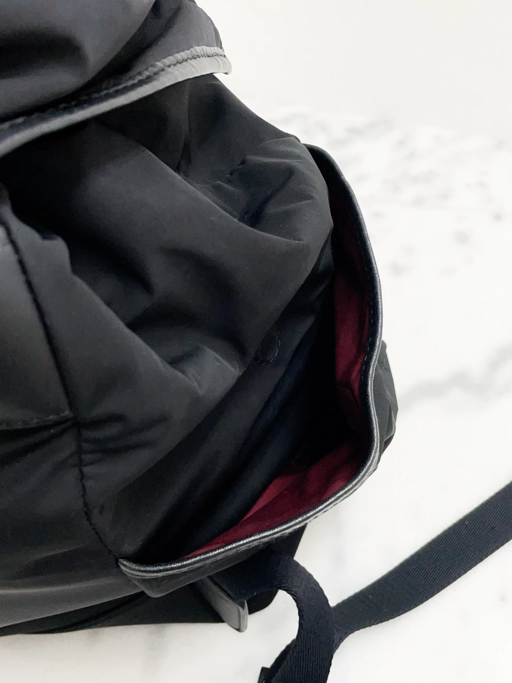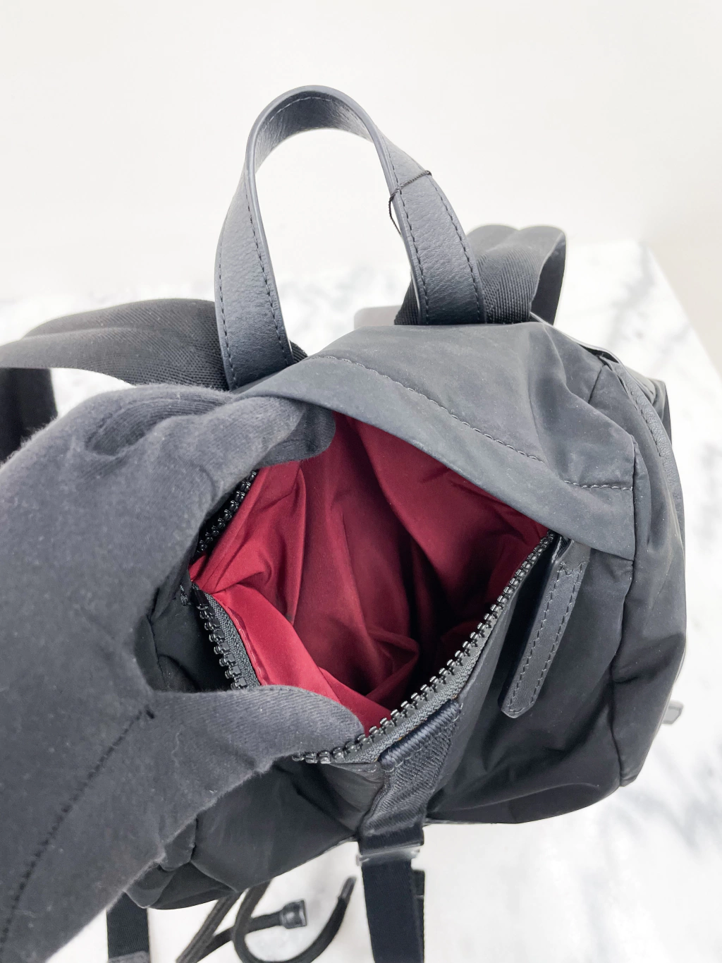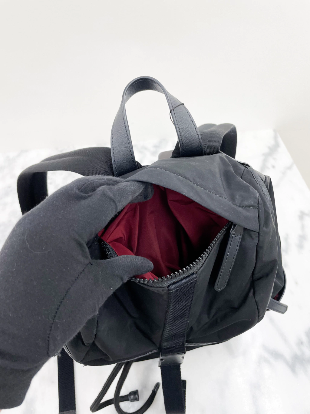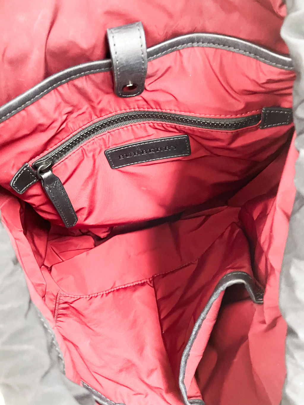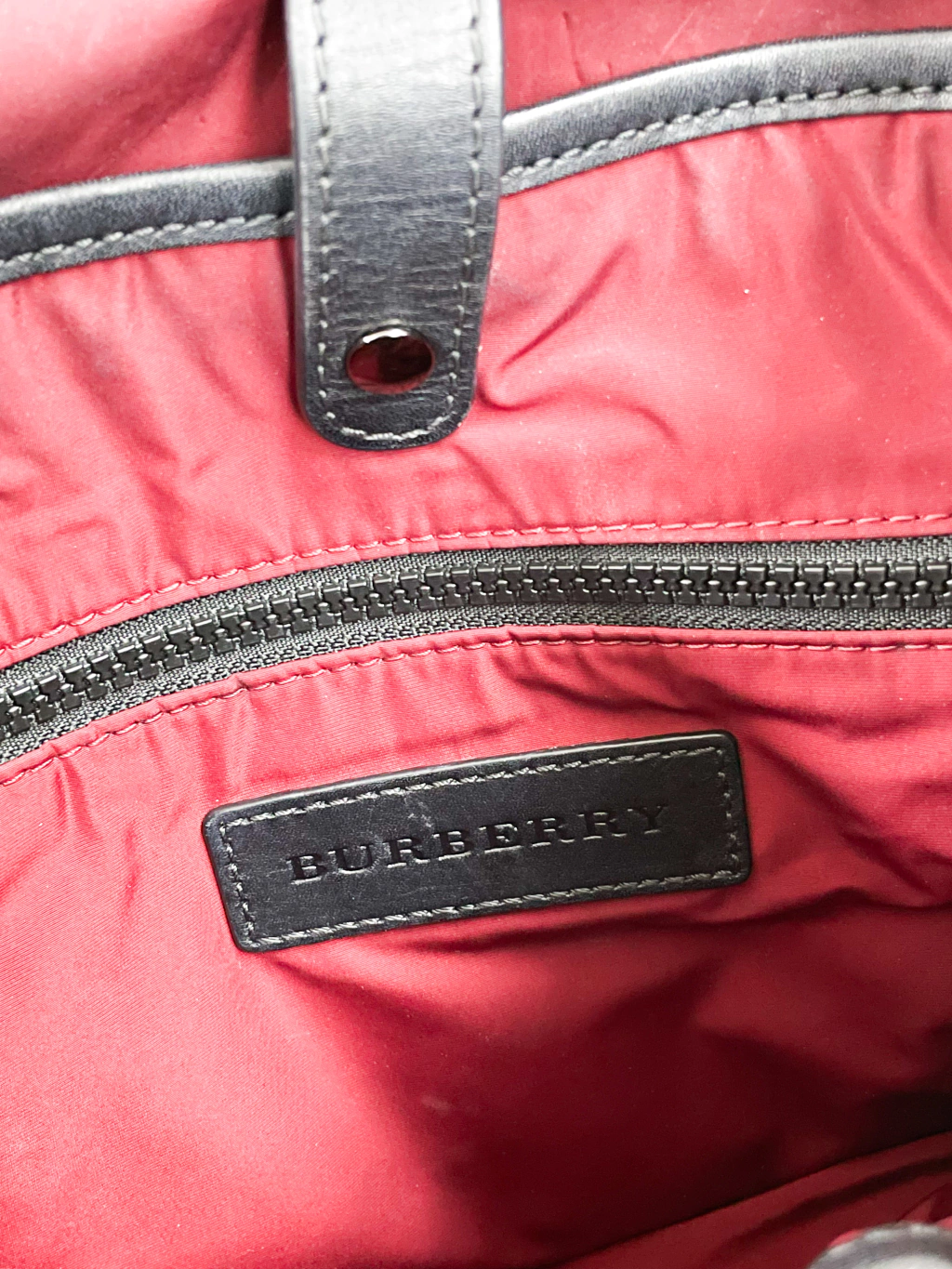 Exterior: Mochila Burberry Nylon Drawstring de tecido nylon na cor preta, logo frontal e ferragens prateadas - Possui alça de mão, alça dupla de costas e fechamento por corda e fivela.