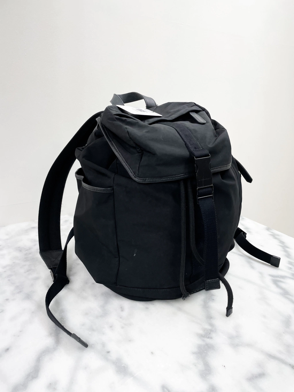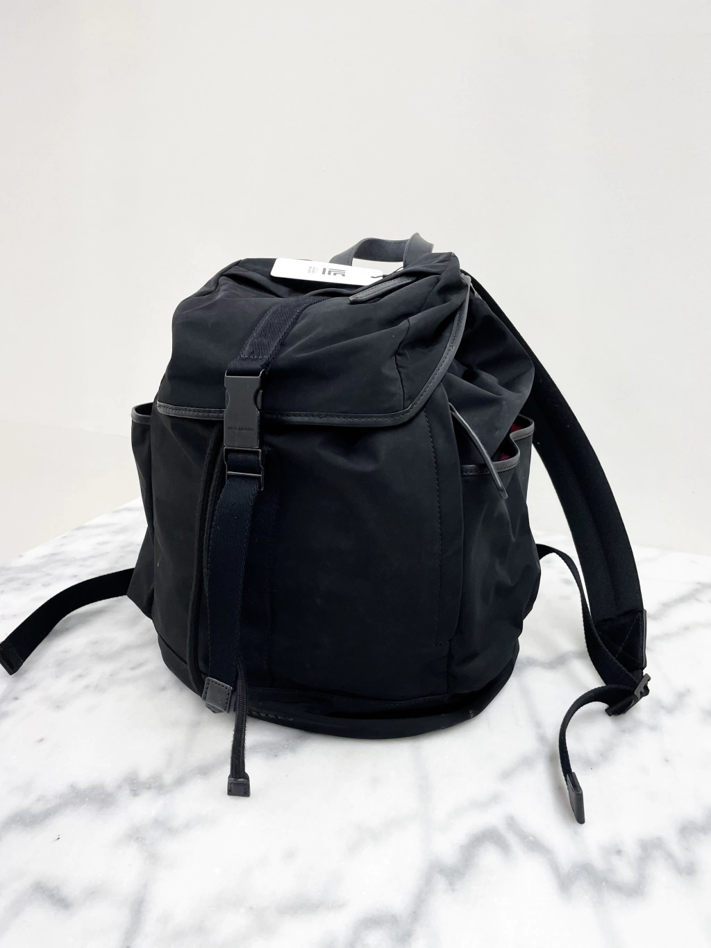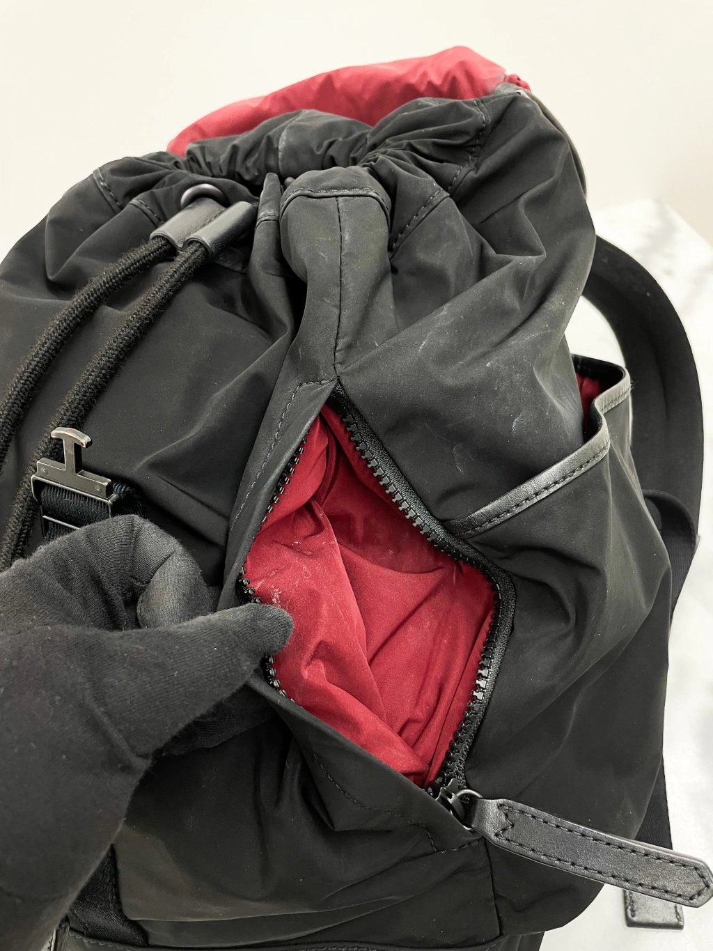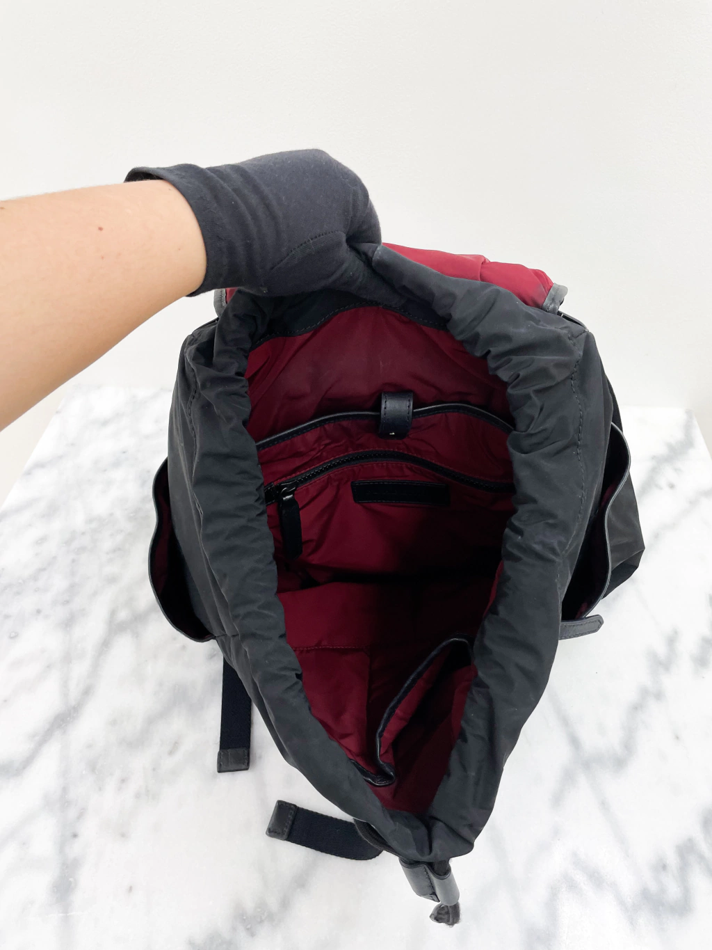 Exterior: Mochila Burberry Nylon Drawstring de tecido nylon na cor preta, logo frontal e ferragens prateadas - Possui alça de mão, alça dupla de costas e fechamento por corda e fivela.
