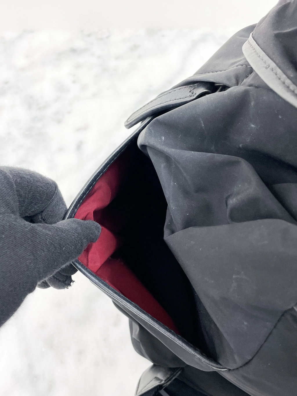 Usado - Apresenta tecido externo desbotado e manchas brancas no forro dos bolsos externos.