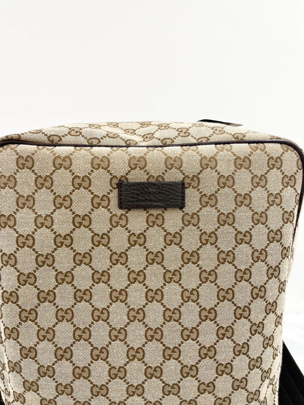 Exterior: Mochila Gucci GG Supreme de tecido jacquard com estampa monograma, couro marrom, logo frontal e ferragens prateadas - Possui alça de mão, alça dupla de costas (ajustável) e fechamento por zíper.