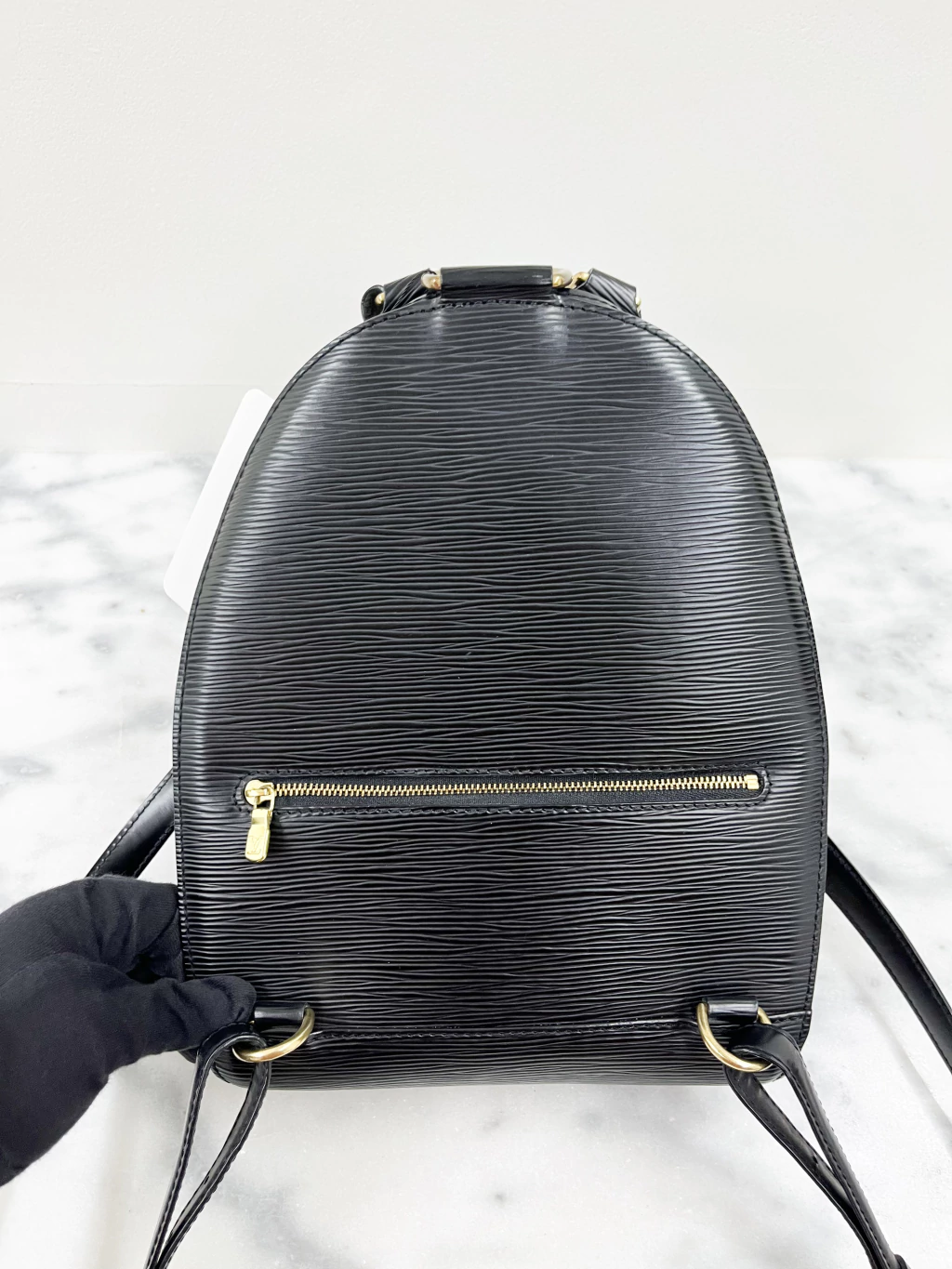 Exterior: Mochila Louis Vuitton Mabillon de couro epi preto, logo frontal em baixo relevo e ferragens douradas - Possui alça dupla de costas e fechamento por zíper.