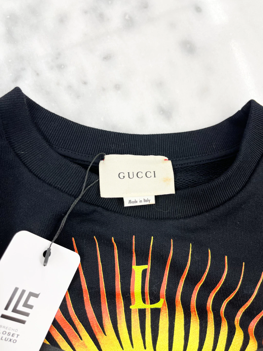 Moletom Gucci Cotton de tecido preto com estampa frontal de gato.