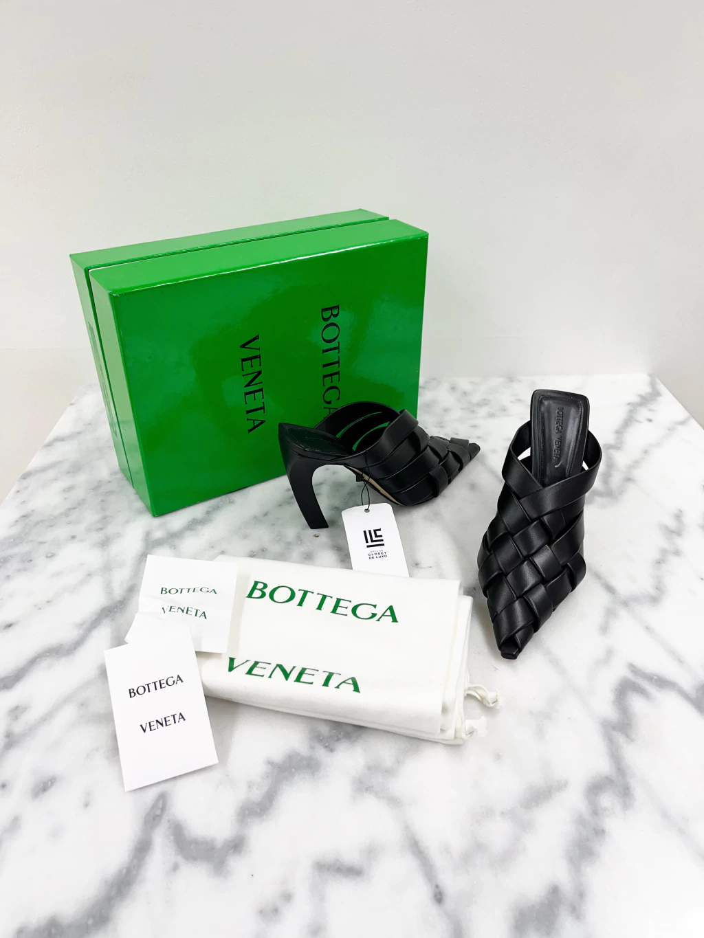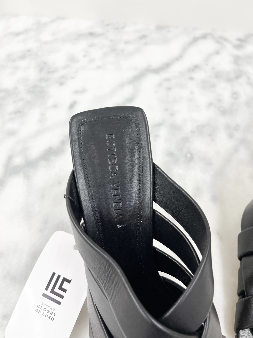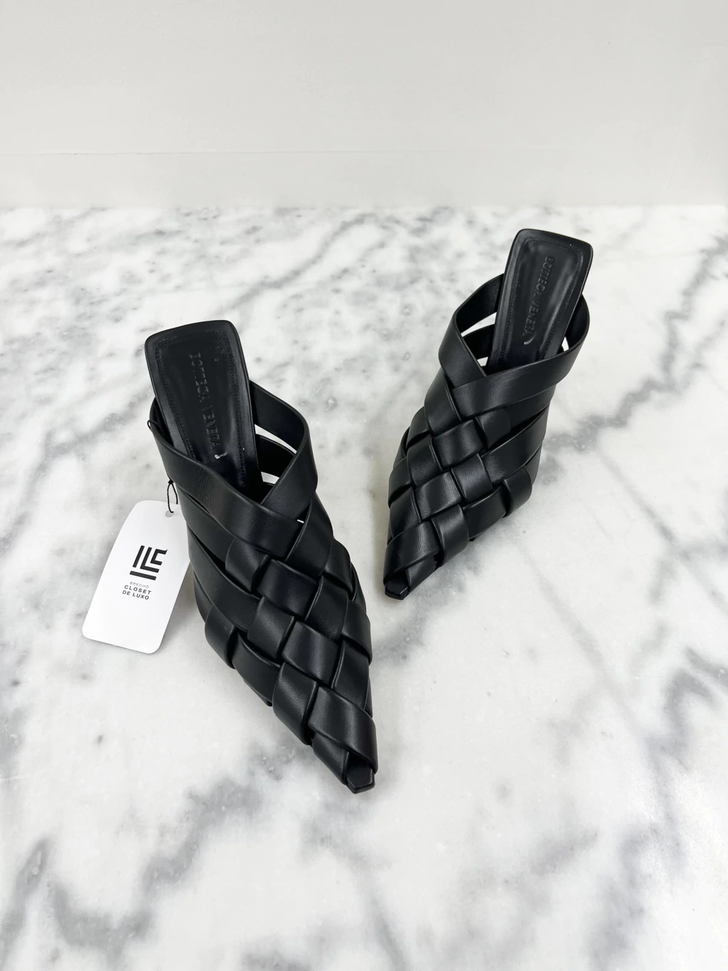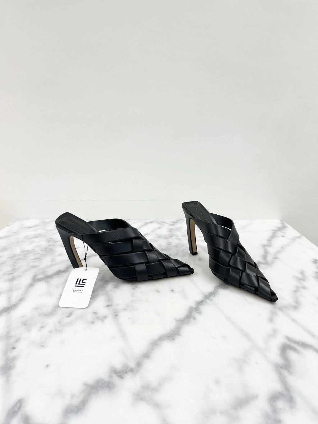 Mule Bottega Veneta Alfie de couro preto e salto alto fino.