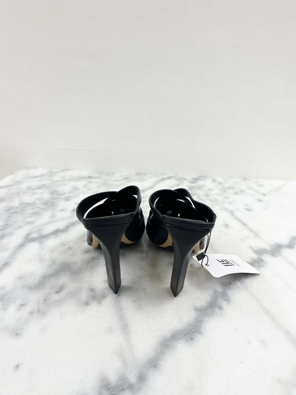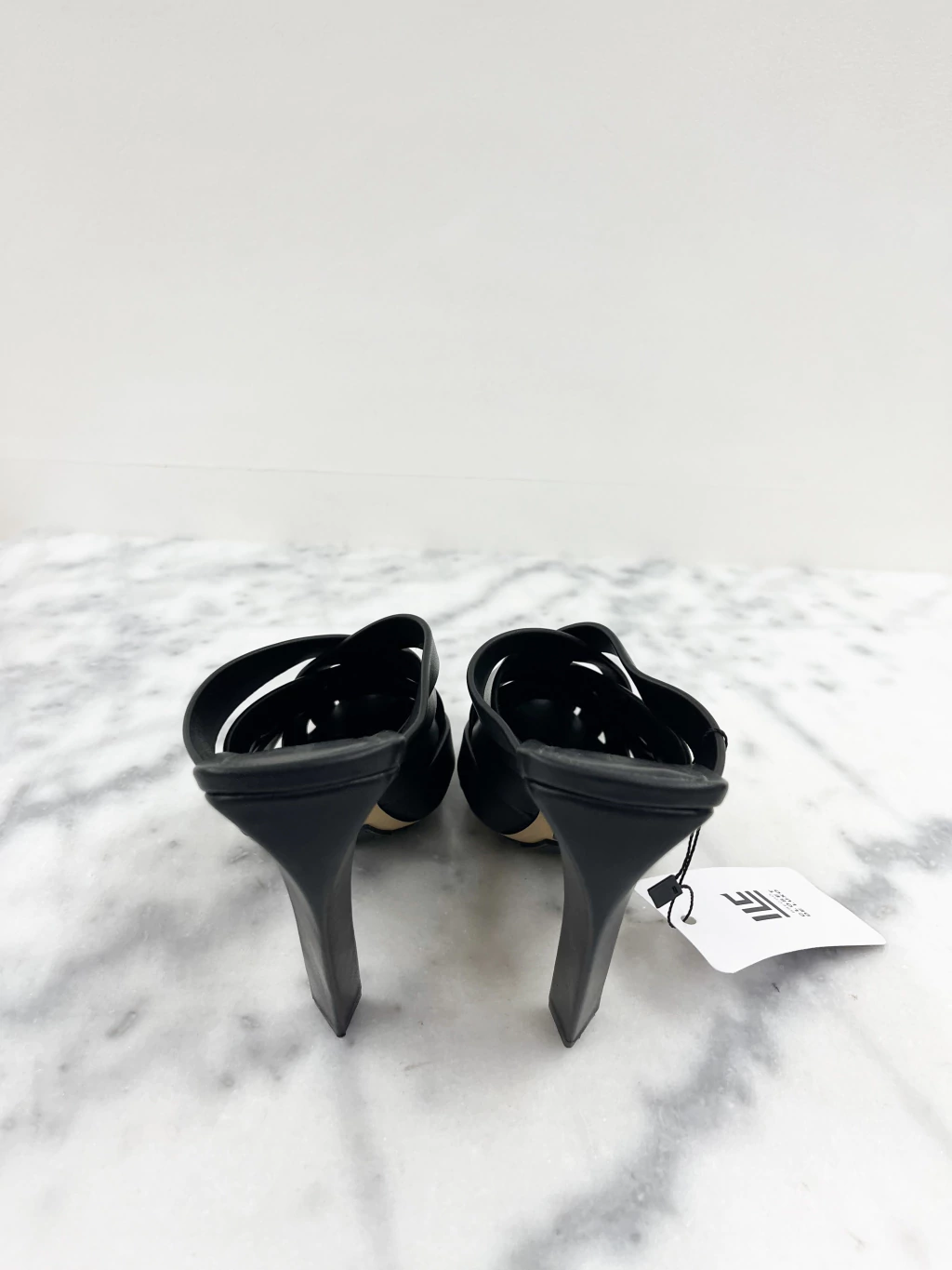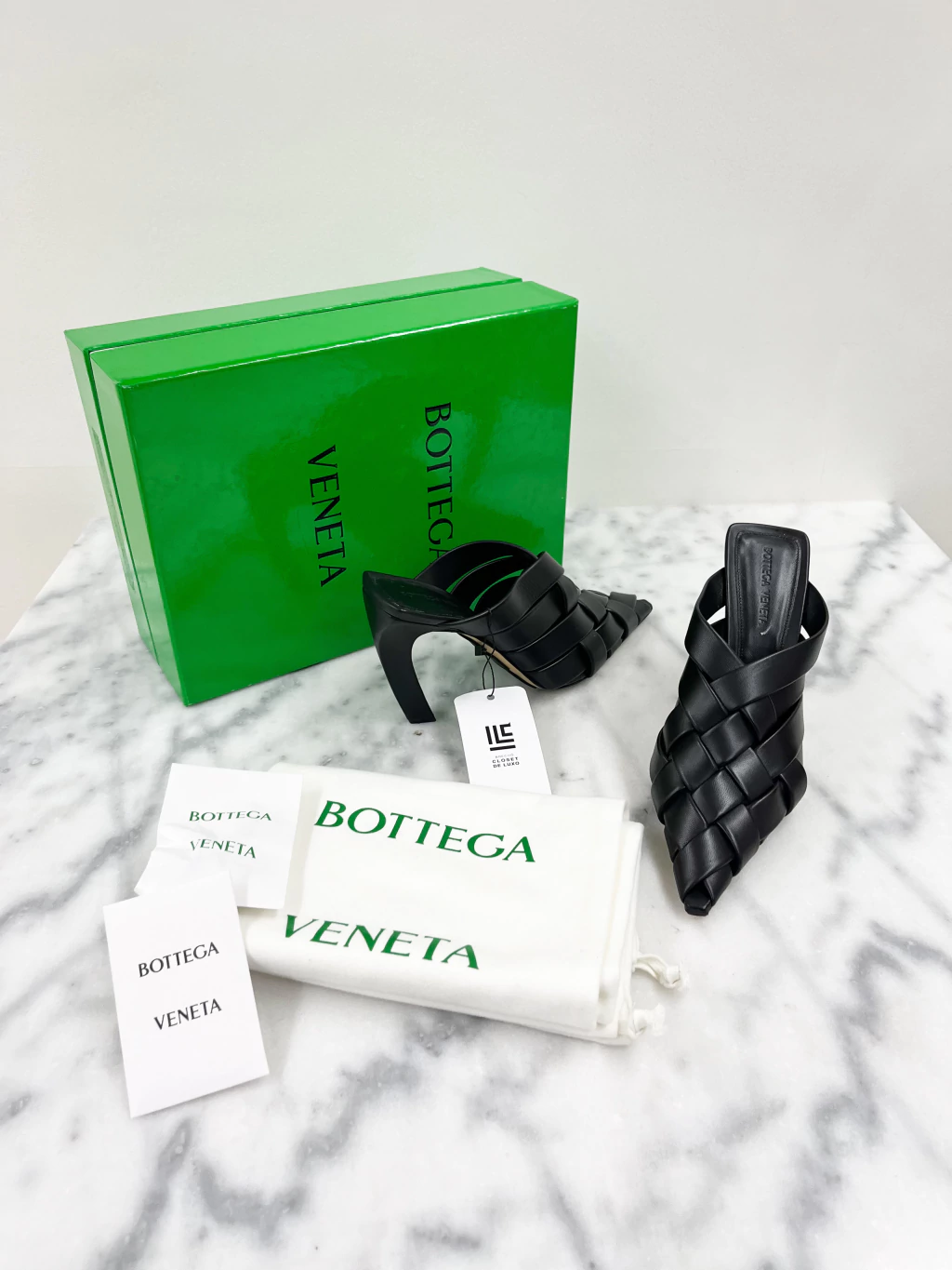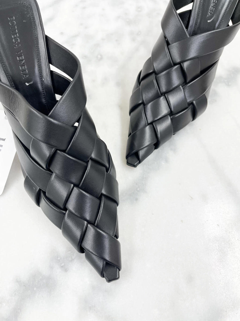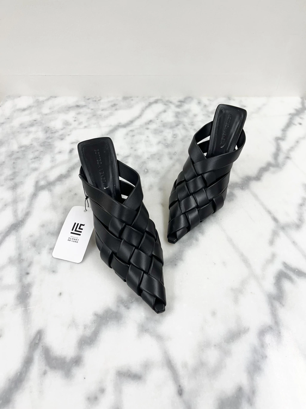 Mule Bottega Veneta Alfie de couro preto e salto alto fino.