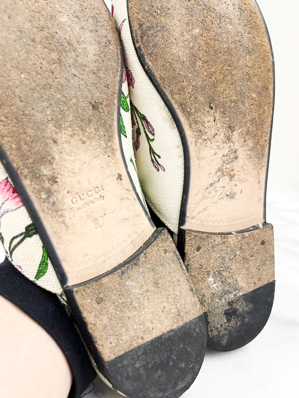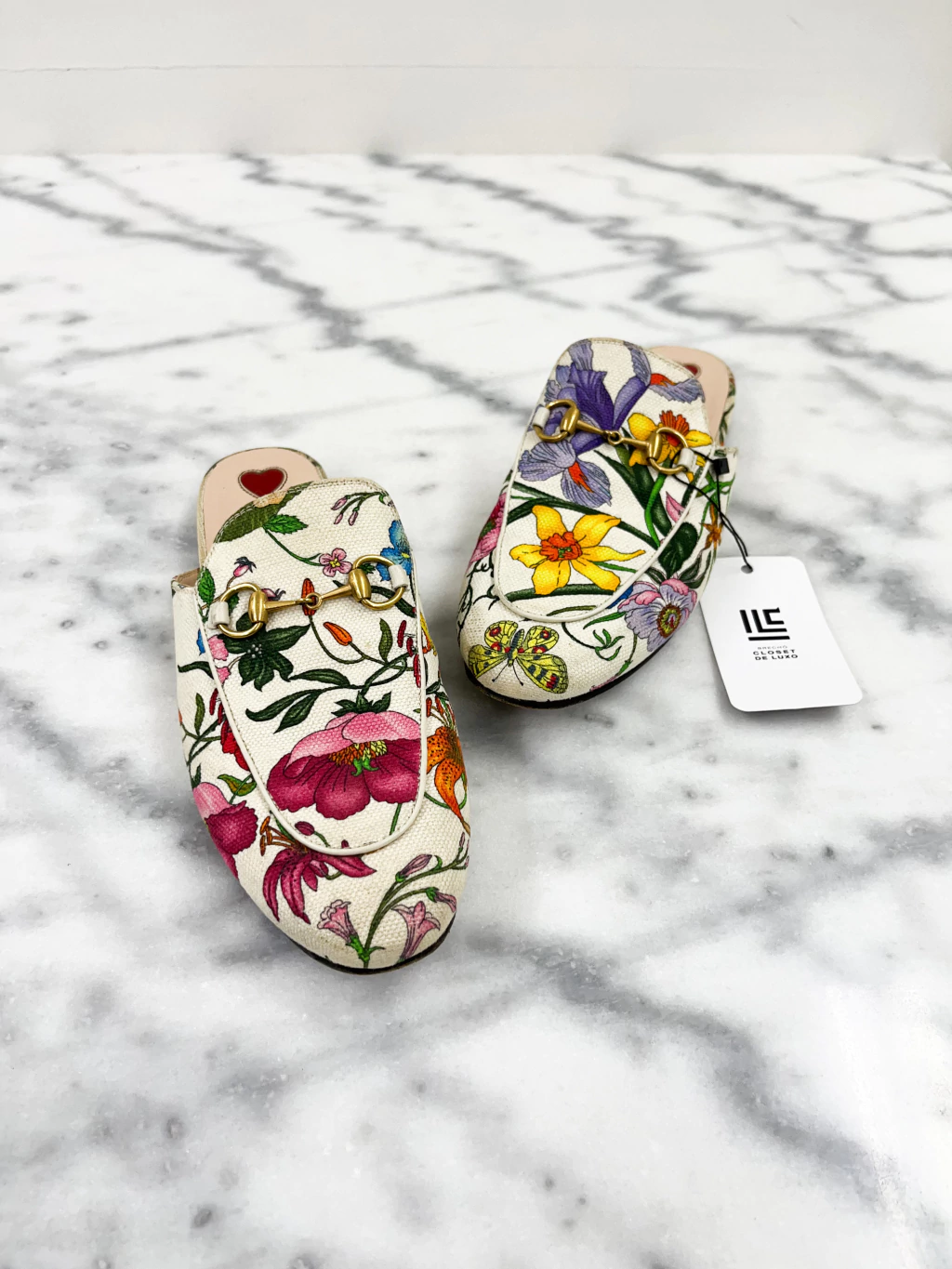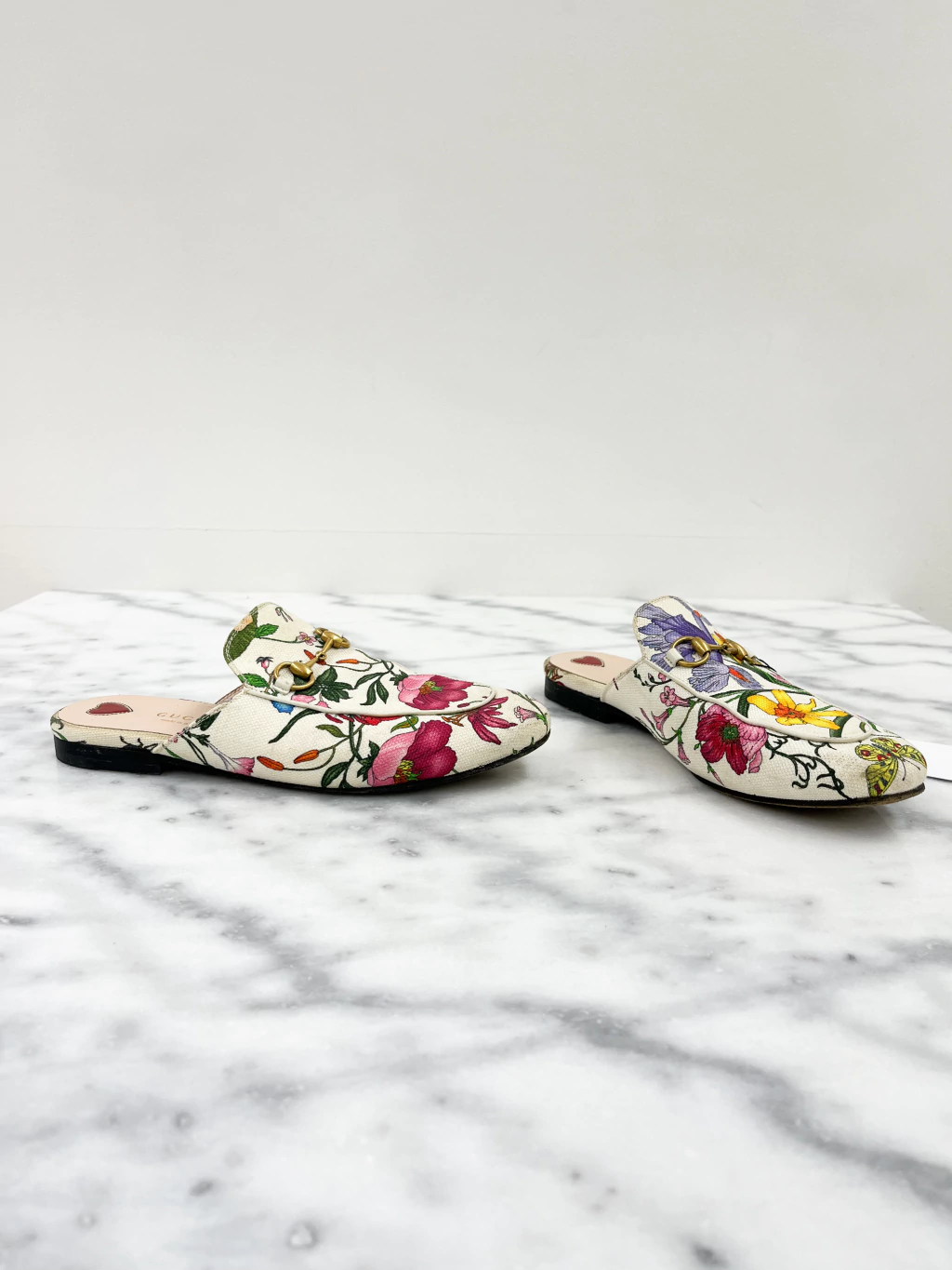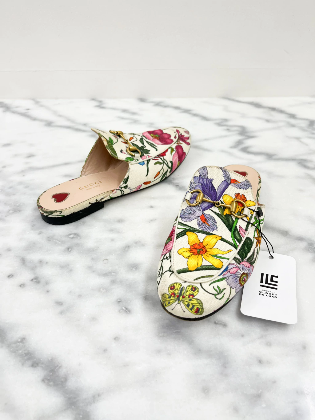 Mule Gucci Horsebit Princetown de tecido na cor off white com estampa de flores, logo frontal Horsebit e ferragens douradas.