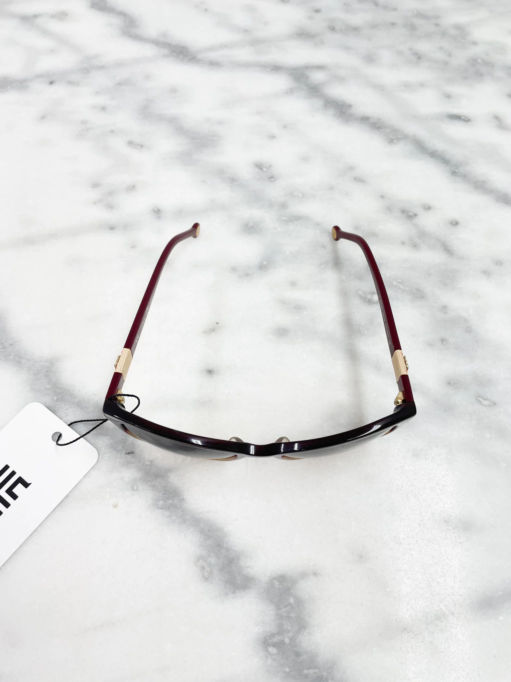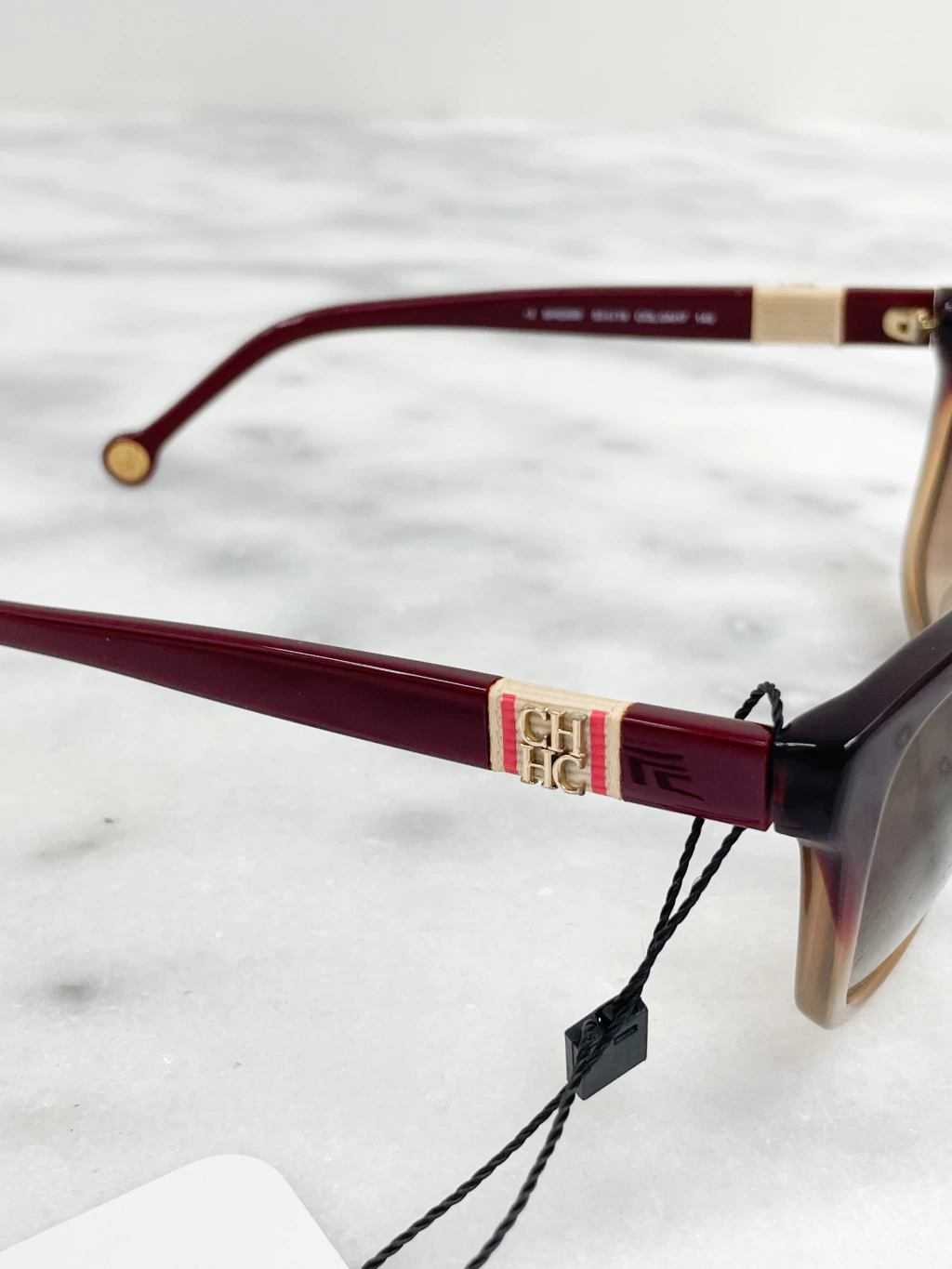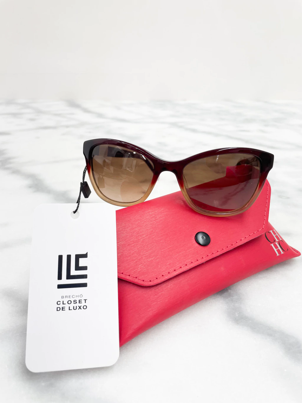 Óculos Carolina Herrera Gradient de acetato na cor vinho e marrom, armação dourada, lentes marrom levemente degradê, logo nas hastes e ferragens douradas.
