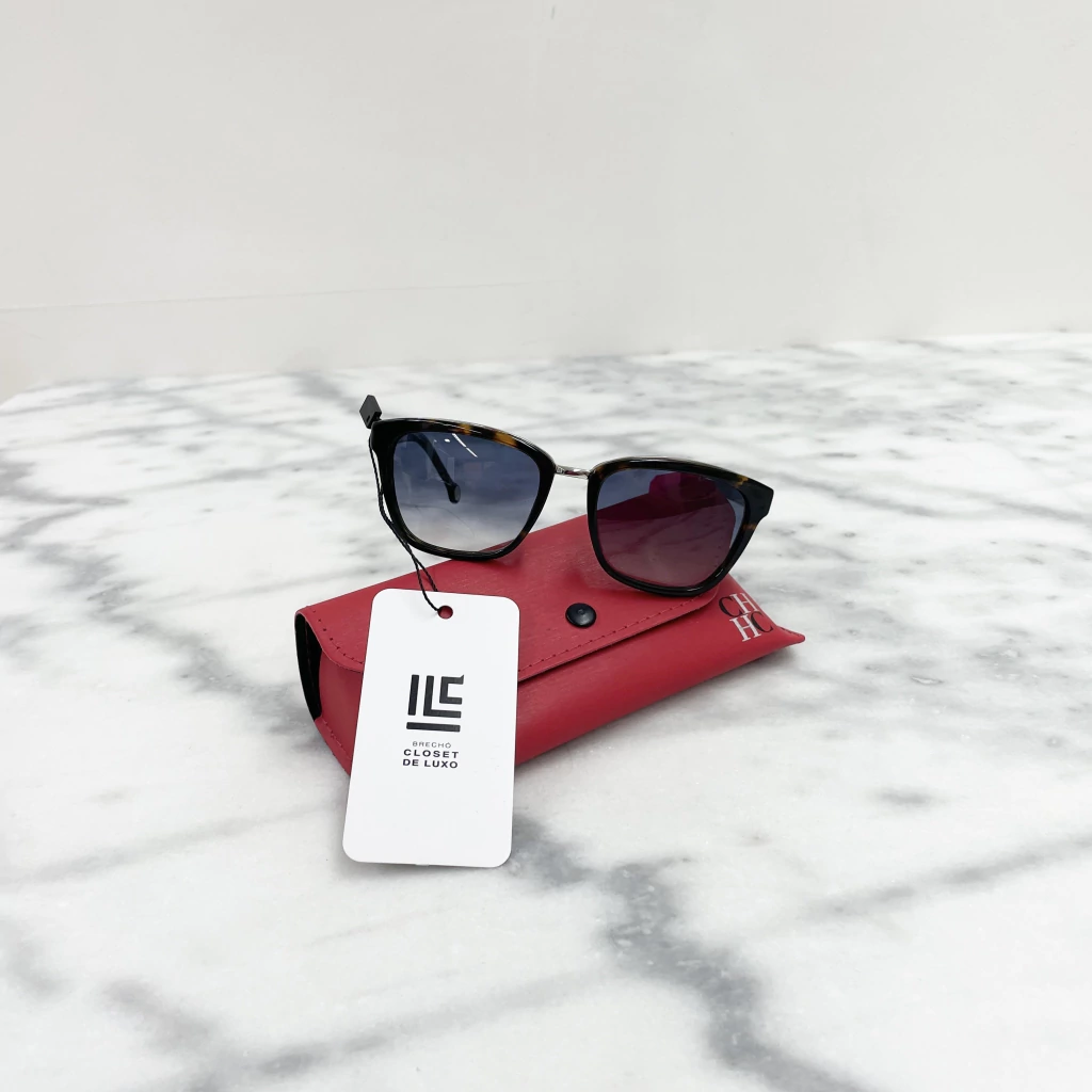 Óculos Carolina Herrera Tortoise Demi de acetato na cor marrom com estampa tartaruga, armação prateada, lentes pretas levemente degradê, logo nas hastes e ferragens prateadas.