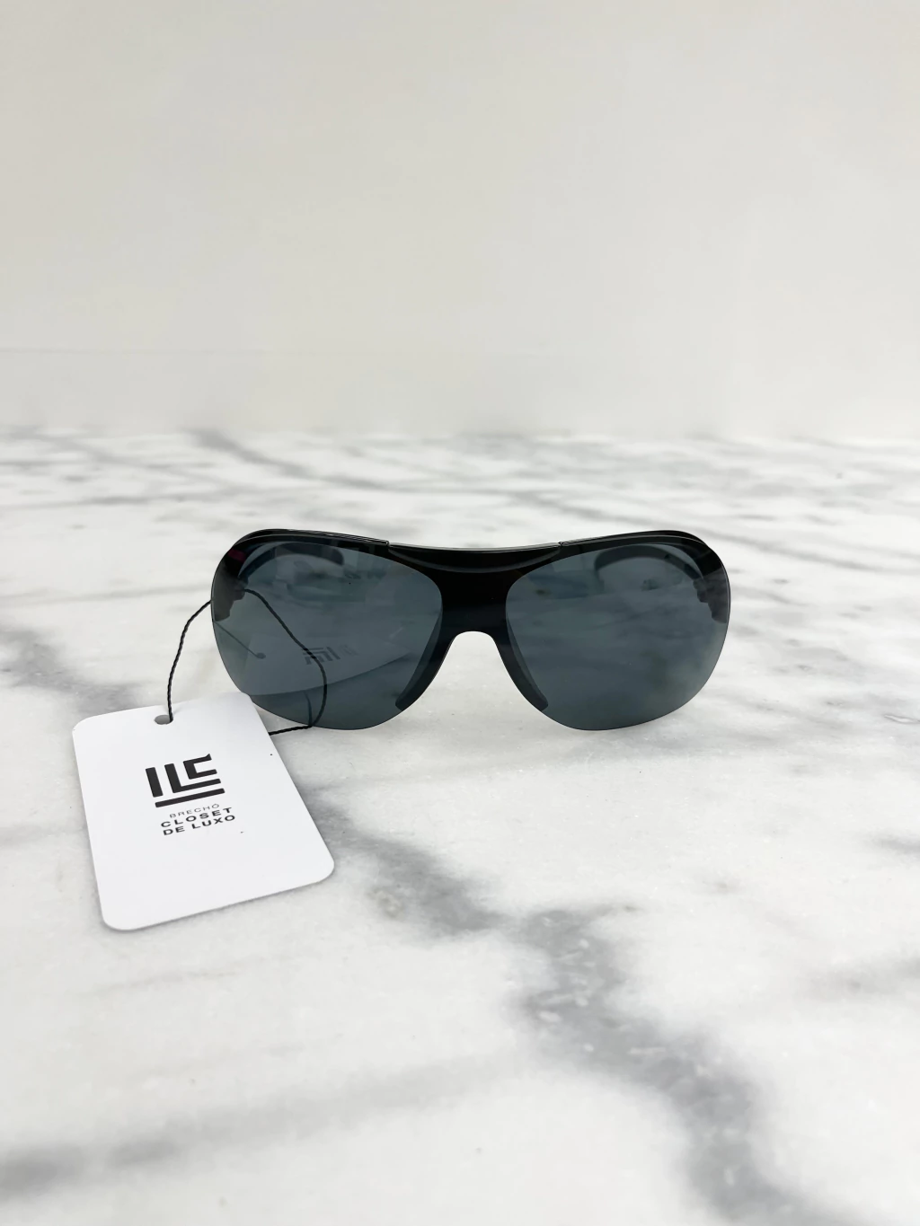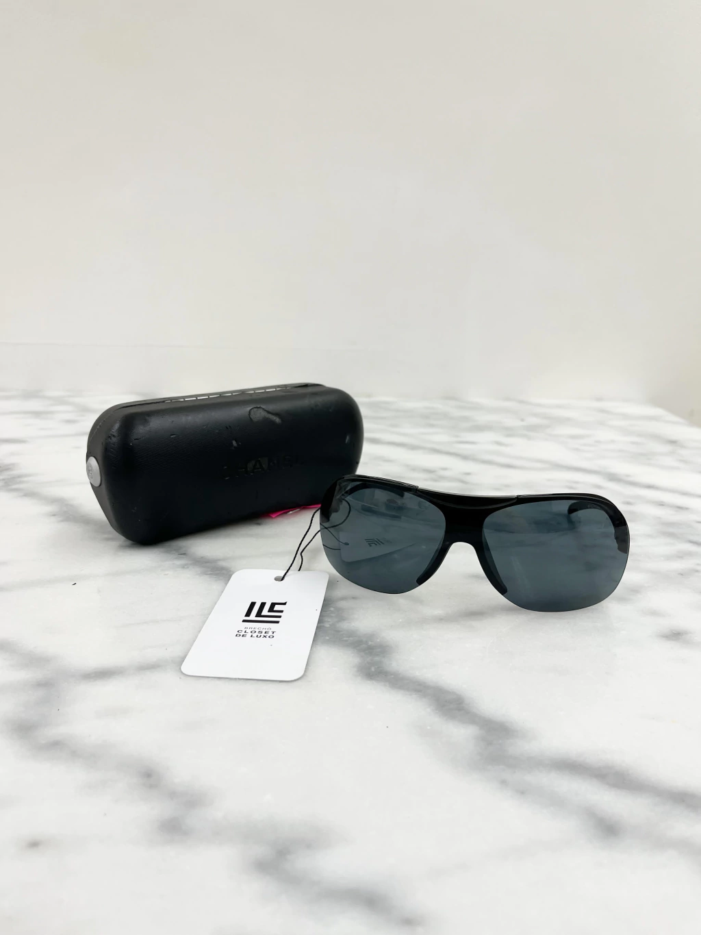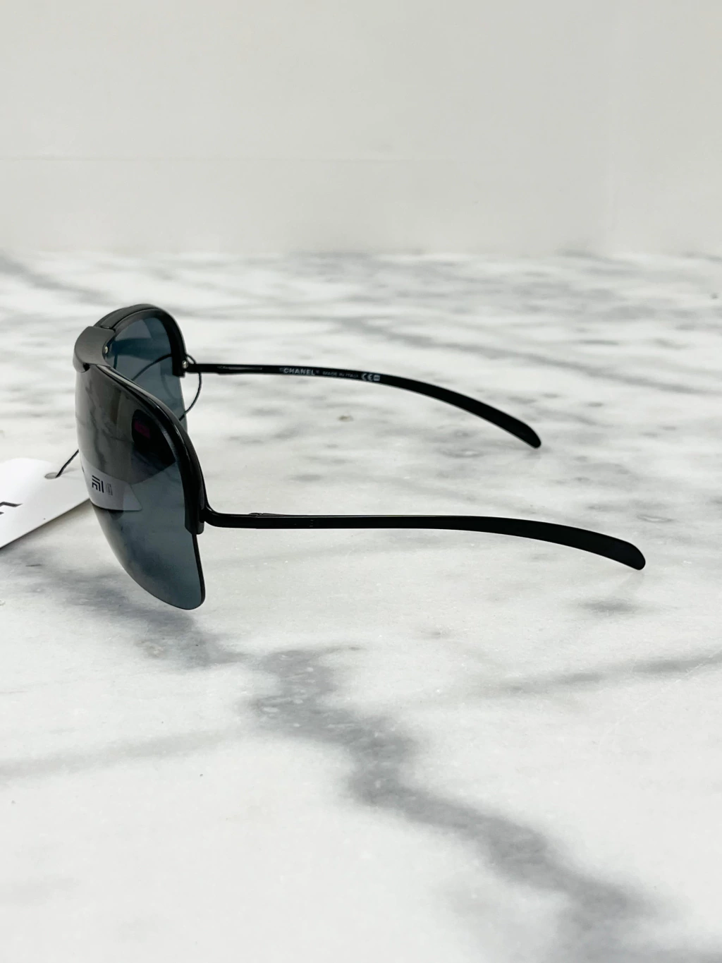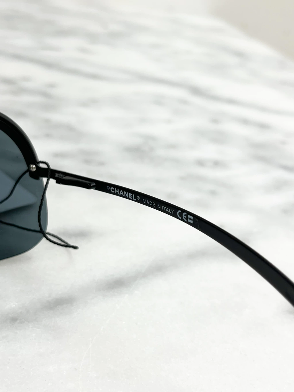 Óculos Chanel Shield Aviator de acetato preto, logo nas bordas e nas hastes, lentes pretas e ferragens prateadas.