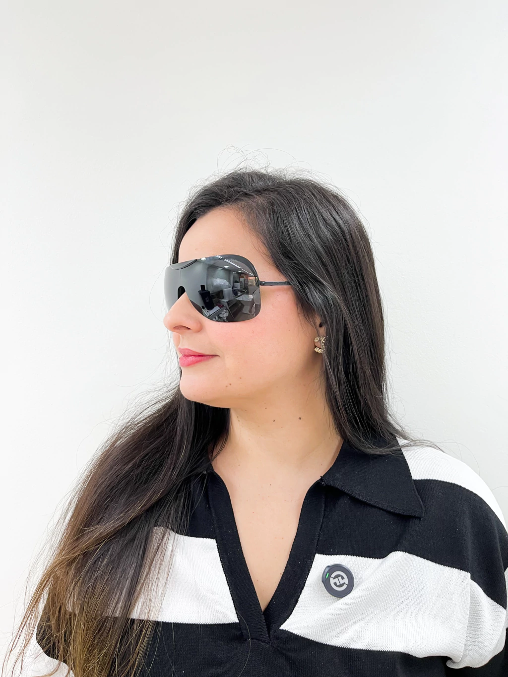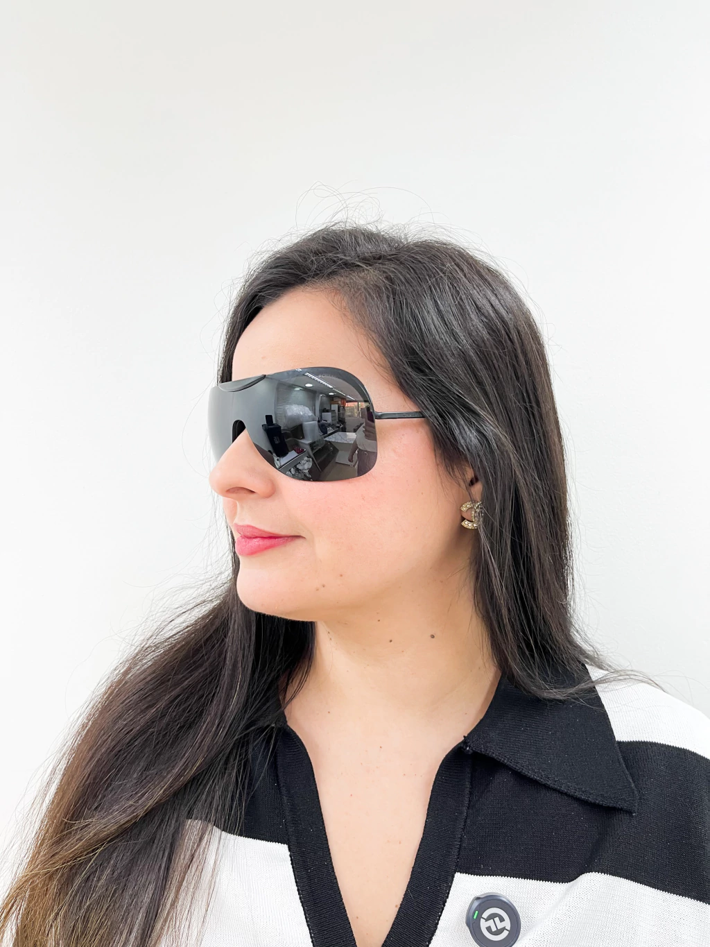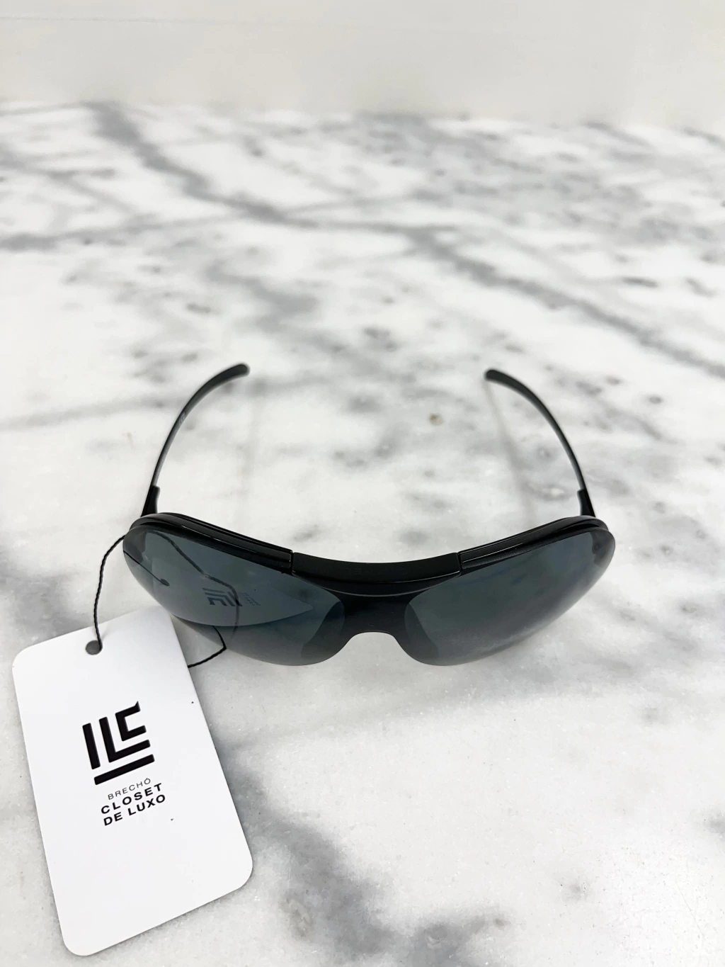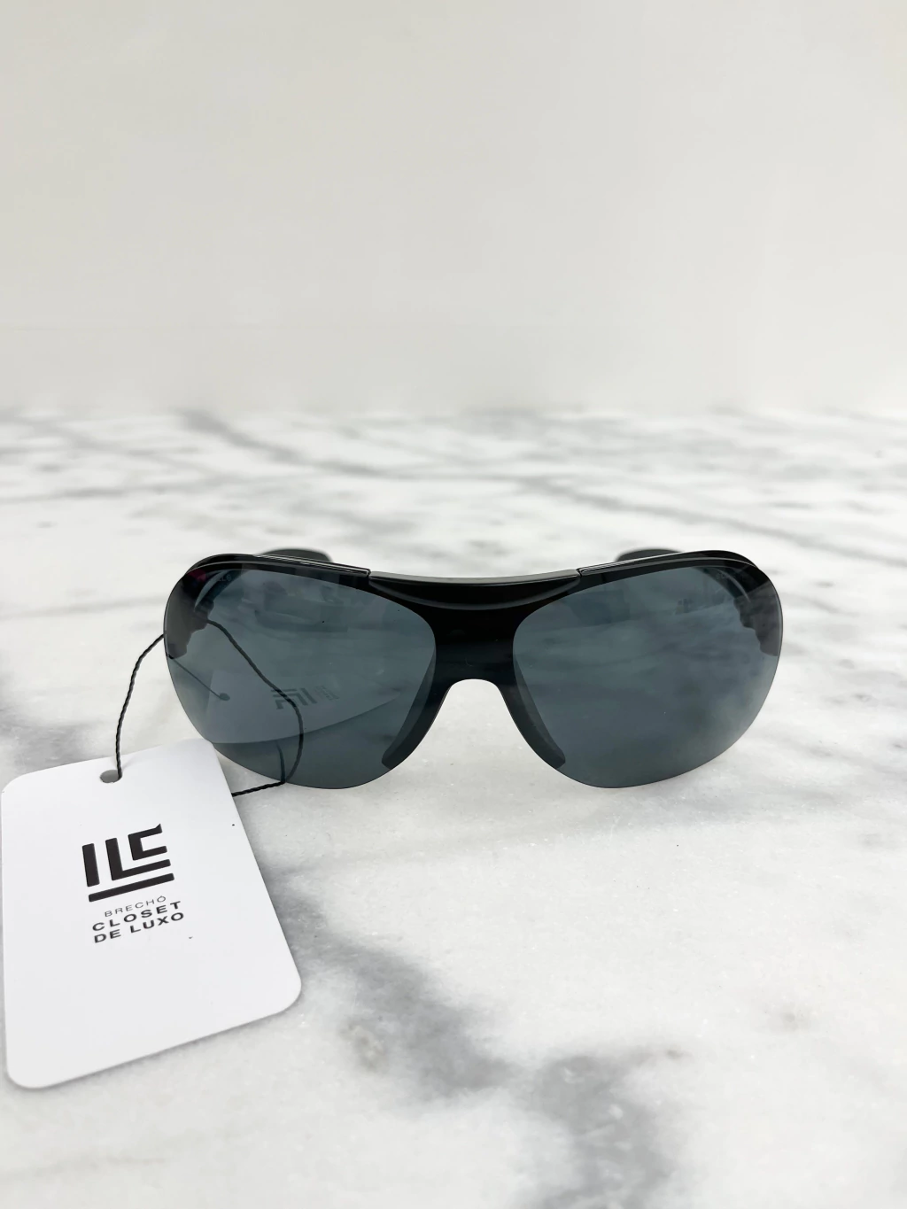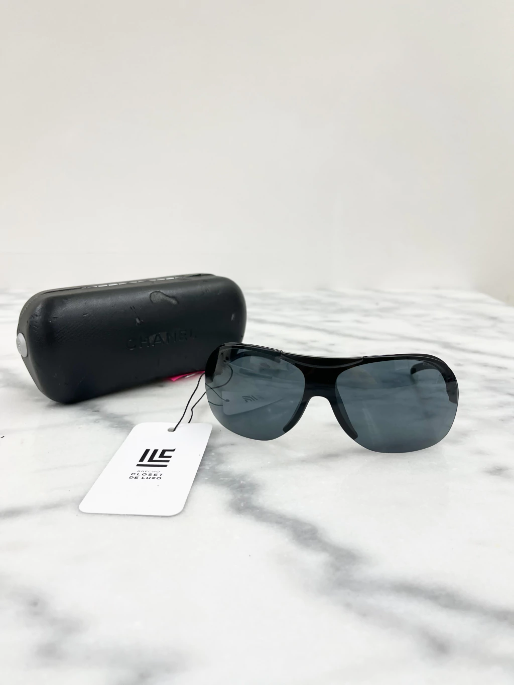 Óculos Chanel Shield Aviator de acetato preto, logo nas bordas e nas hastes, lentes pretas e ferragens prateadas.
