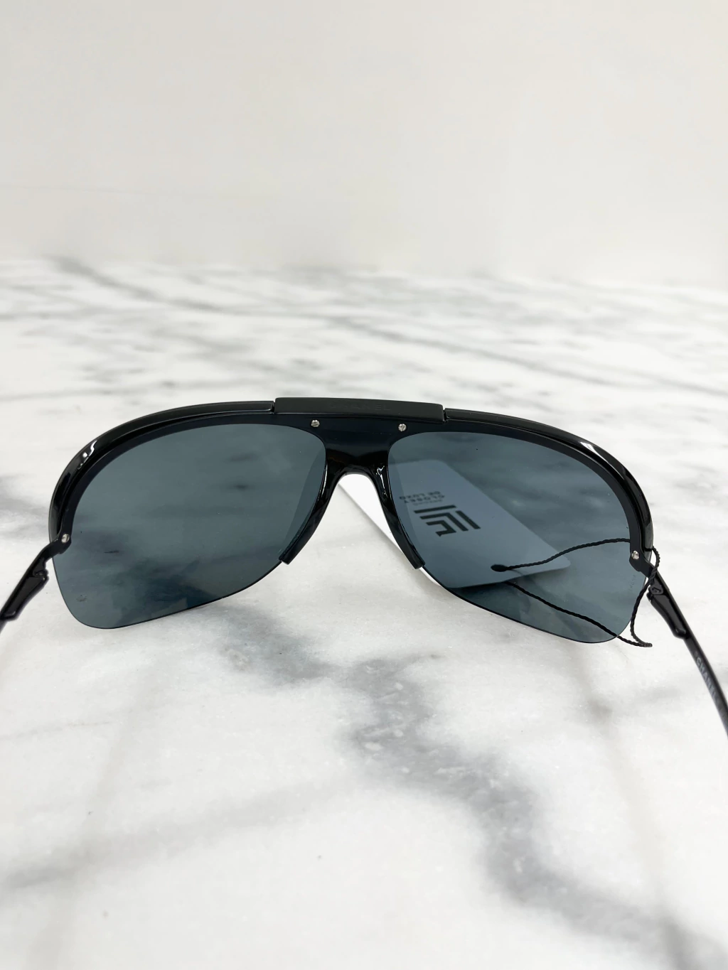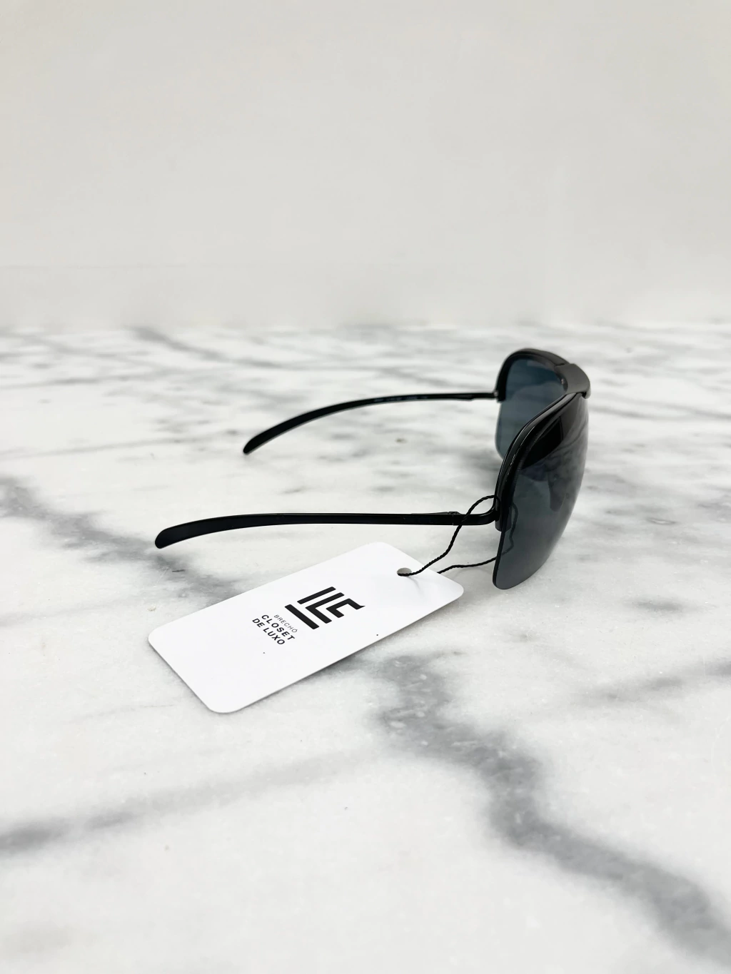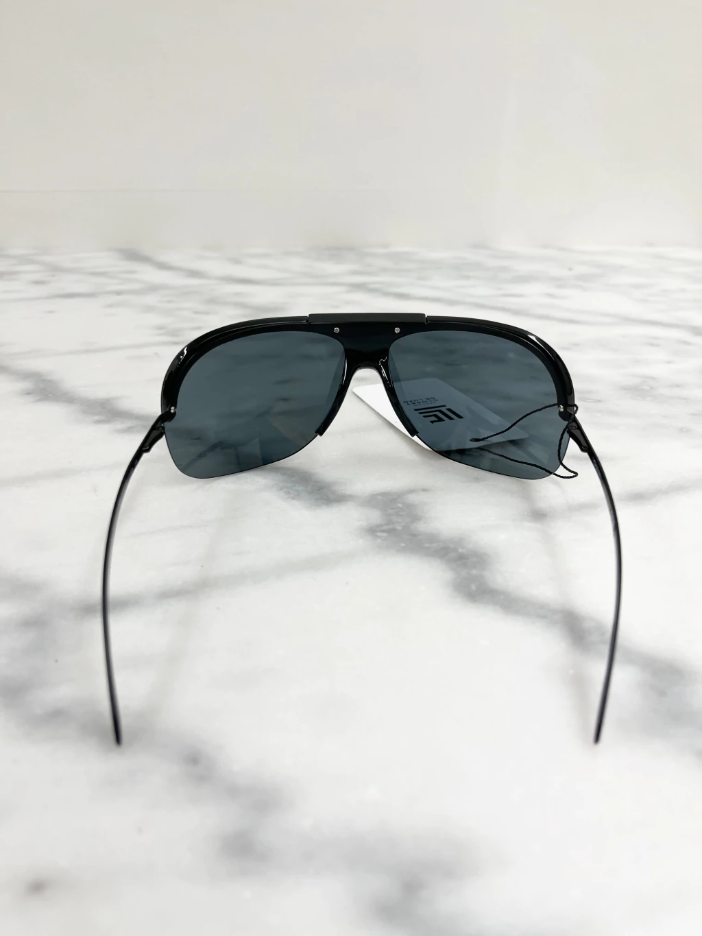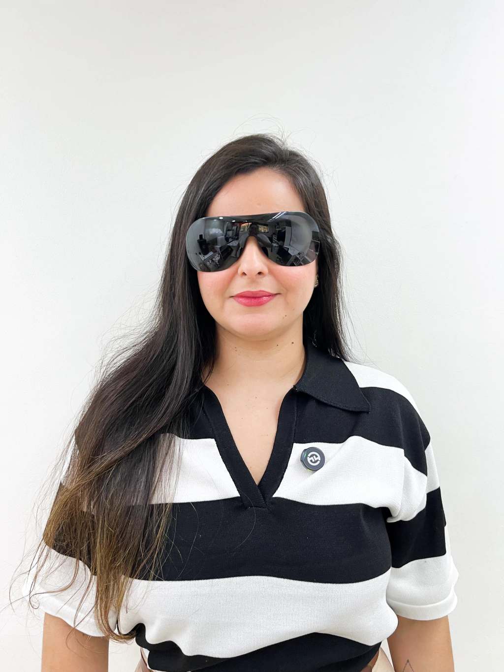 Óculos Chanel Shield Aviator de acetato preto, logo nas bordas e nas hastes, lentes pretas e ferragens prateadas.
