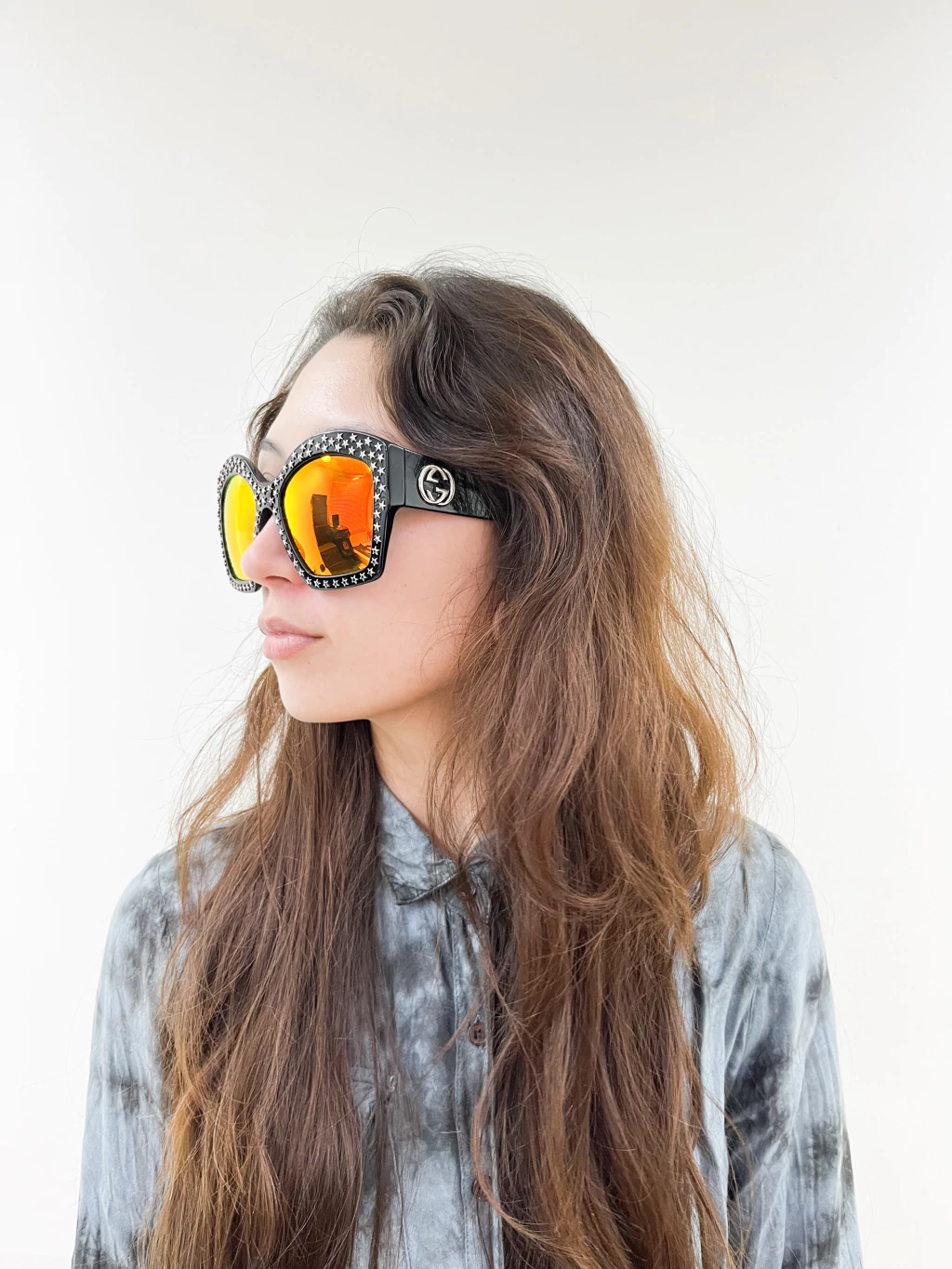 Óculos Gucci Interlocking Star Studded de acetato na cor preta, aplicações de studs em formato de estrelinhas, logo nas bordas e nas hastes, lentes cromadas alaranjadas e ferragens prateadas.