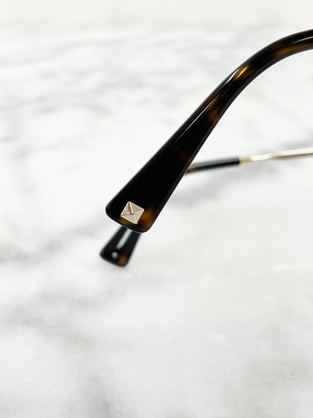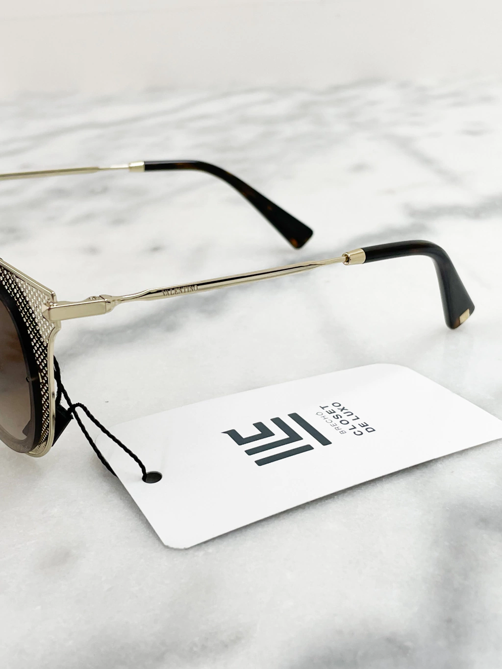 Óculos Valentino Aviador Perforated com armação de metal dourado perfurada, lentes marrons, logos no começo das hastes e studs na ponta das hastes.